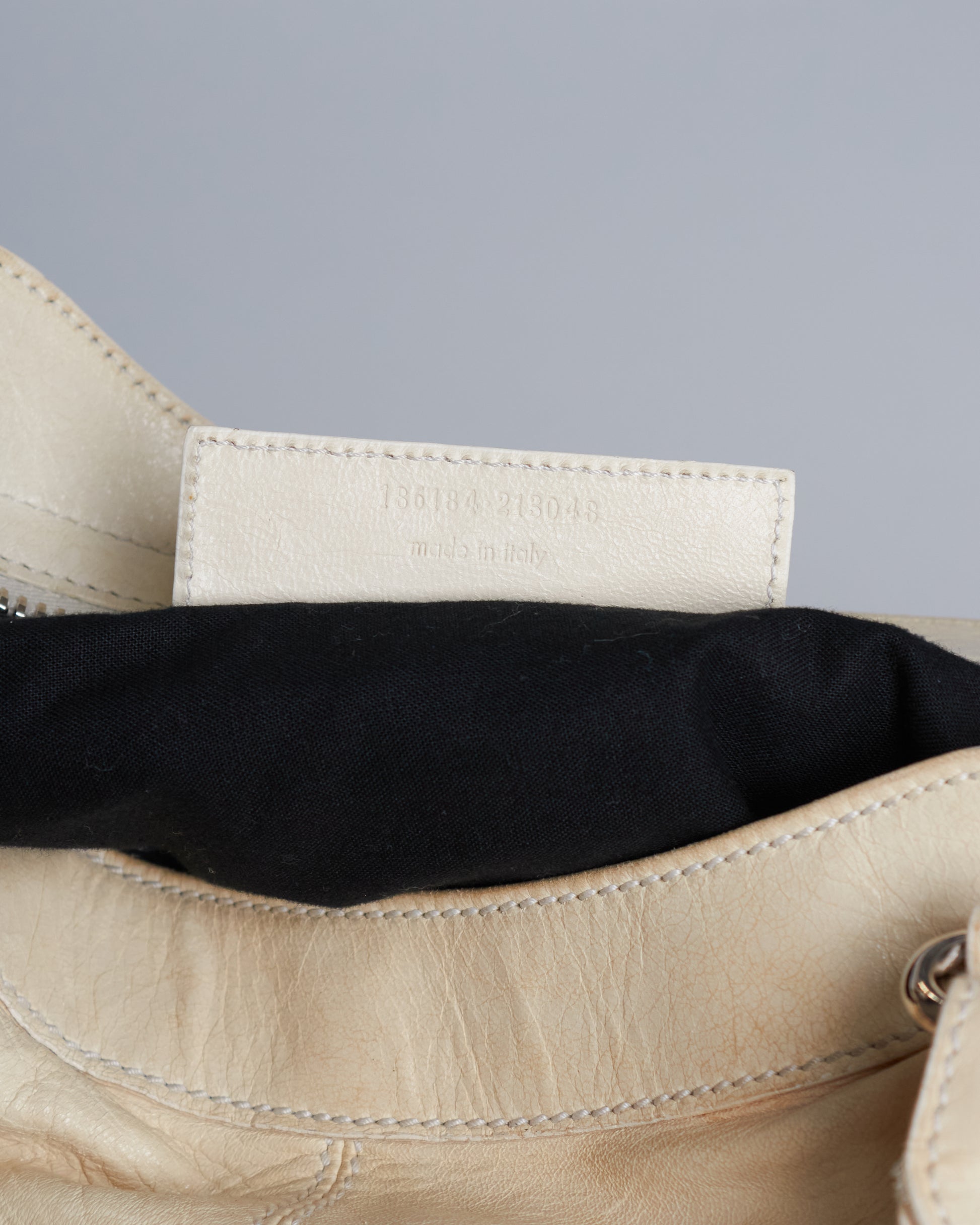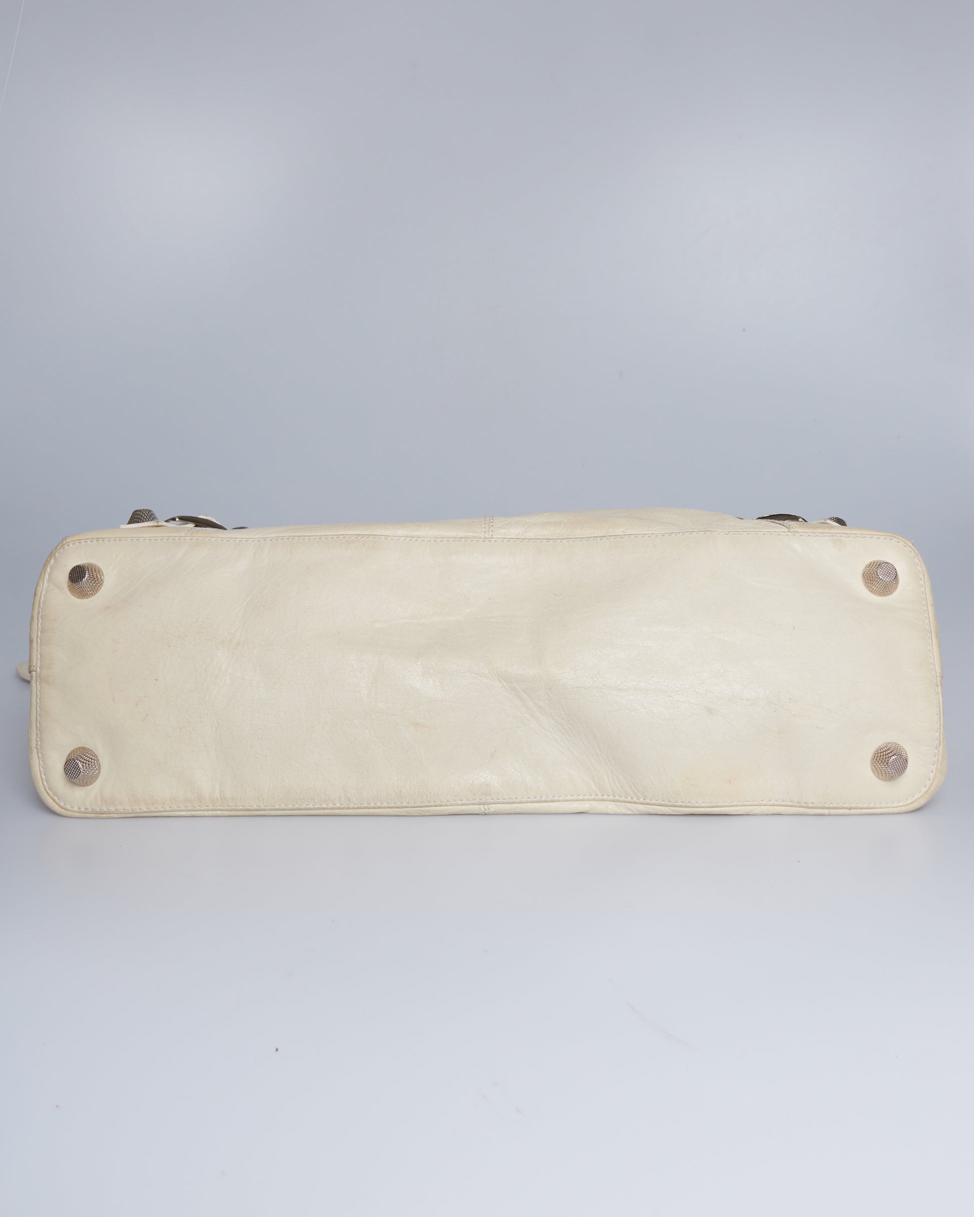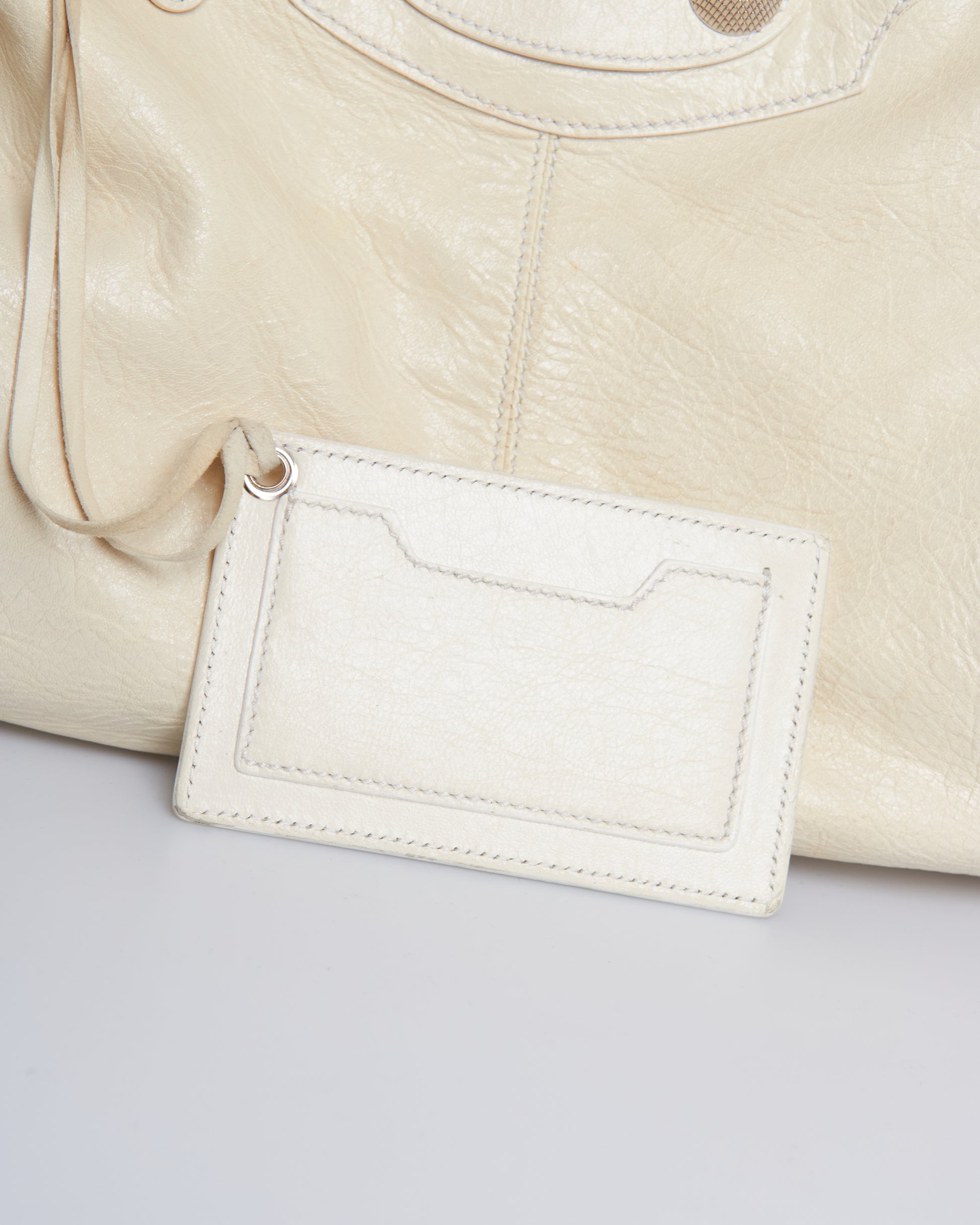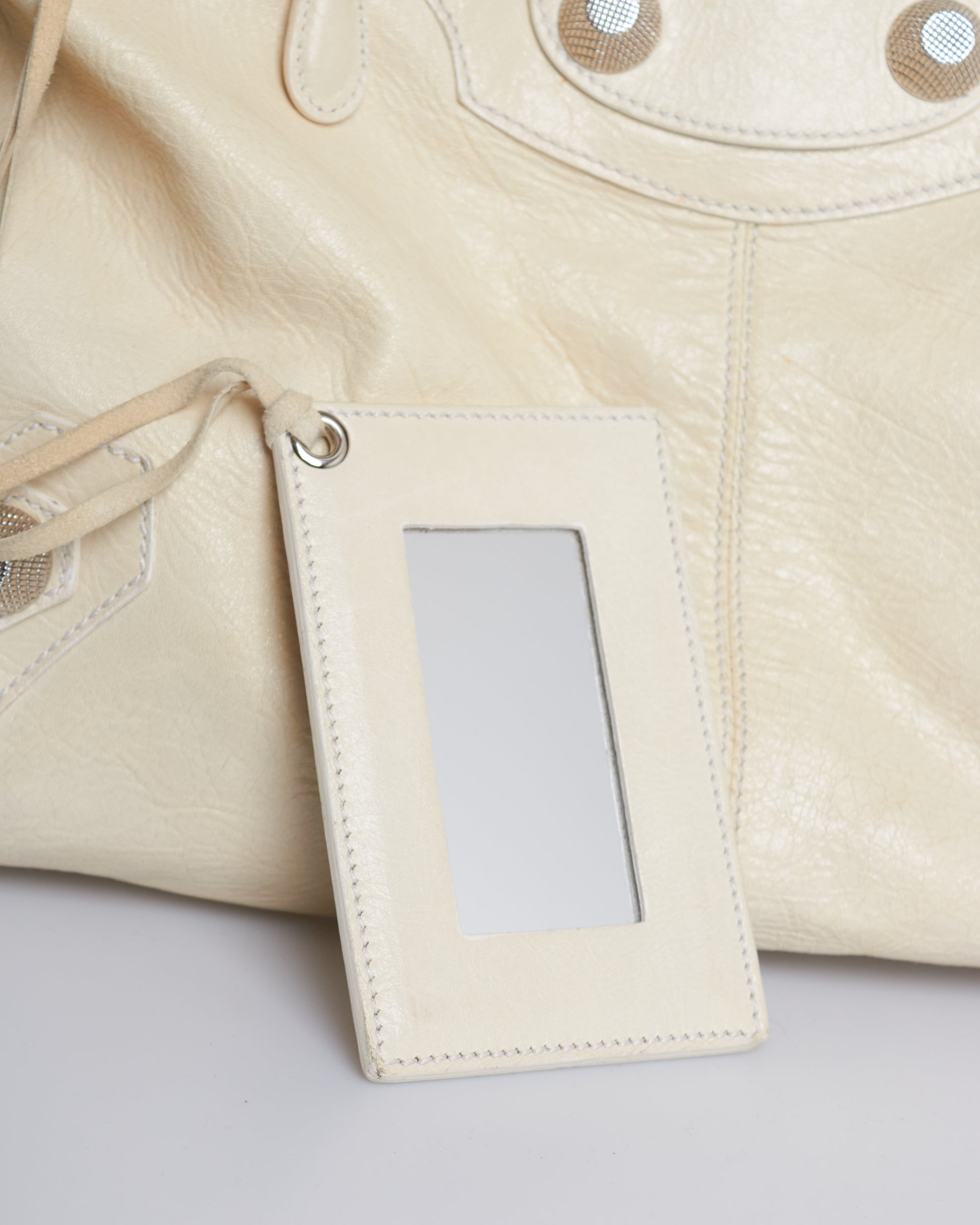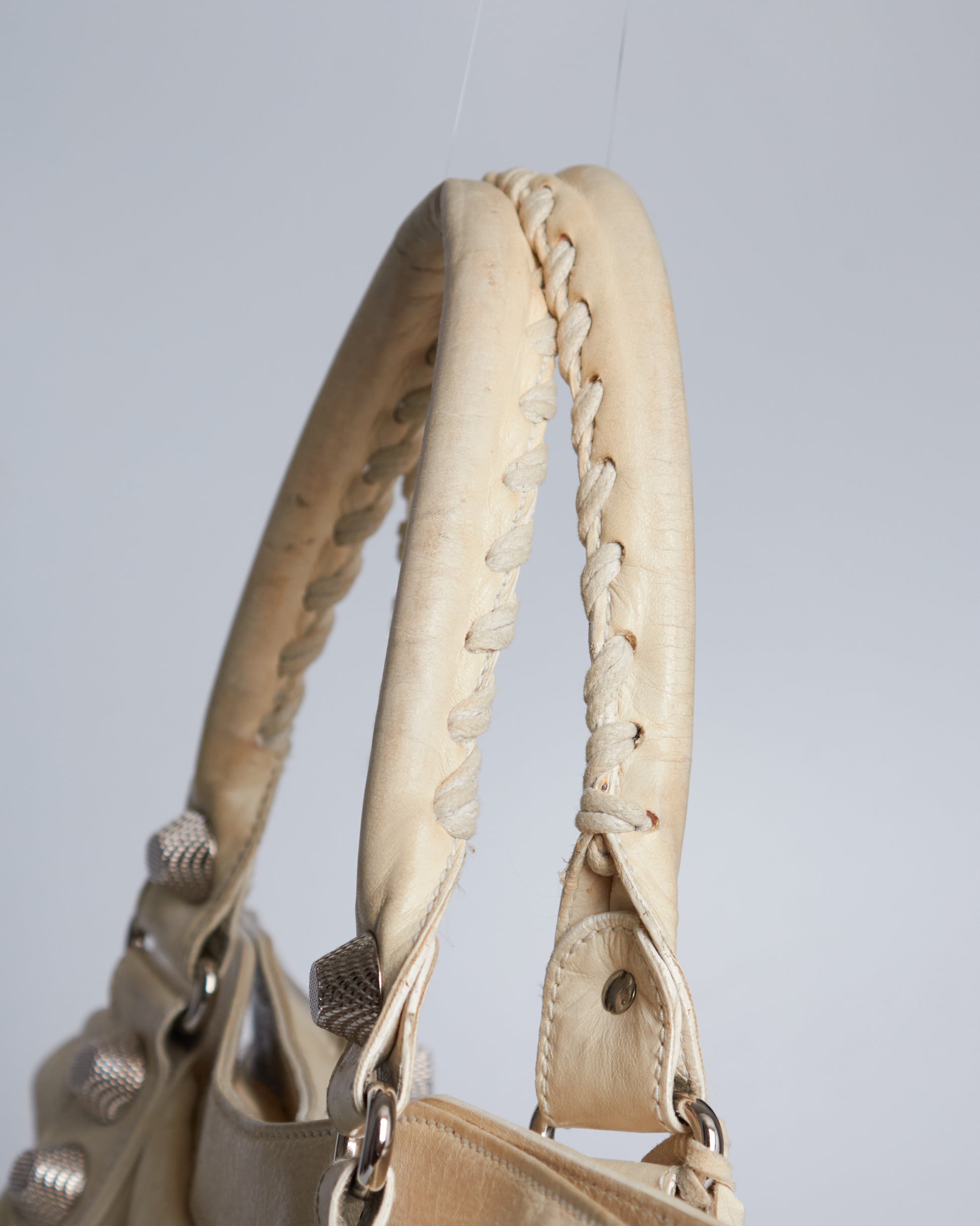 This timeless Balenciaga city bag has a chic shape that is made of distressed white lambskin leather with nice stud details.