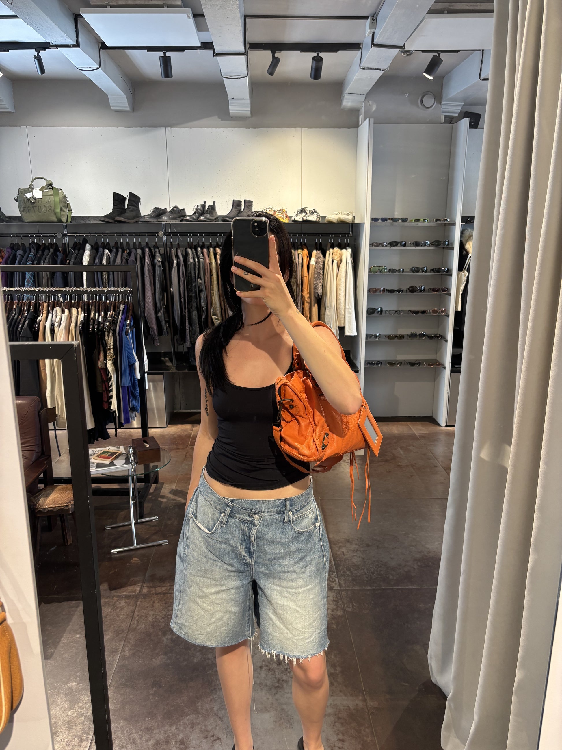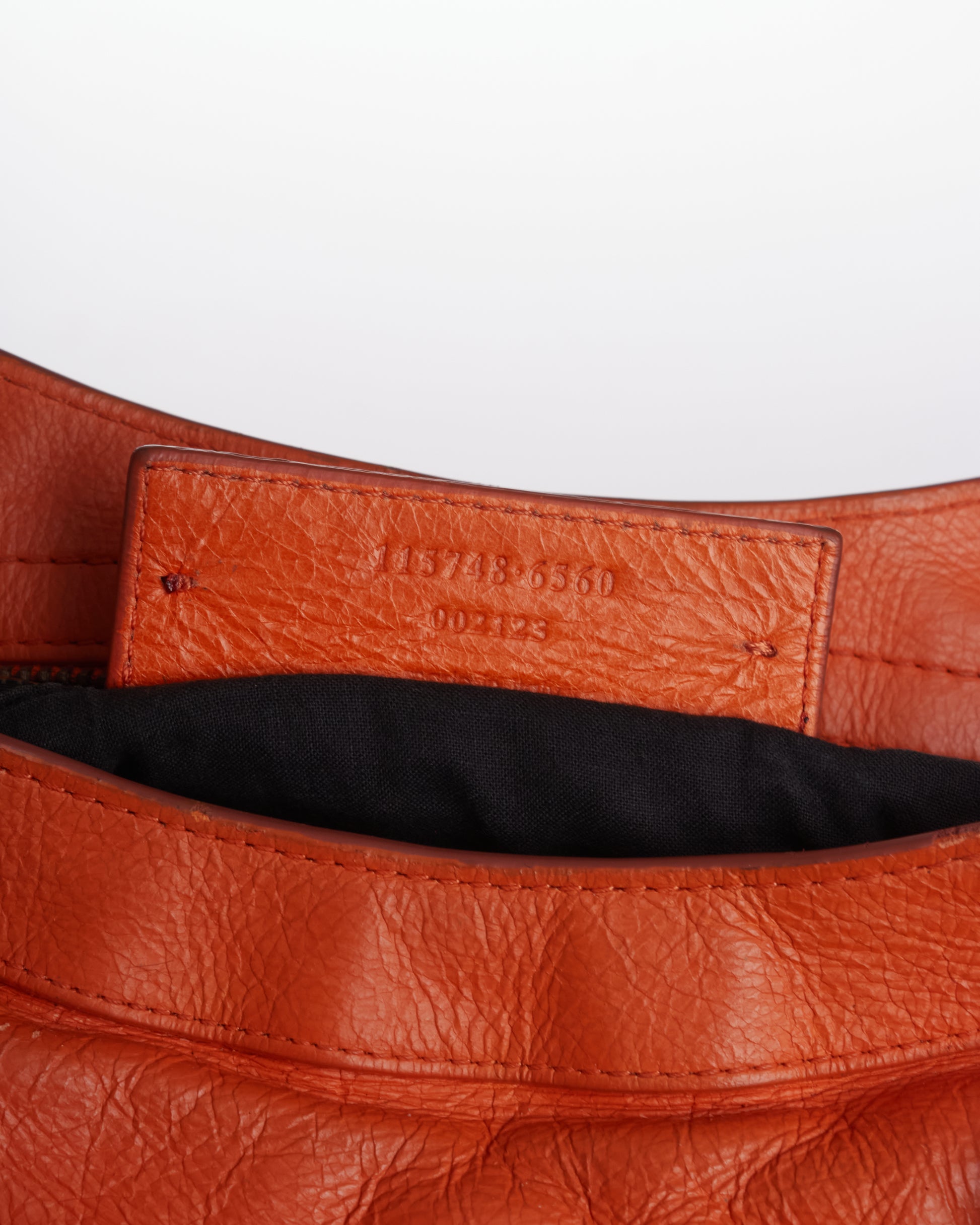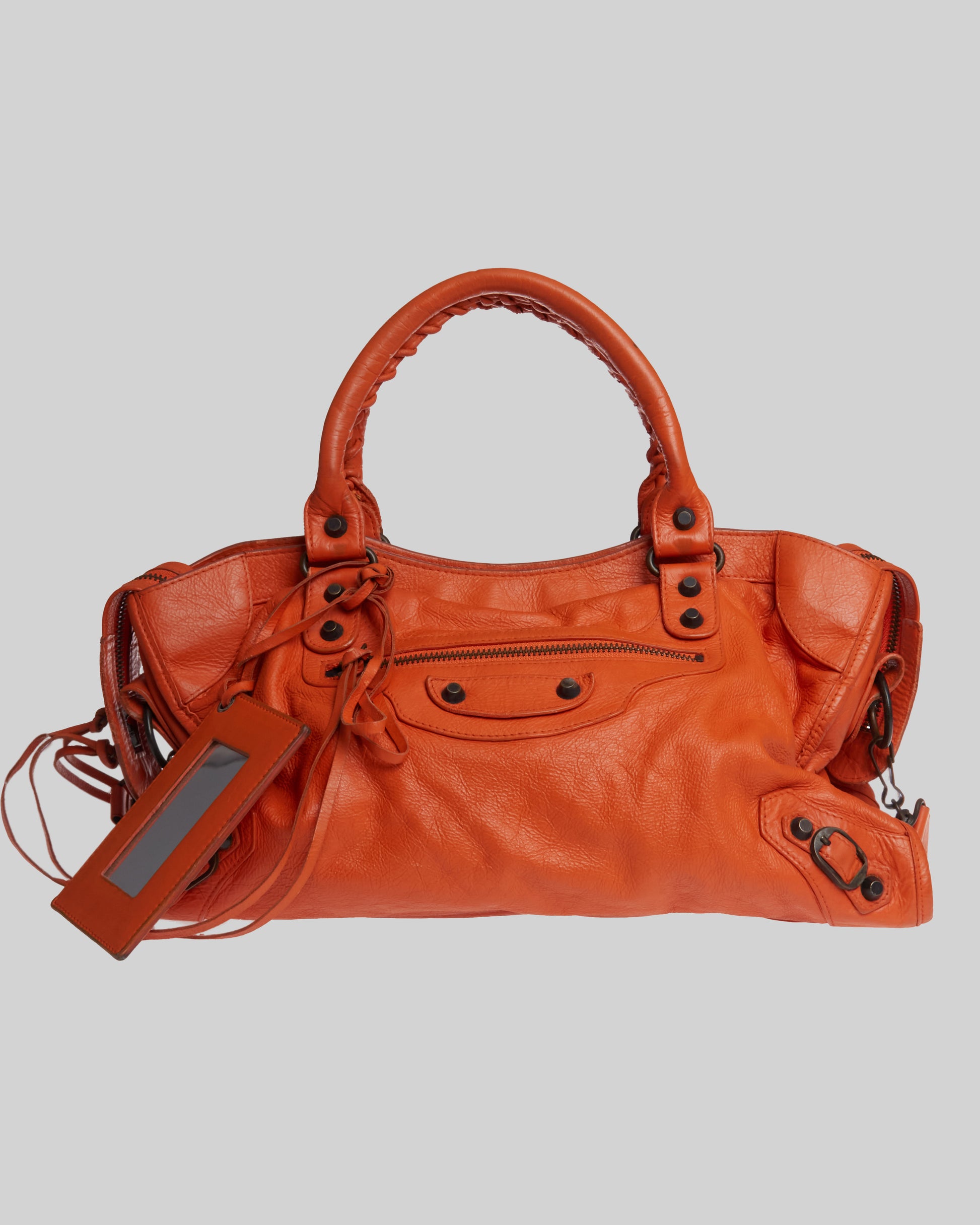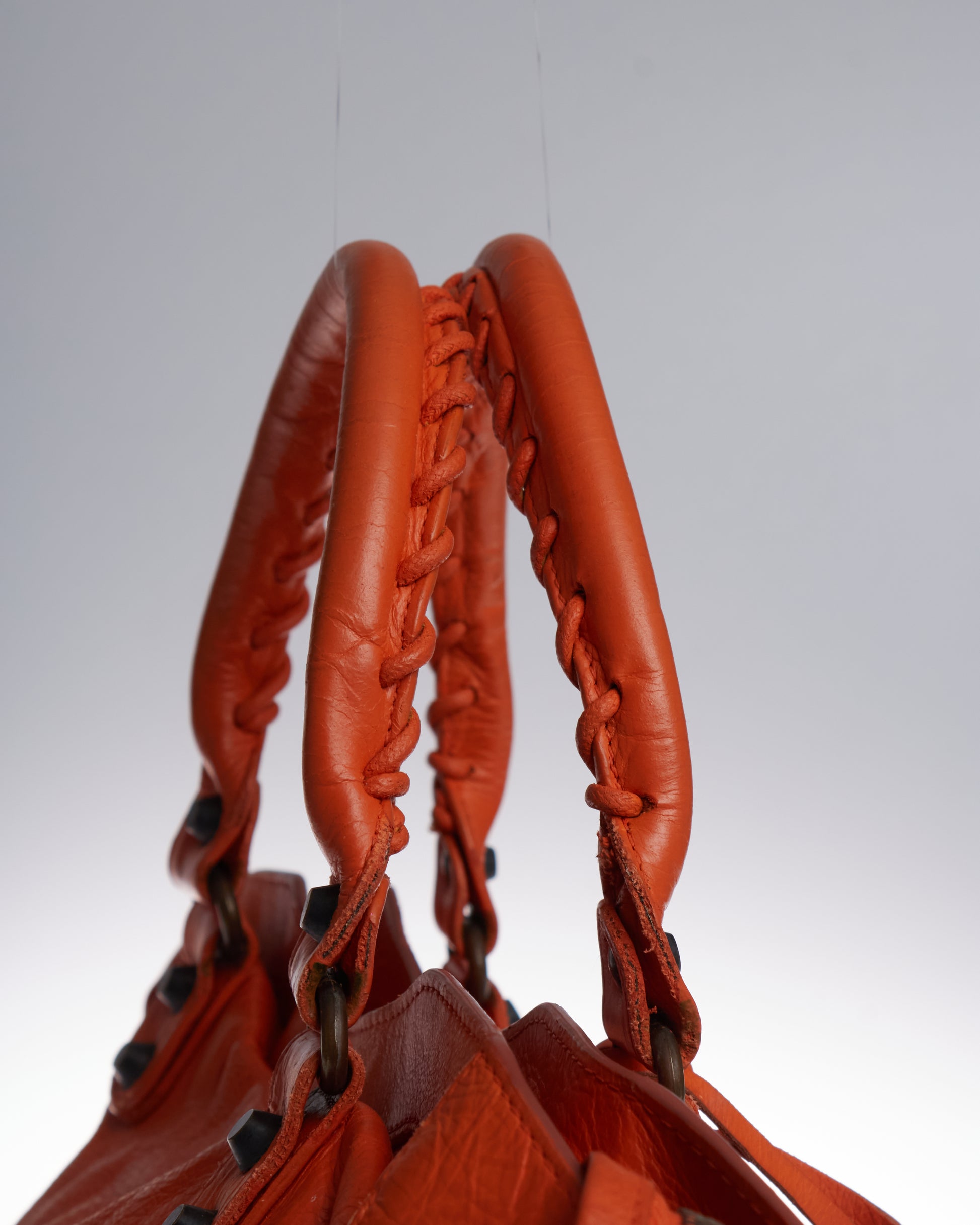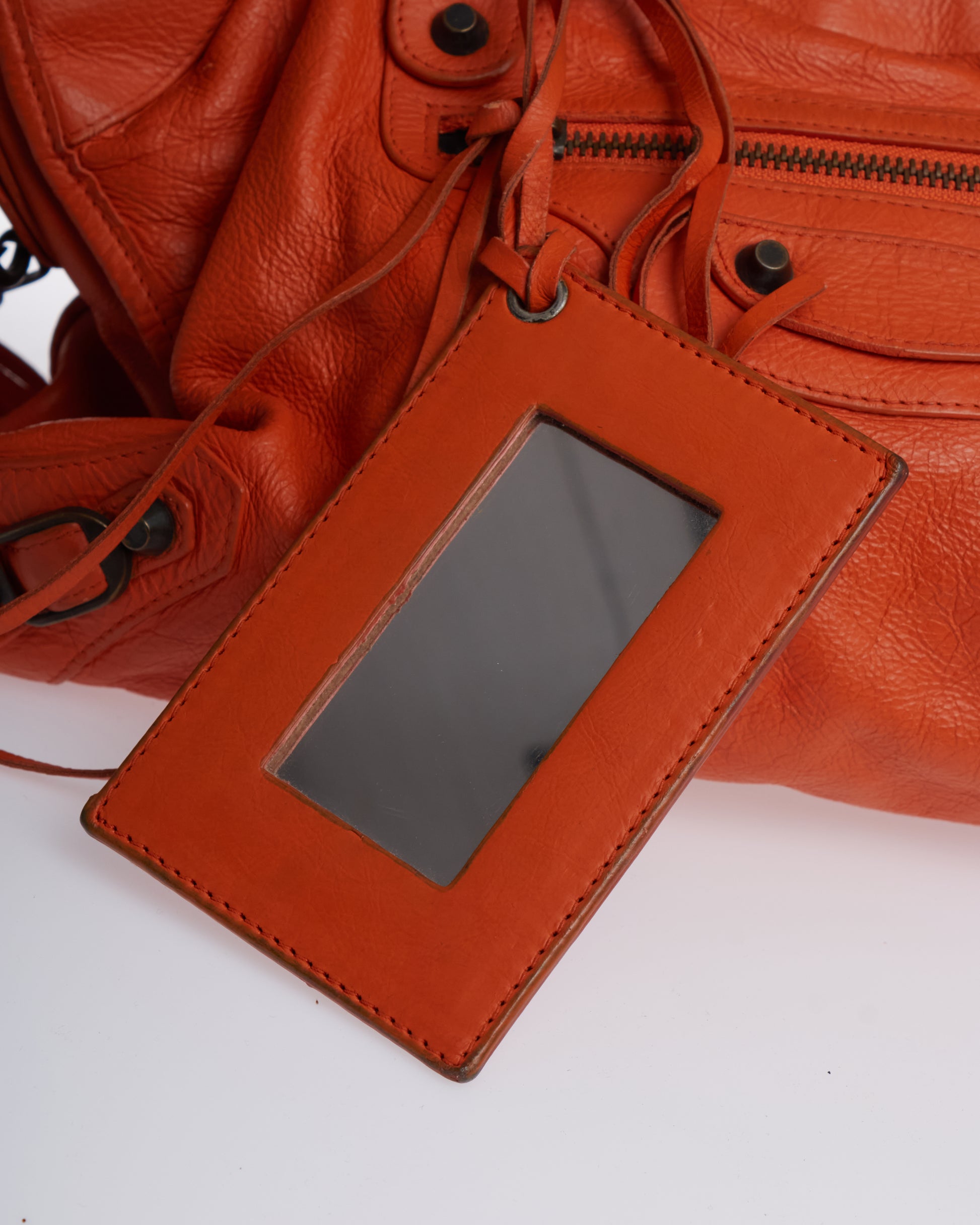 This Balenciaga City bag in orange has a chic shape that is made of distressed lambskin leather with nice stud and tassel details. It can be worn on the shoulder, in the hand and crossbody.