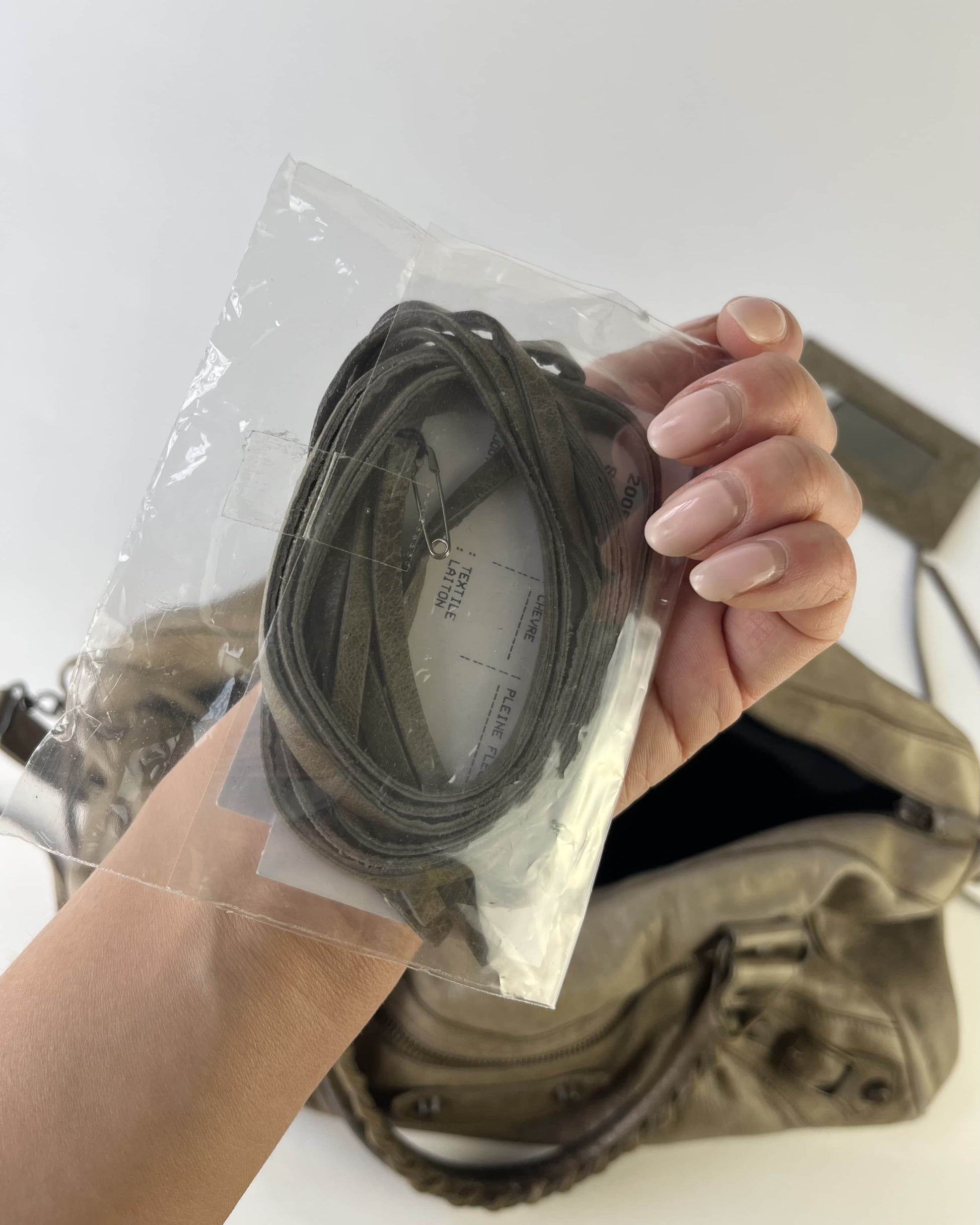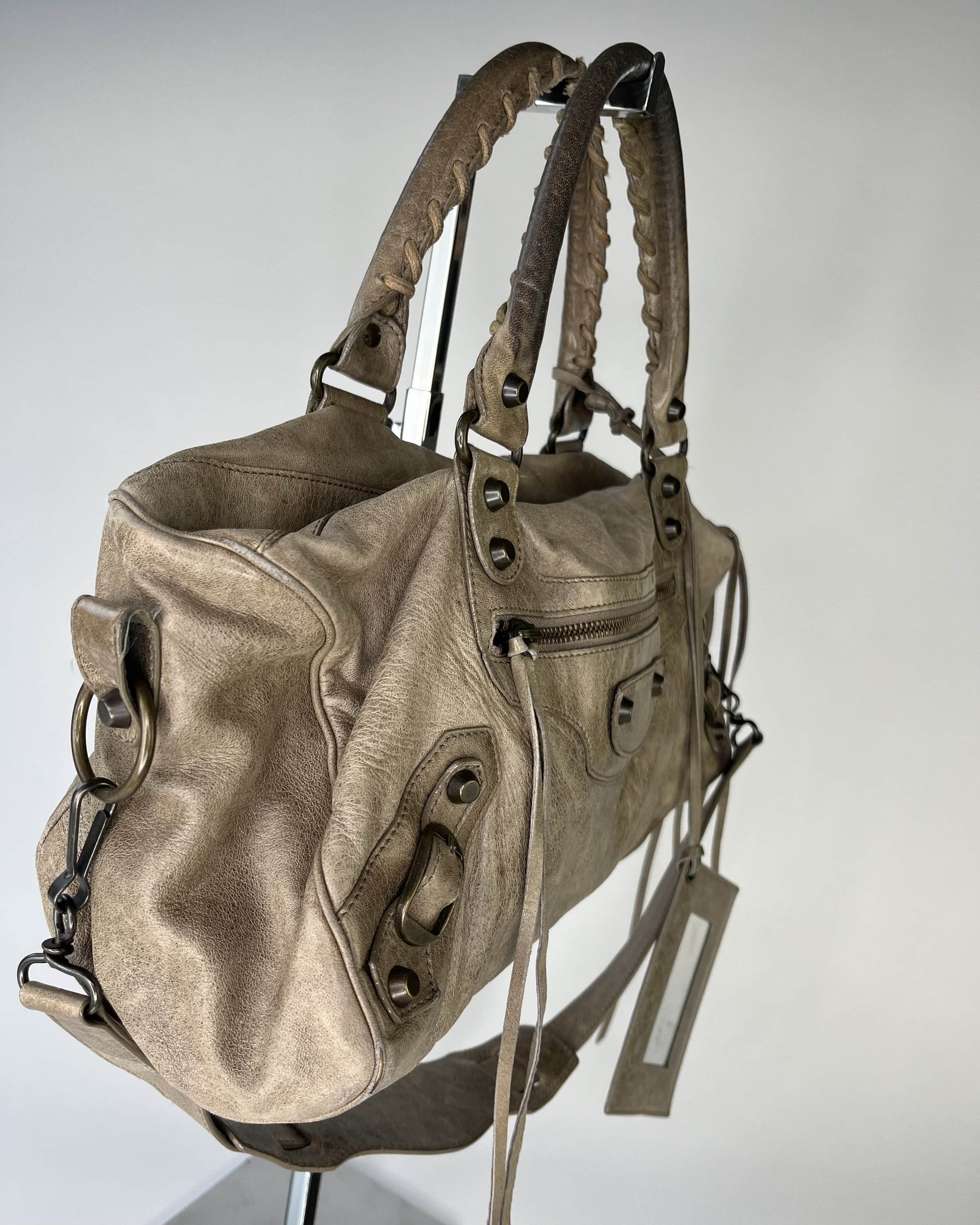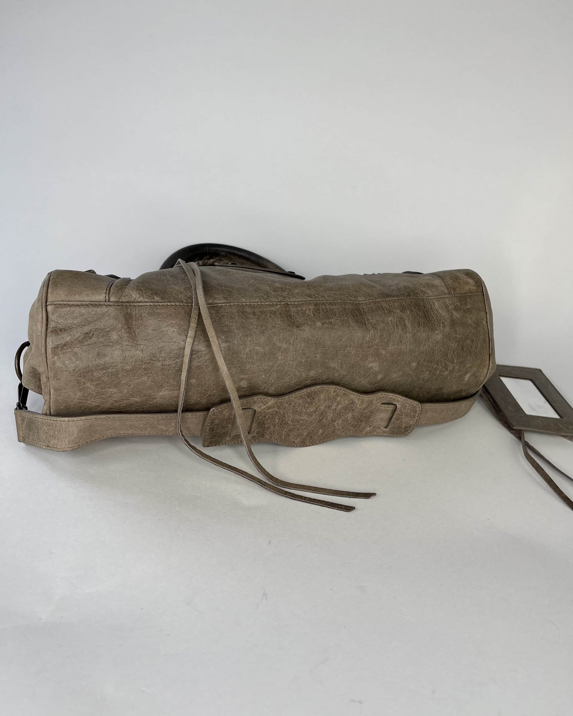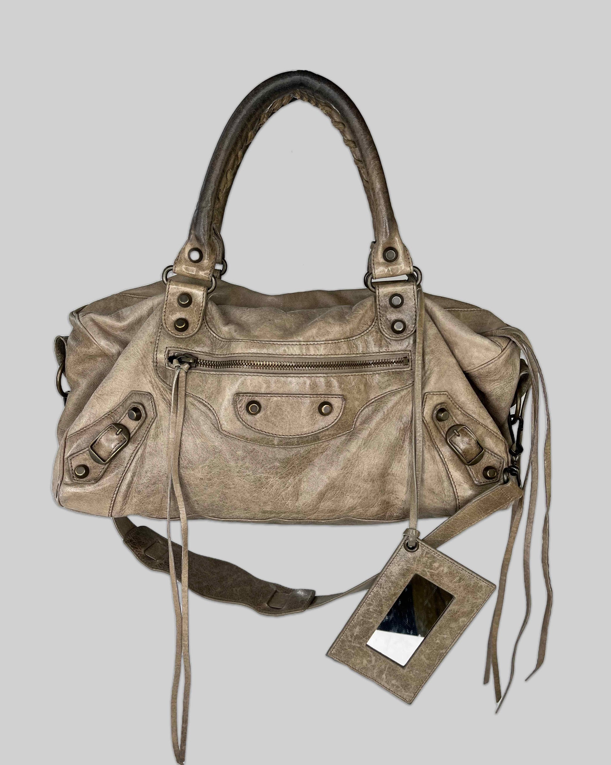 This Balenciaga Twiggy bag in taupe has a chic shape that is made of distressed lambskin leather with nice stud and tassel details. It can be worn on the shoulder, in the hand and crossbody.