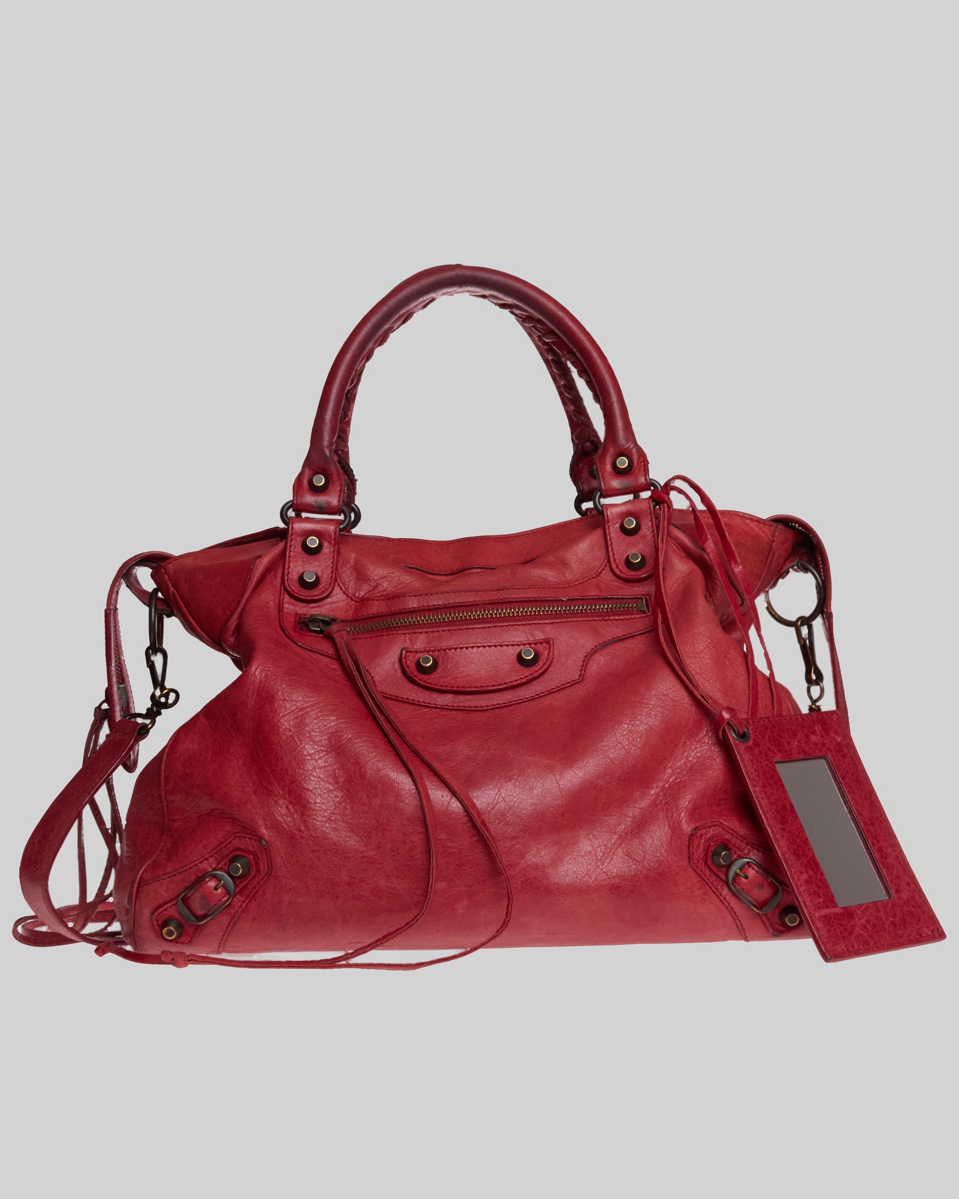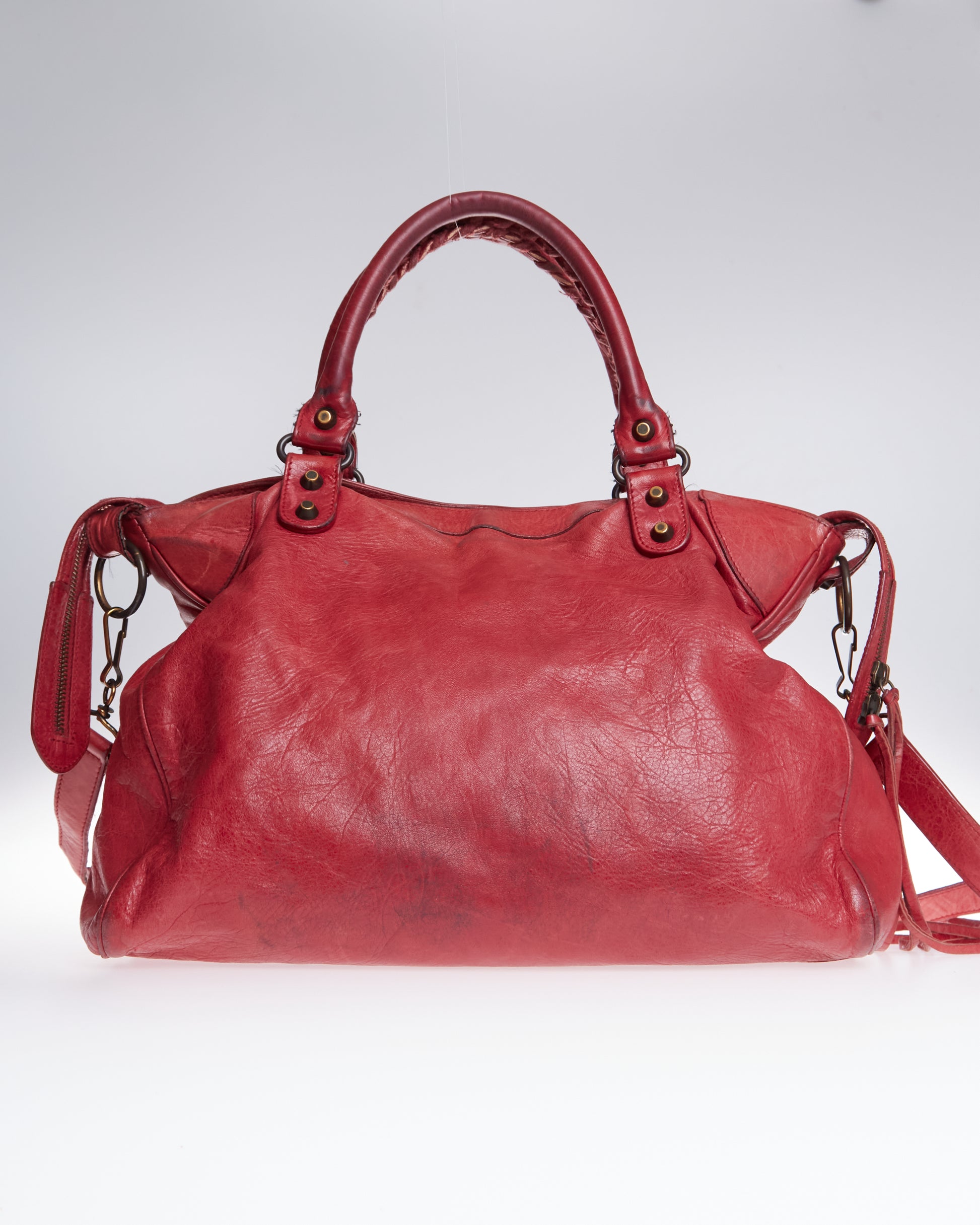 This Balenciaga City bag in pink has a chic shape that is made of distressed lambskin leather with nice stud and tassel details. It can be worn on the shoulder, in the hand and crossbody.