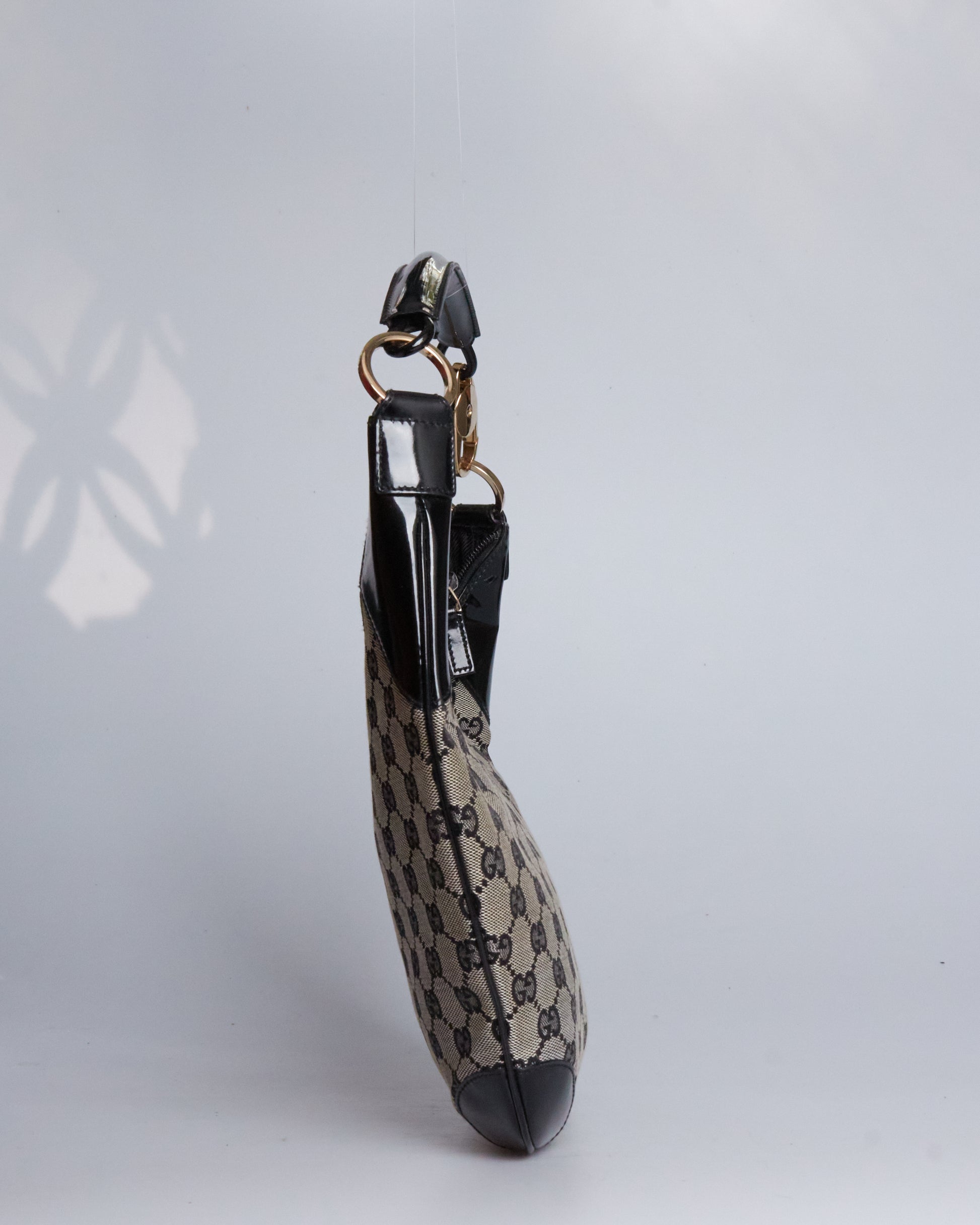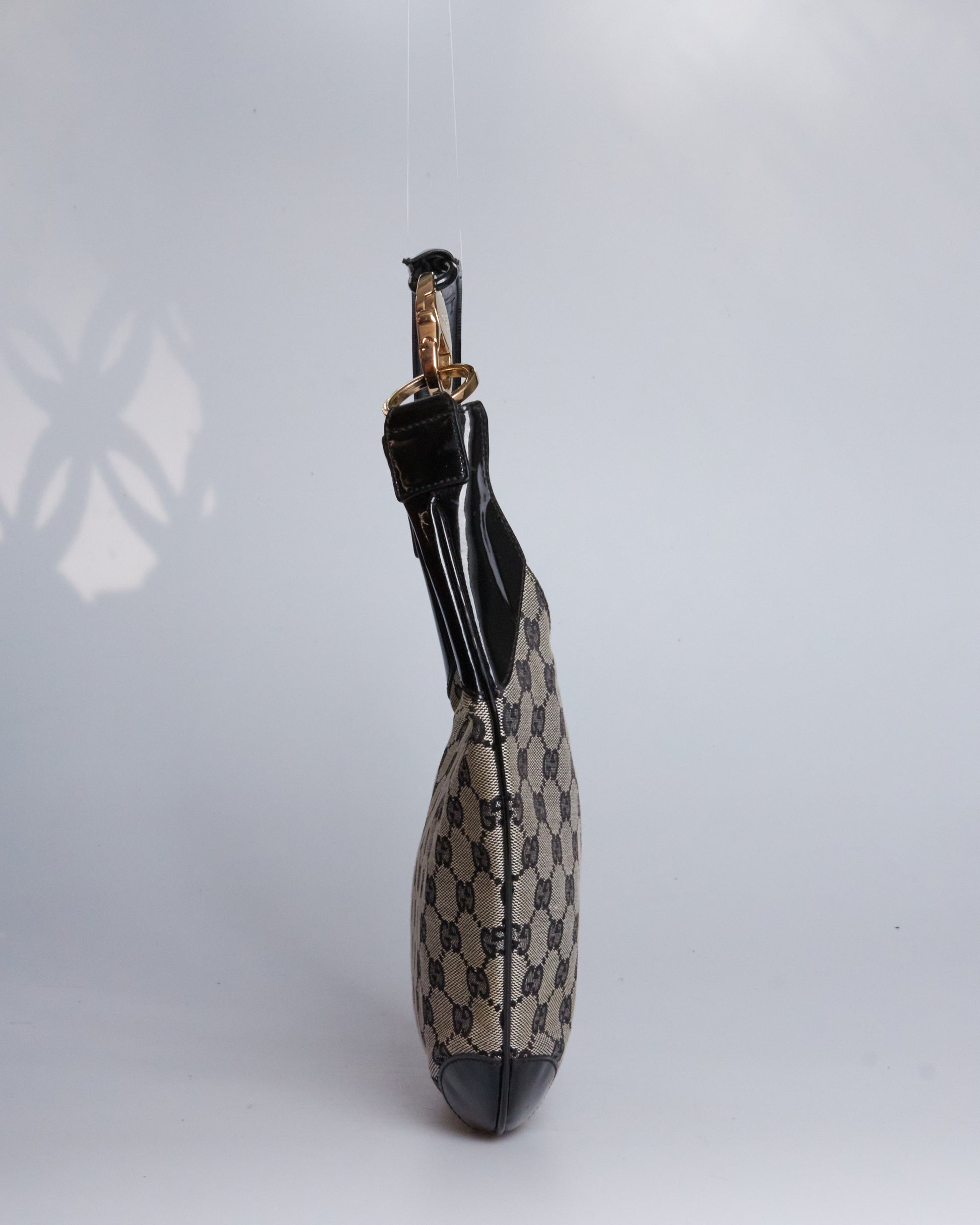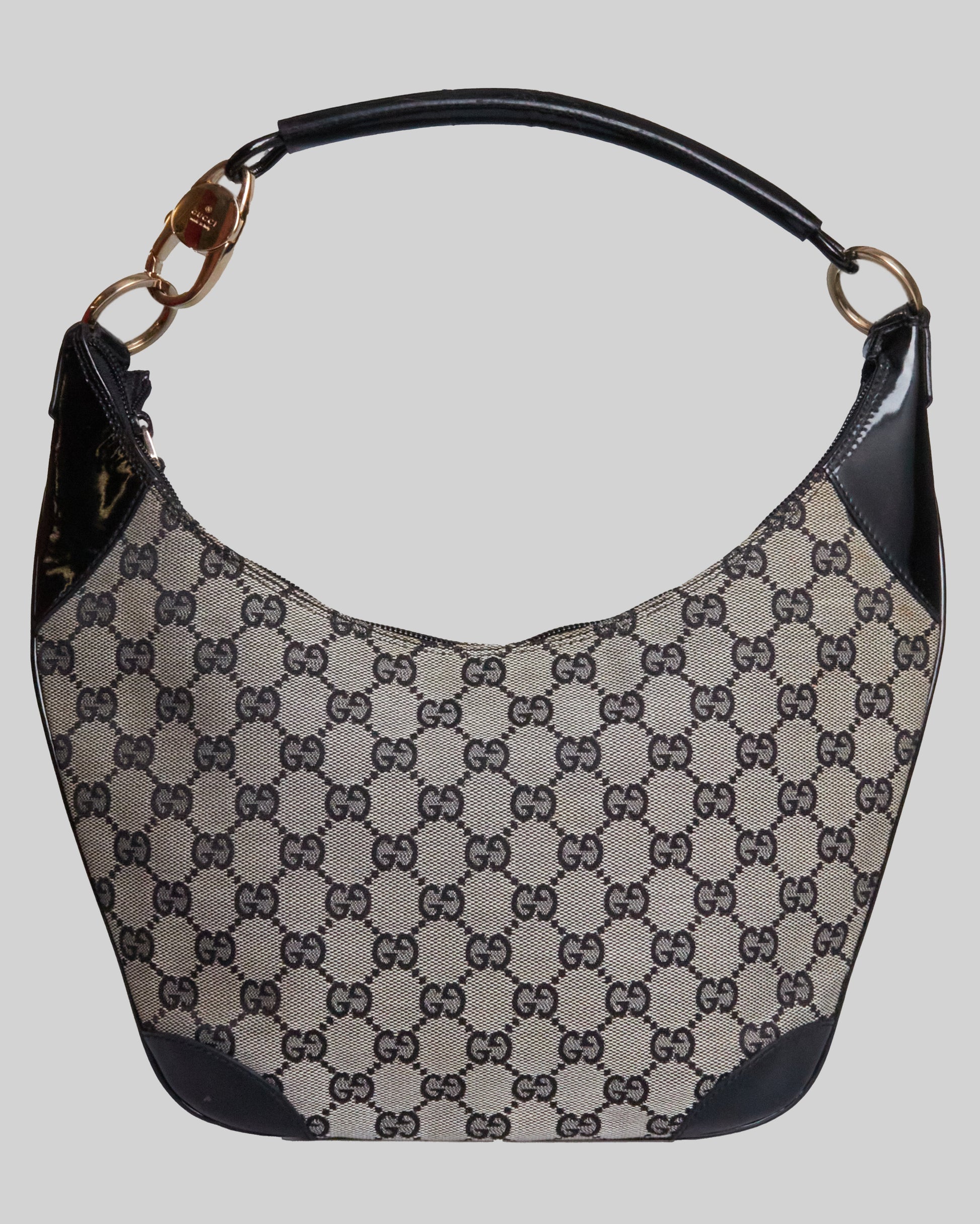 This Gucci shoulderbag has grey/black GG canvas, black leather enamel details and gold-tone hardware.