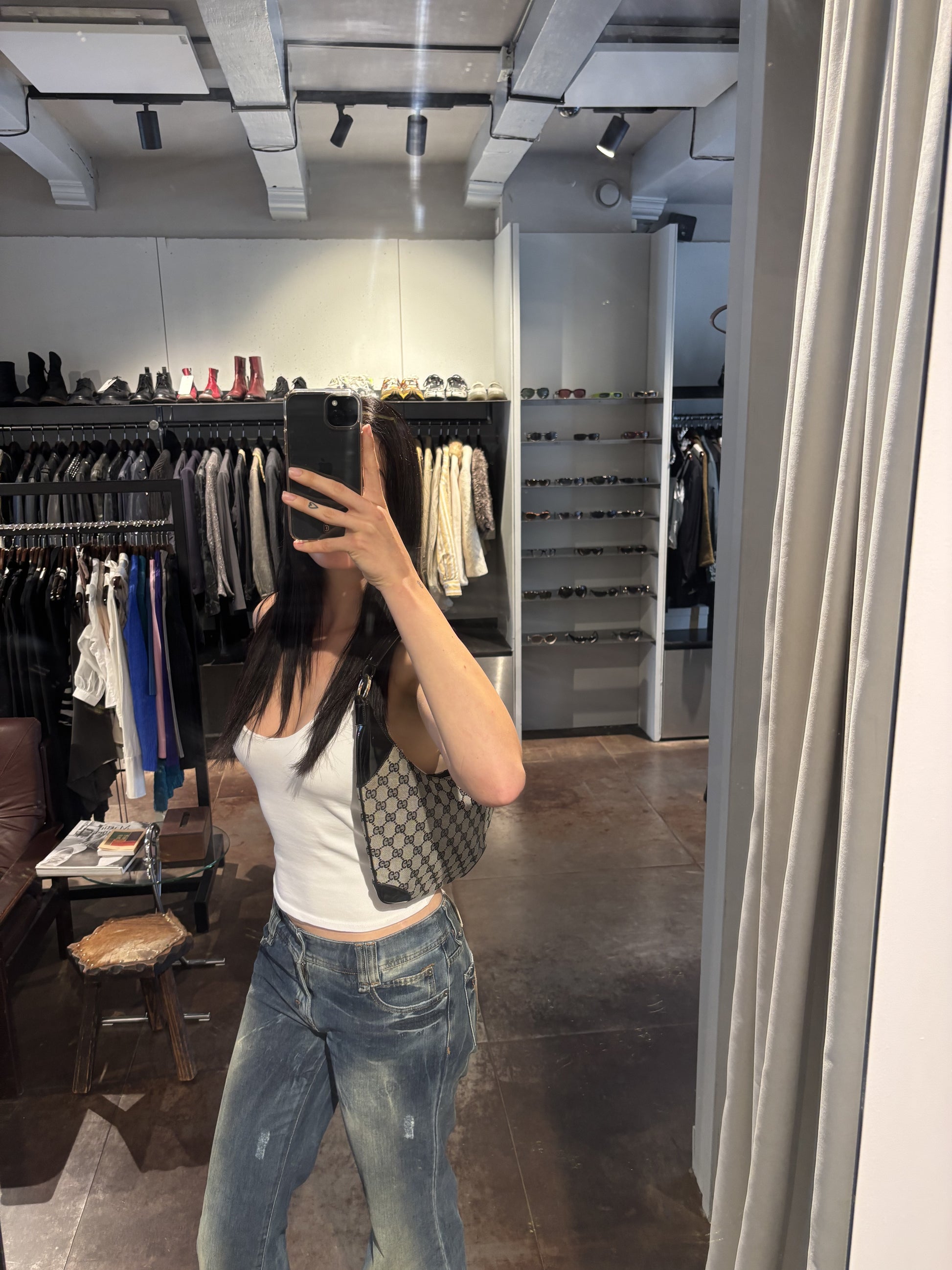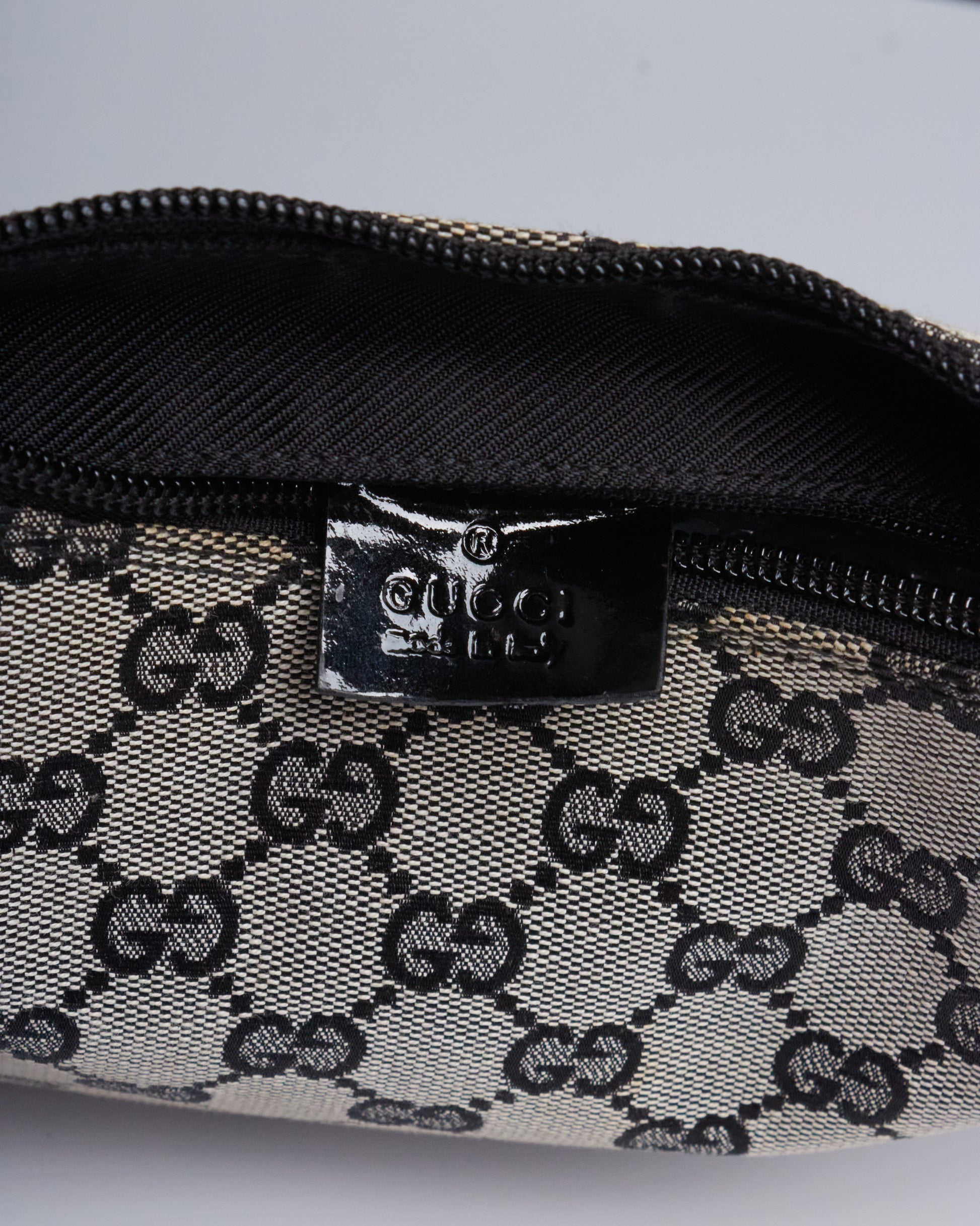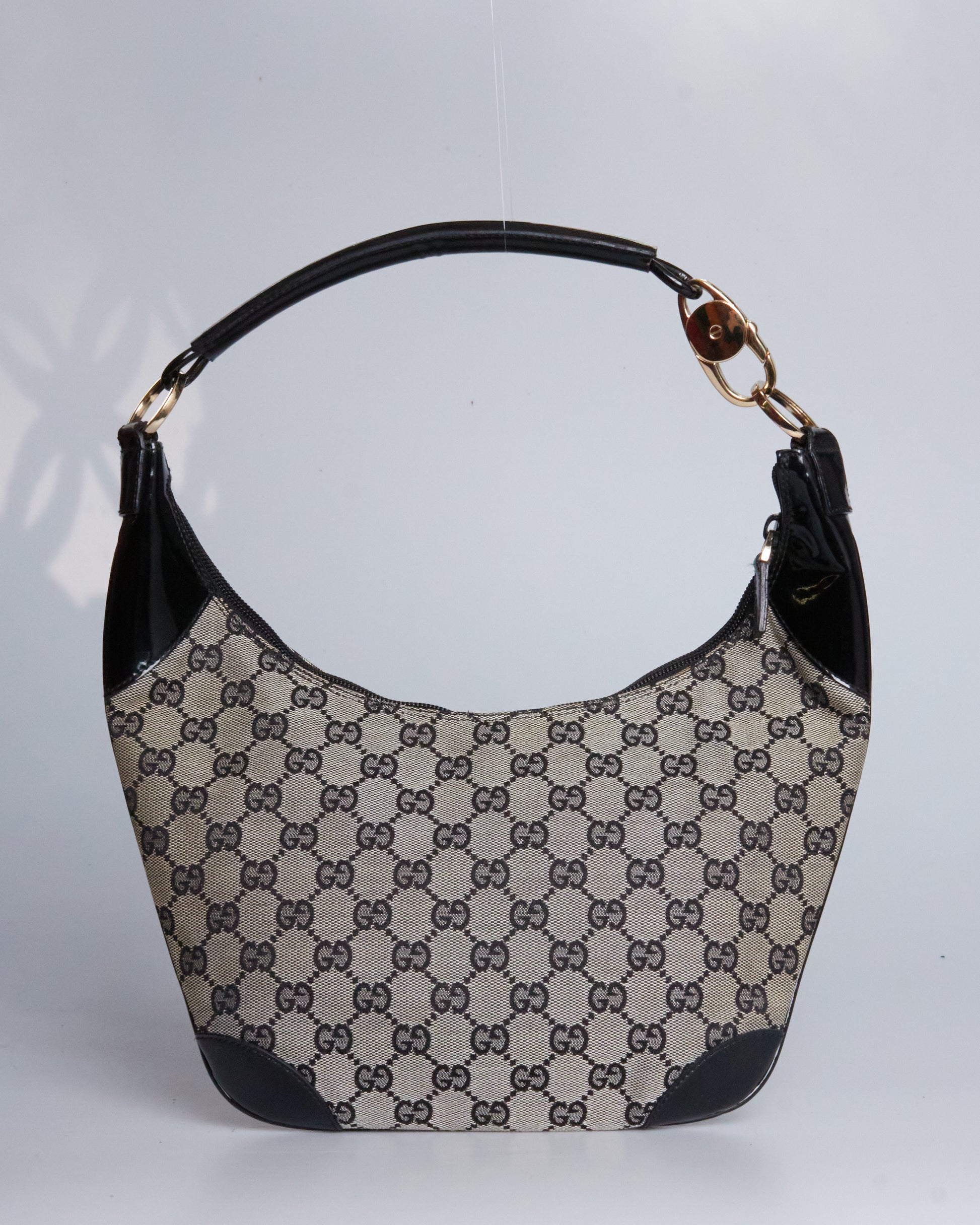This Gucci shoulderbag has grey/black GG canvas, black leather enamel details and gold-tone hardware.