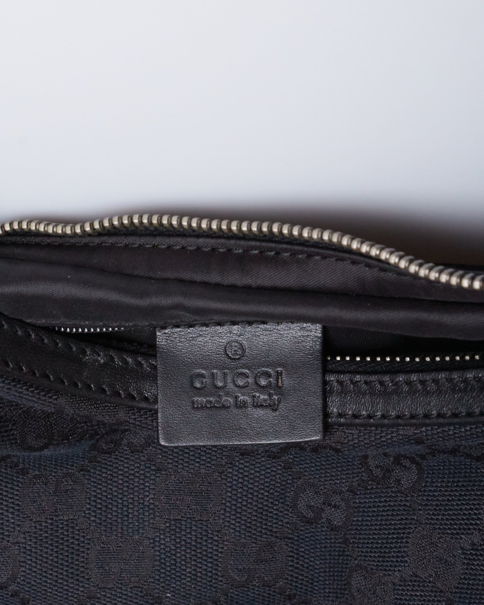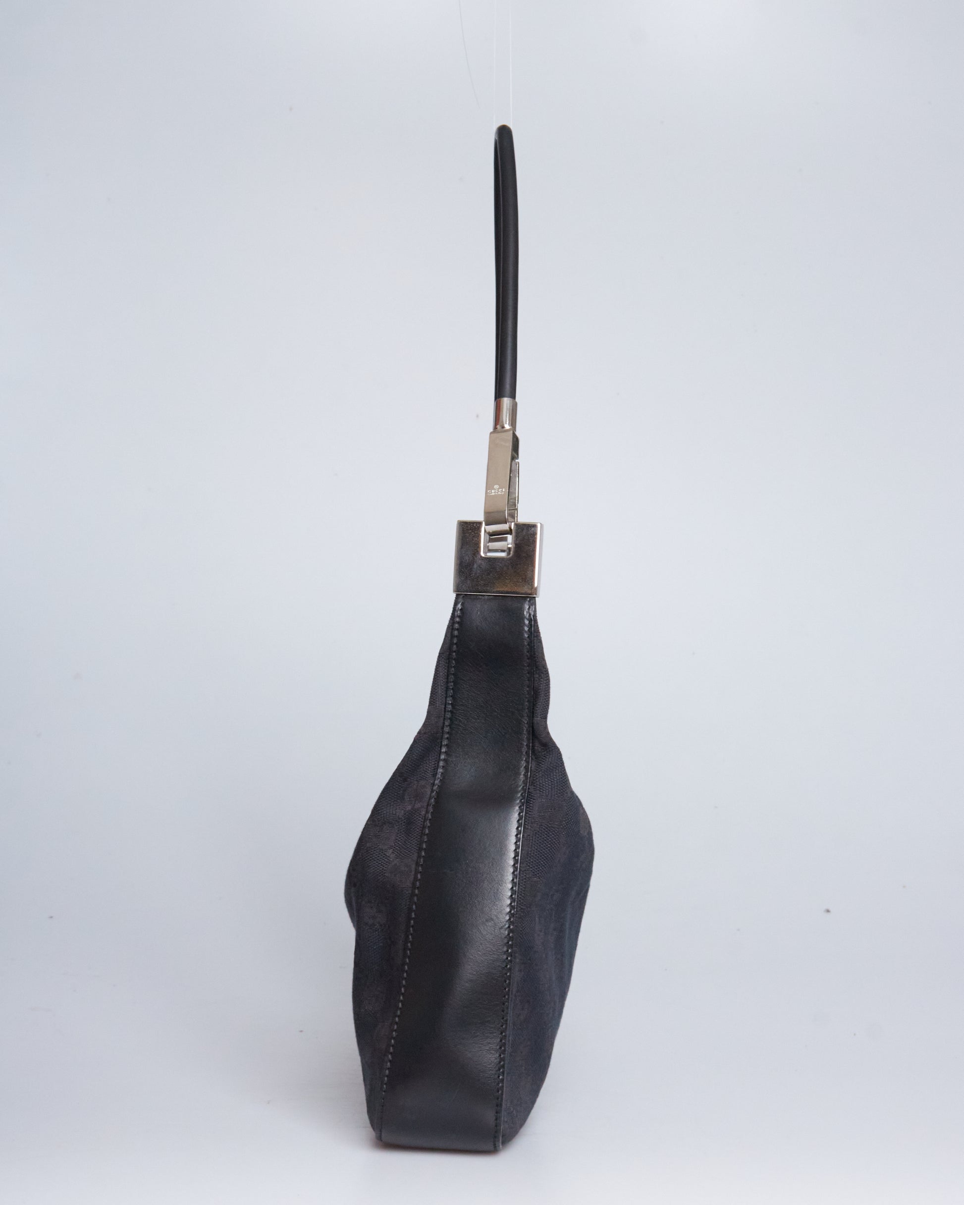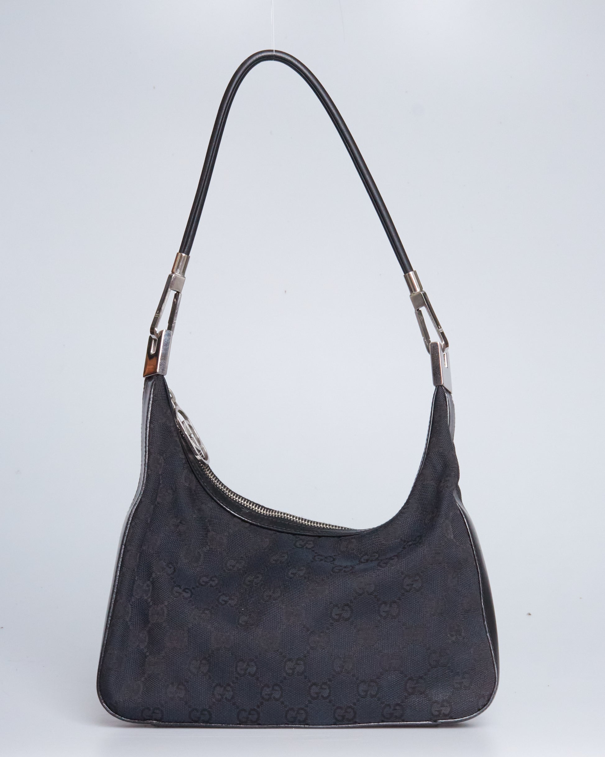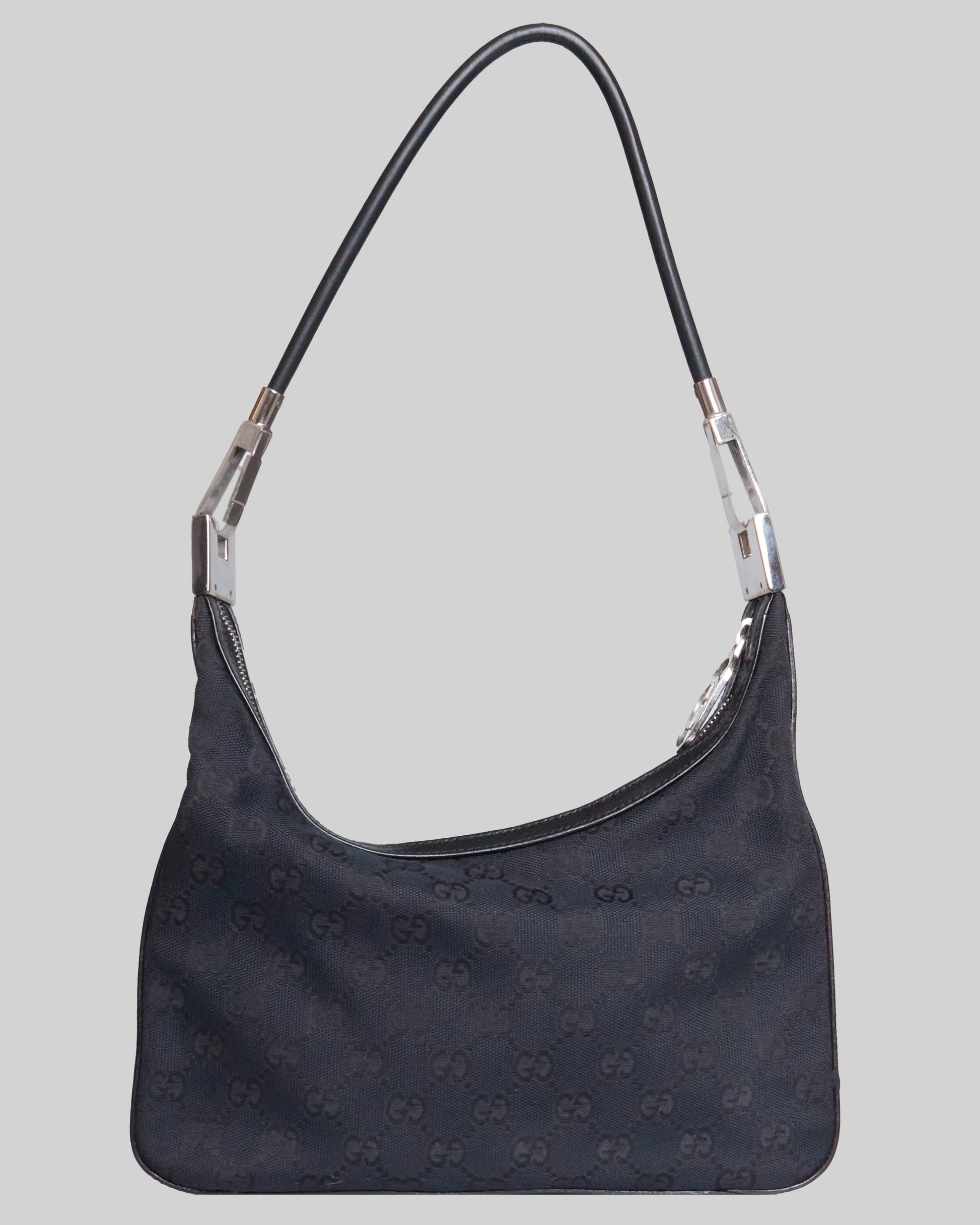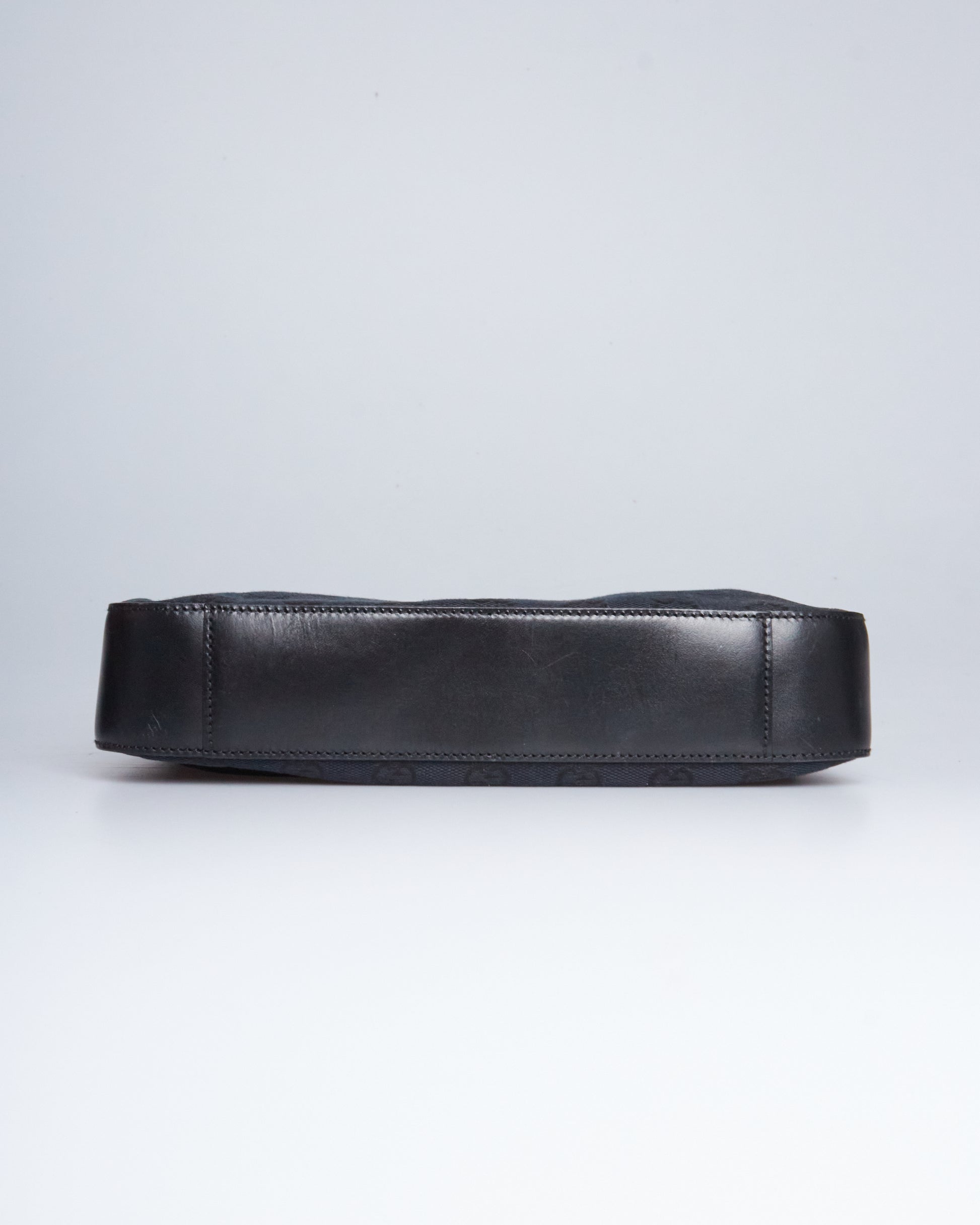 This elegant bag by Tom Ford for Gucci has black GG monogram canvas and has subtle silver-tone hardware on both sides.