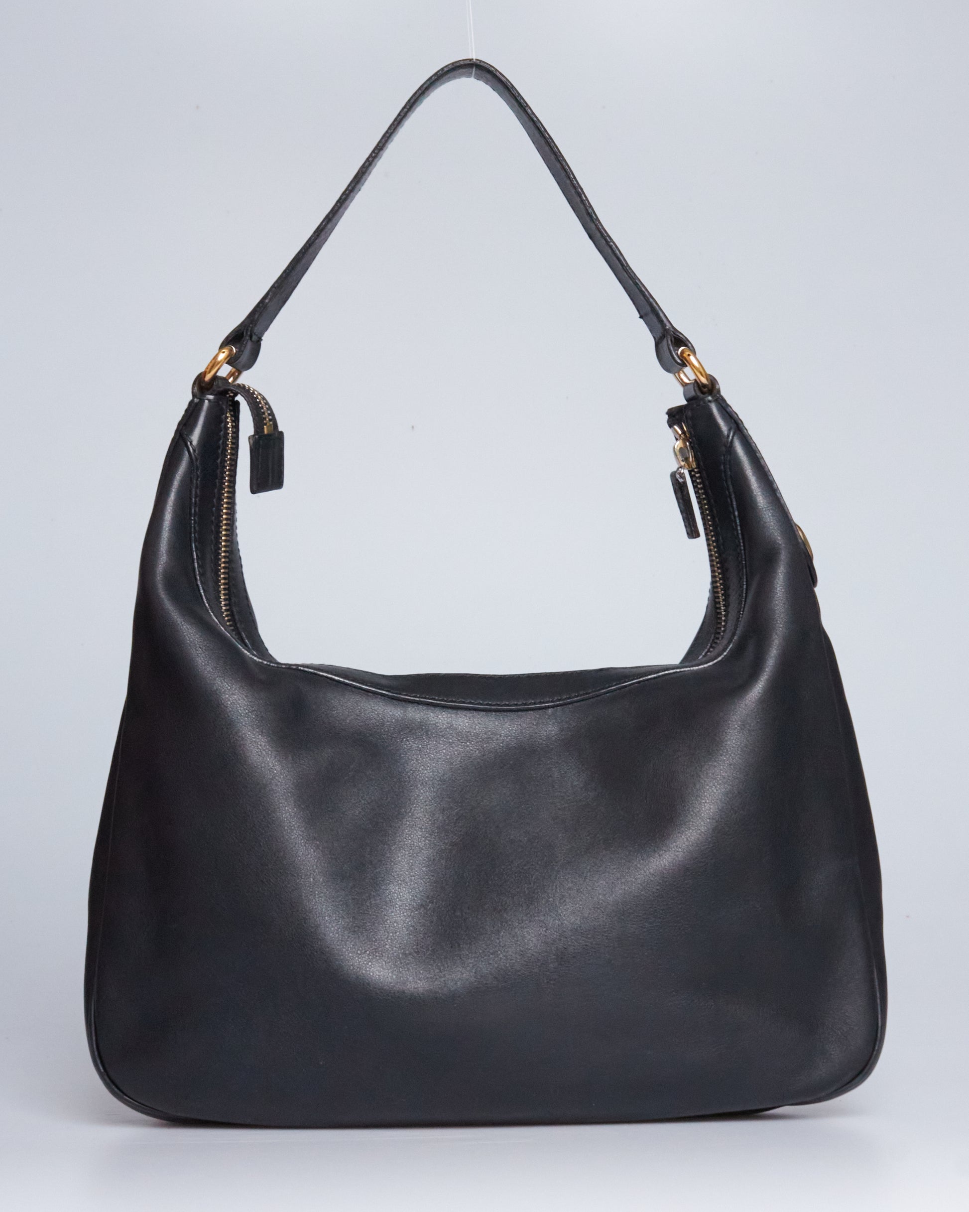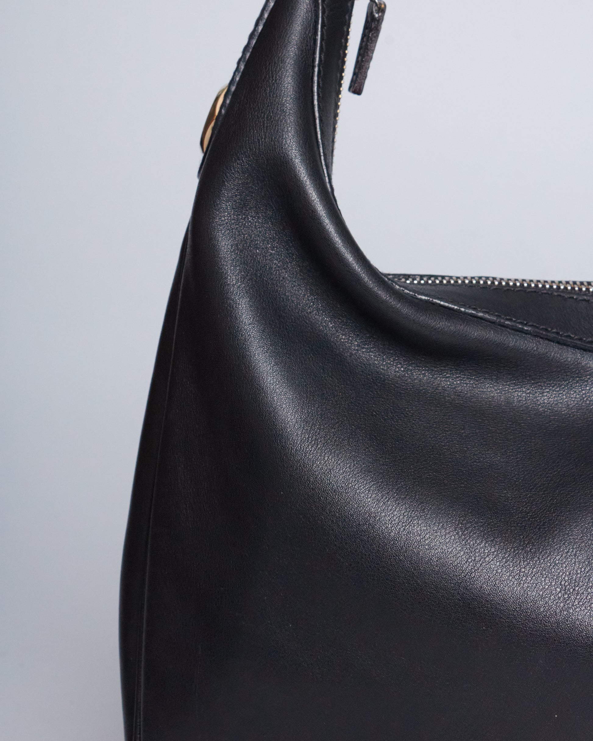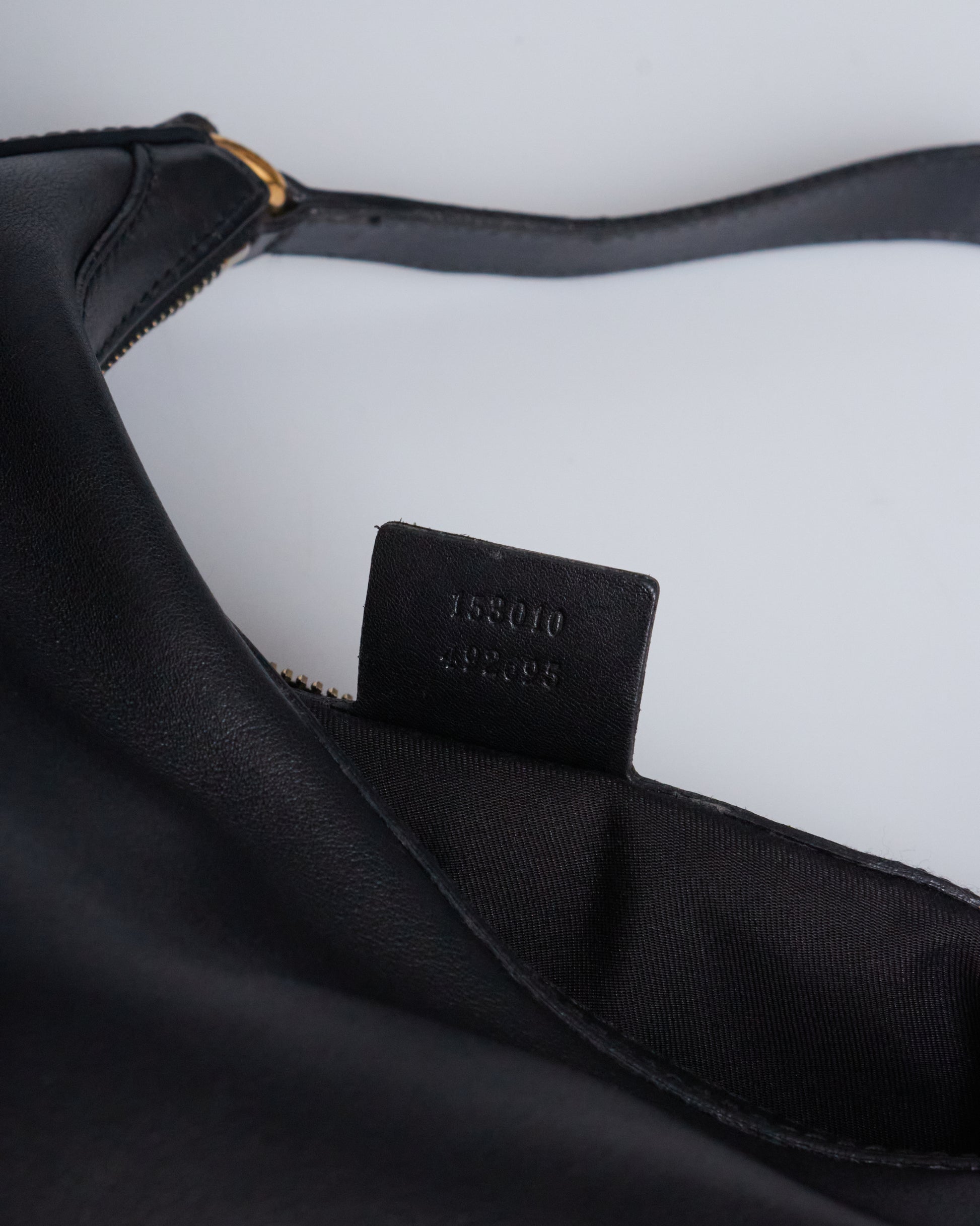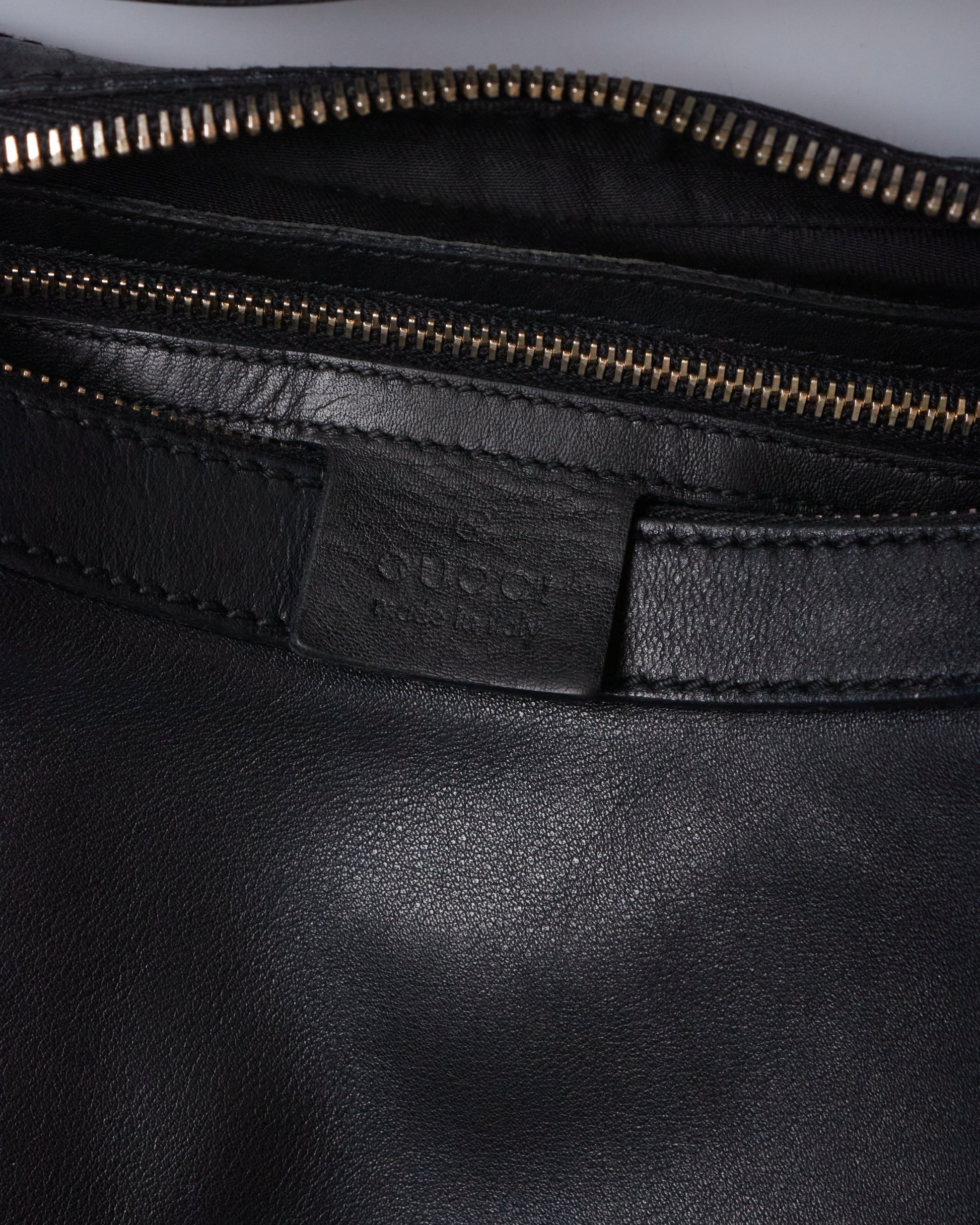 This Gucci hobo cloth handbag has black slouchy leather exterior and gold-tone hardware details.
