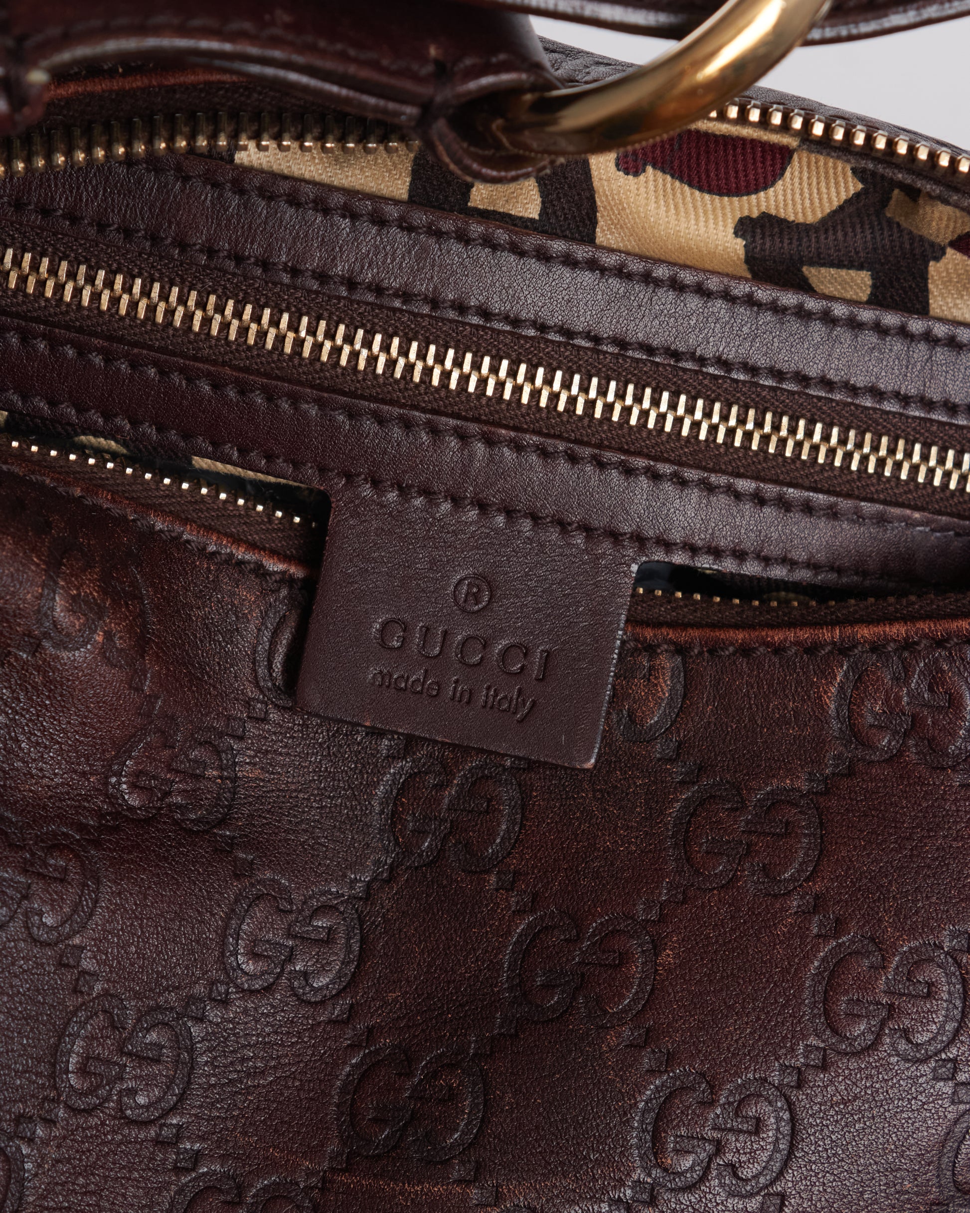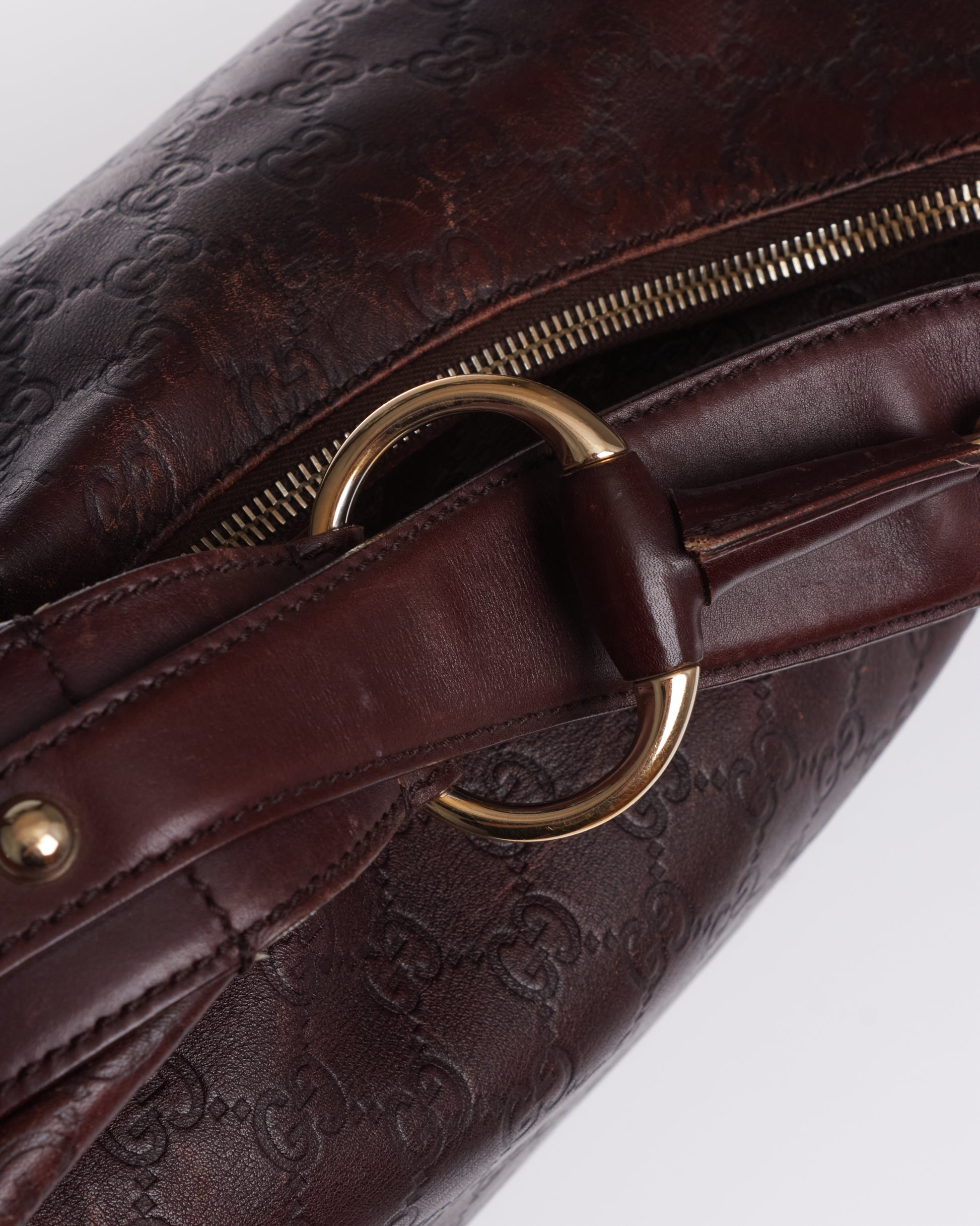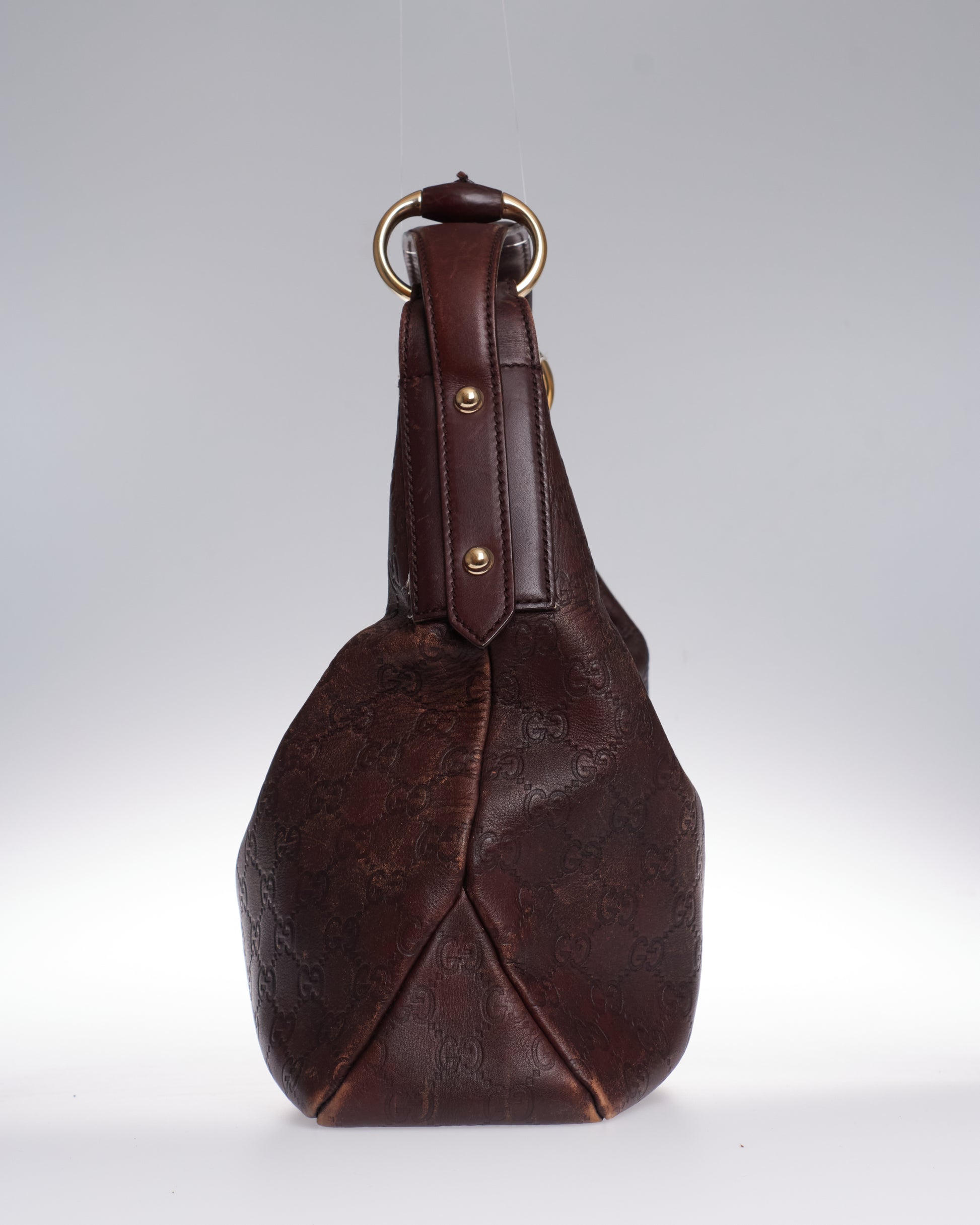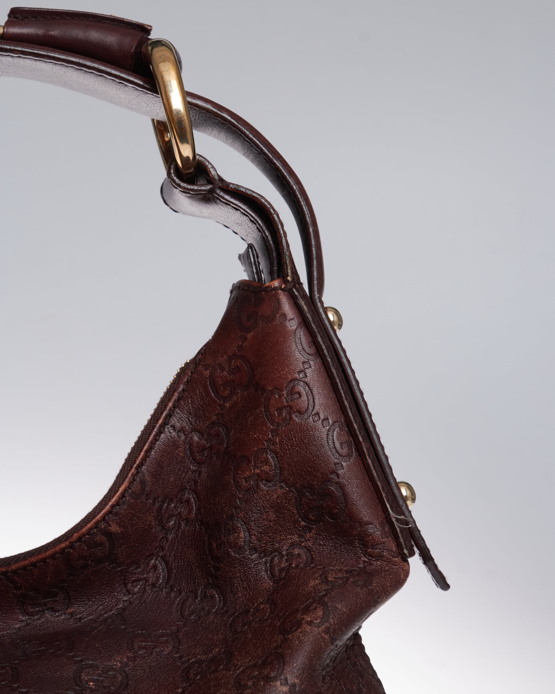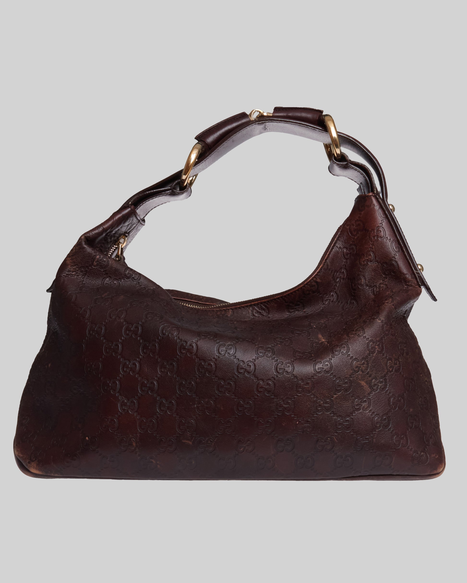 Gucci horsebit hobo with a brown leather GG monogram exterior, brown leather details and gold-tone hardware.