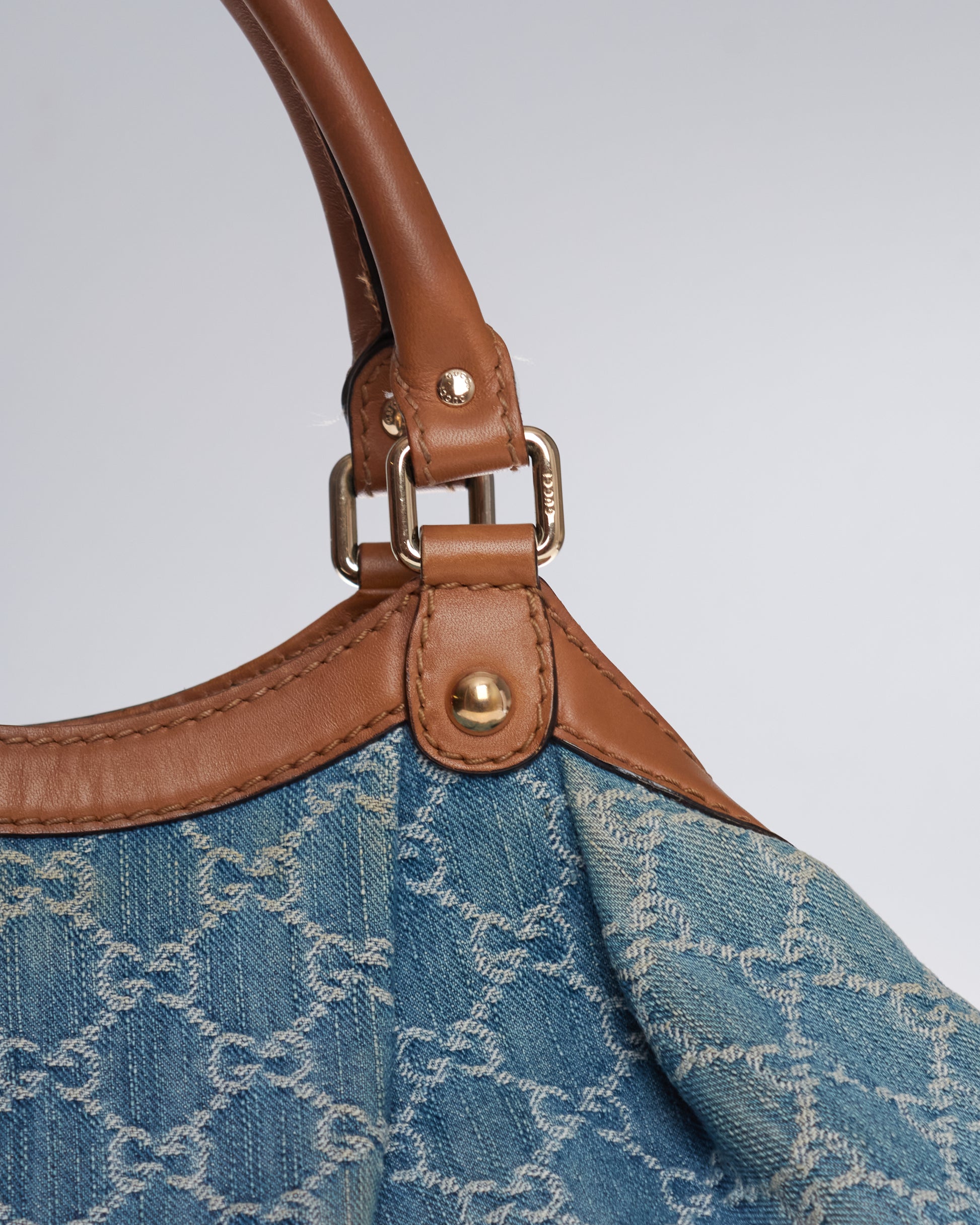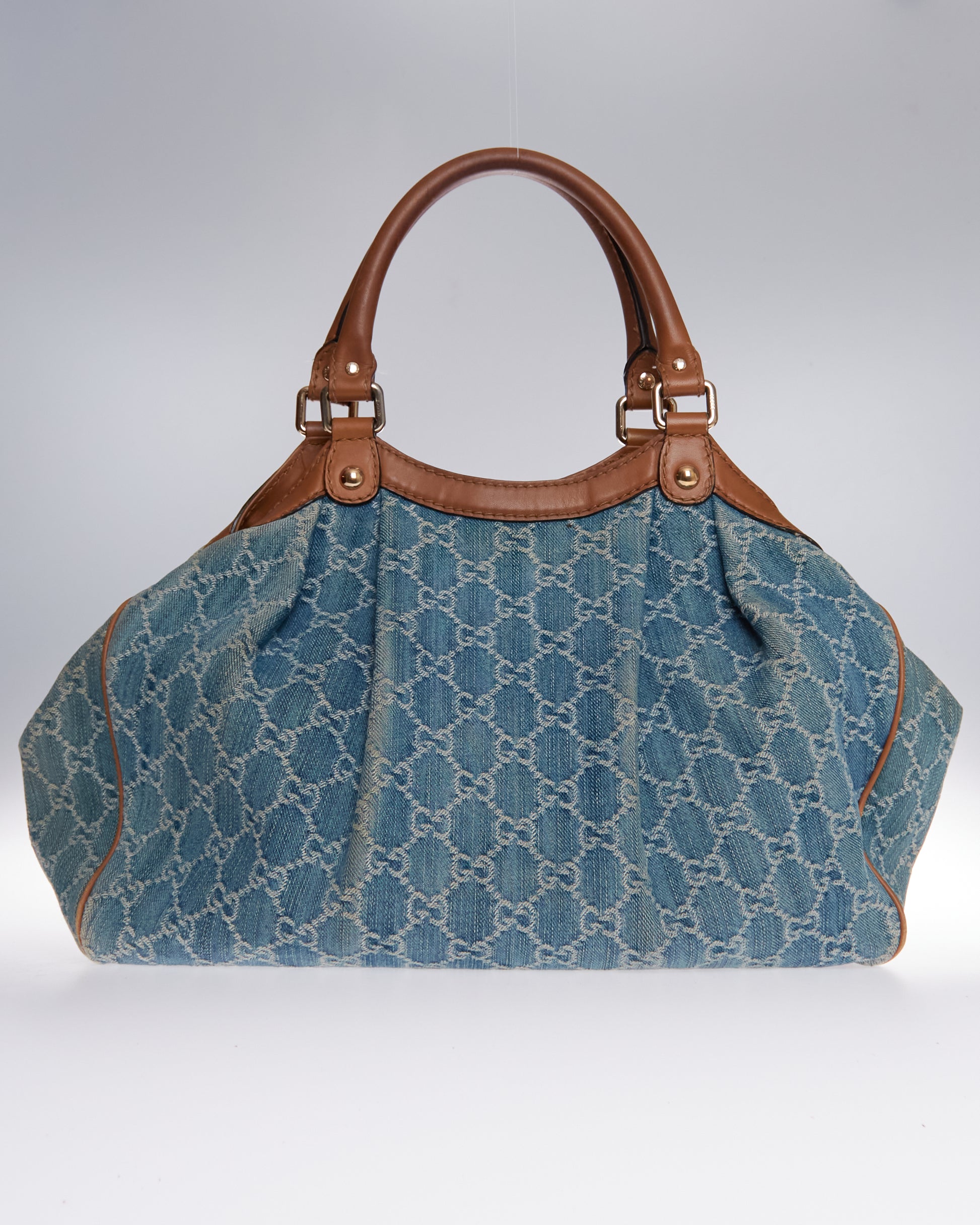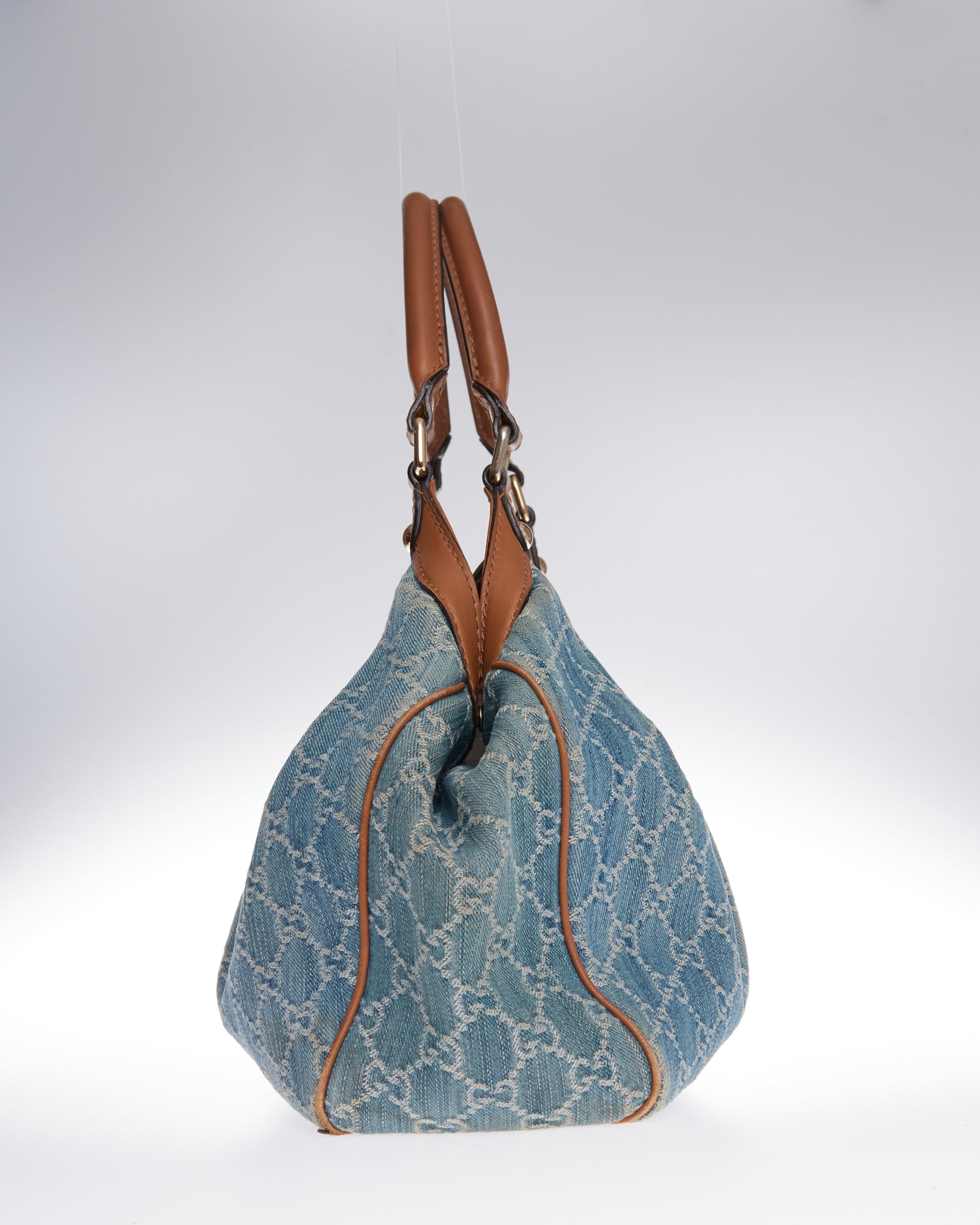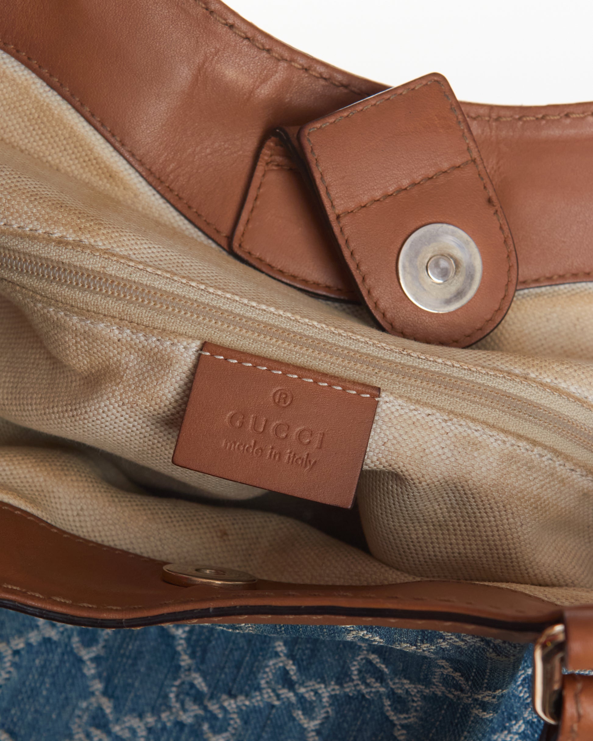 This Gucci Sukey Tote Bag has soft blue denim exterior with the iconic GG monogram, brown leather details and subtle gold-tone hardware.