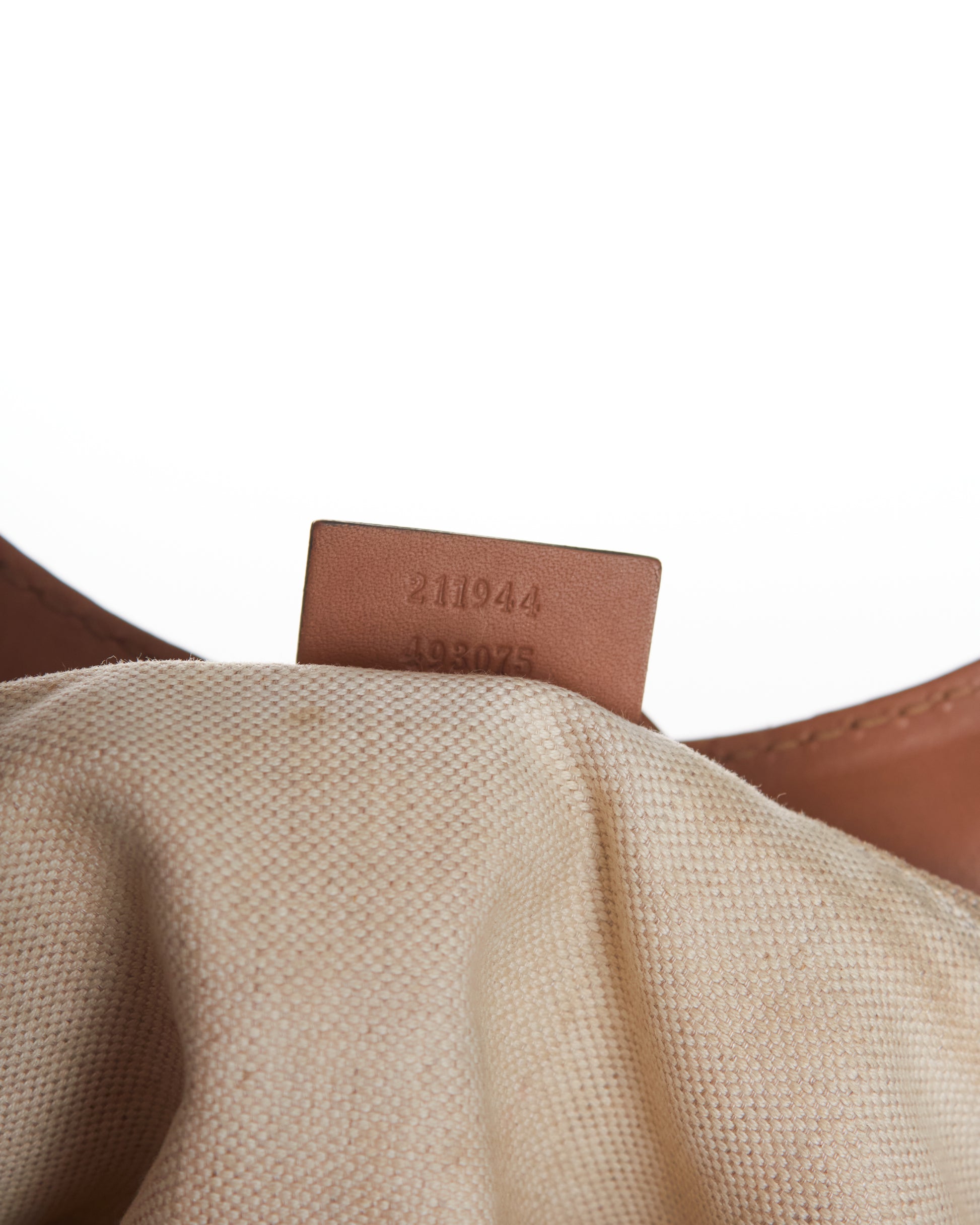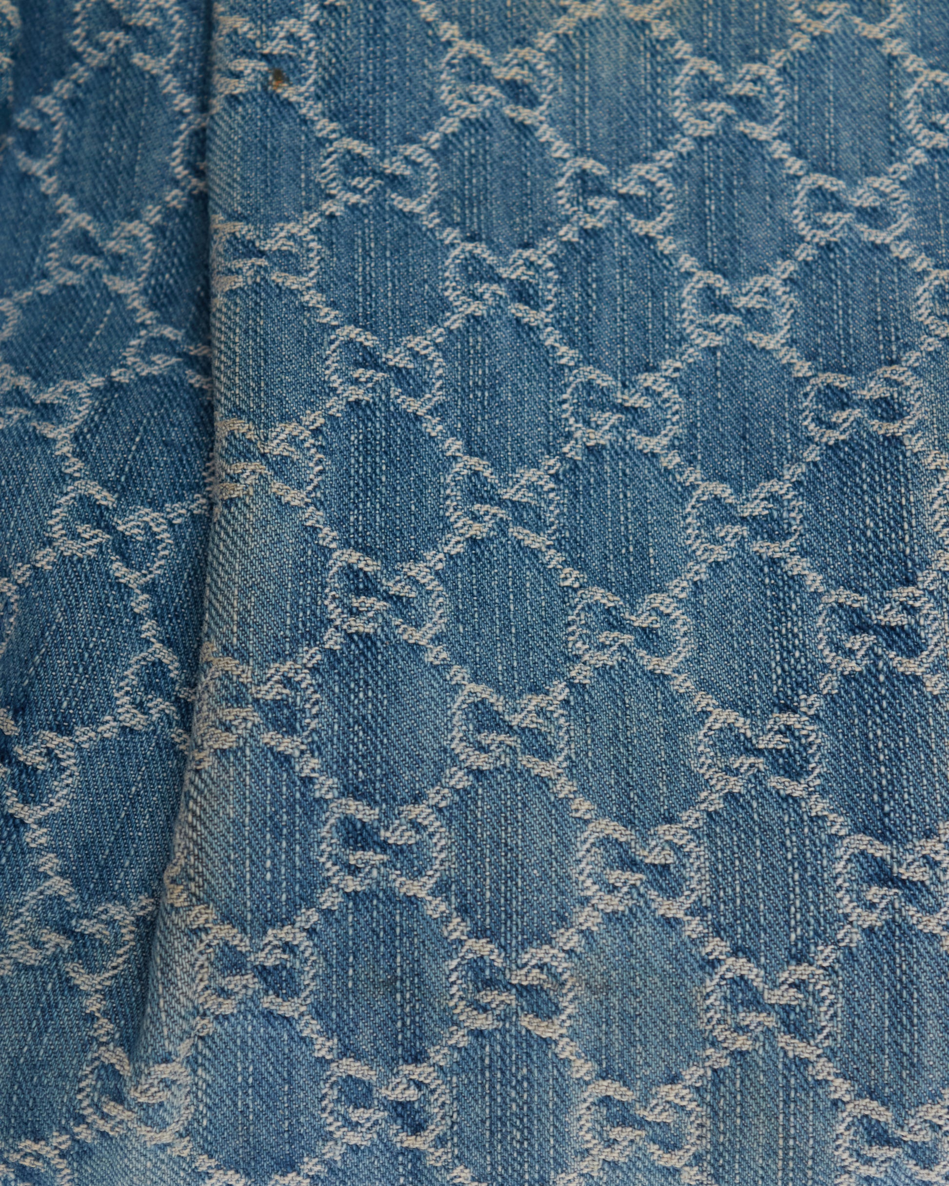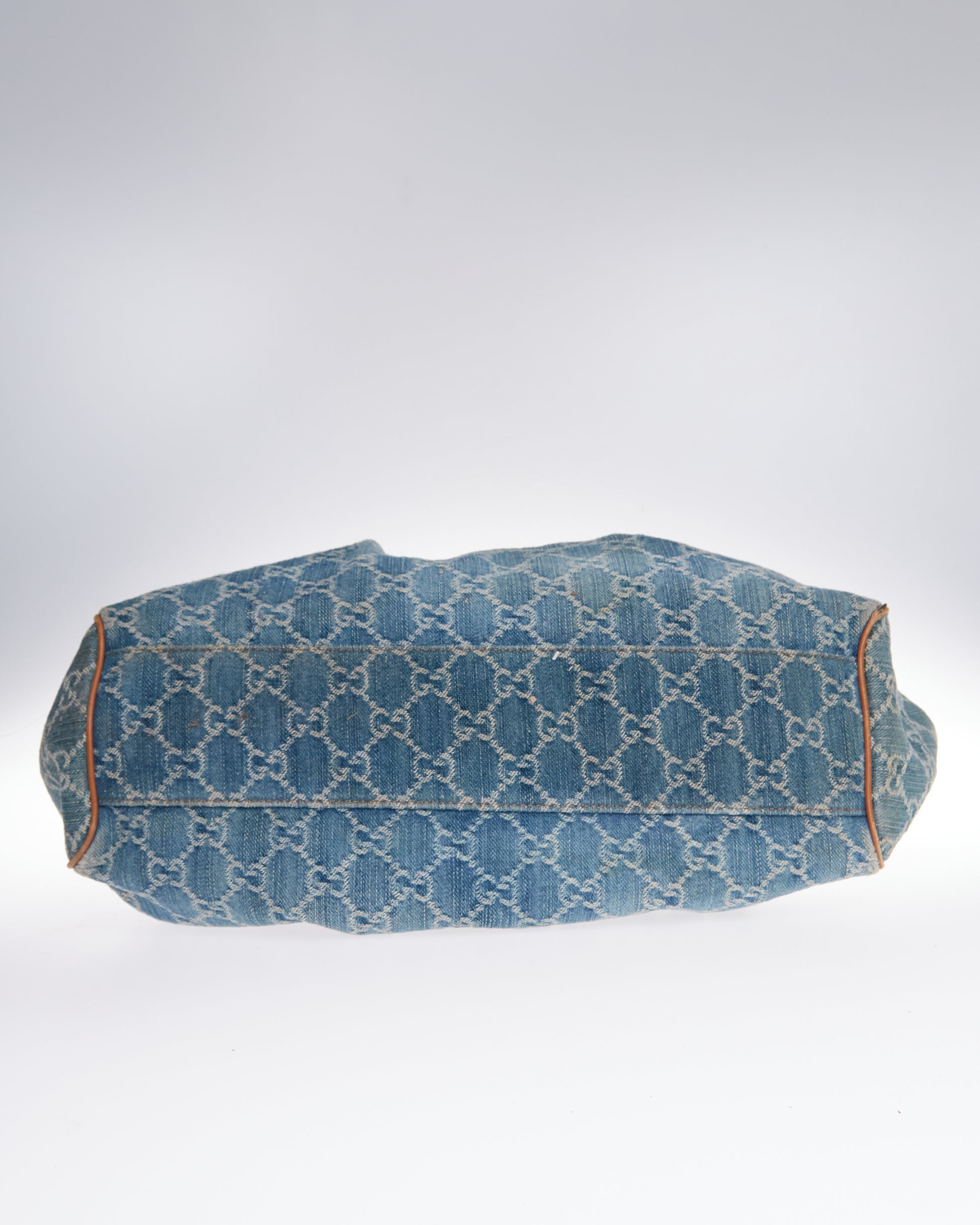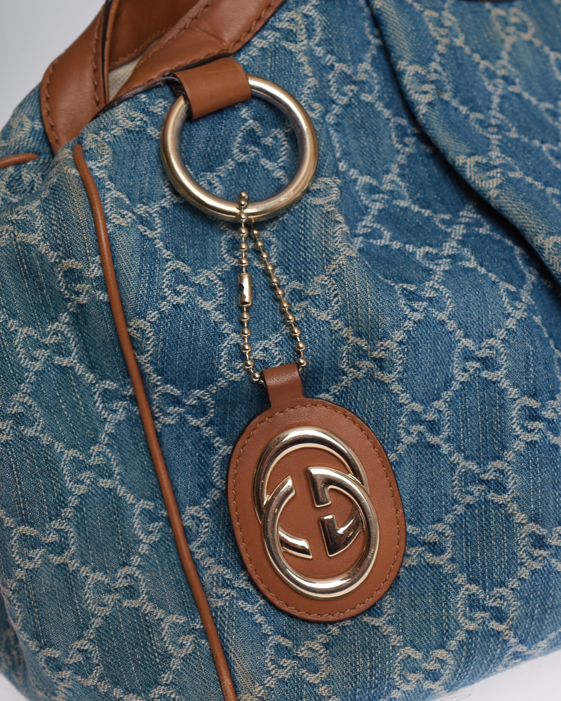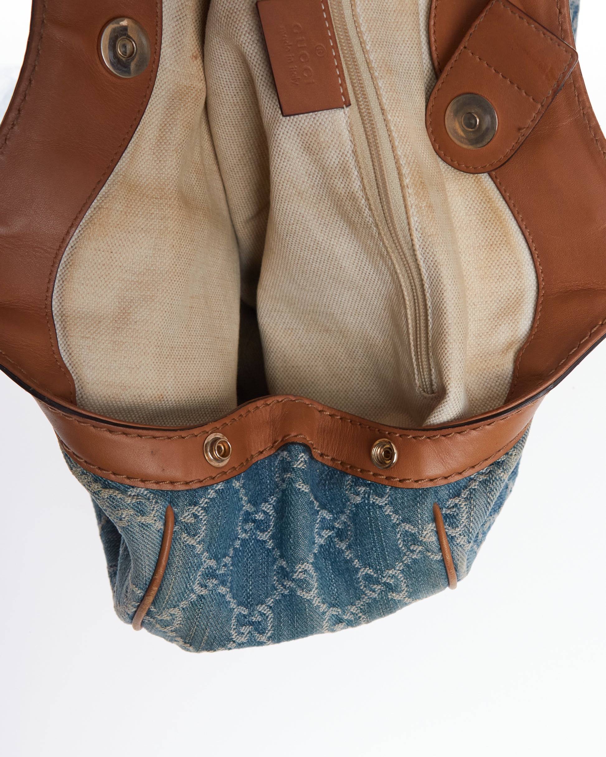 This Gucci Sukey Tote Bag has soft blue denim exterior with the iconic GG monogram, brown leather details and subtle gold-tone hardware.