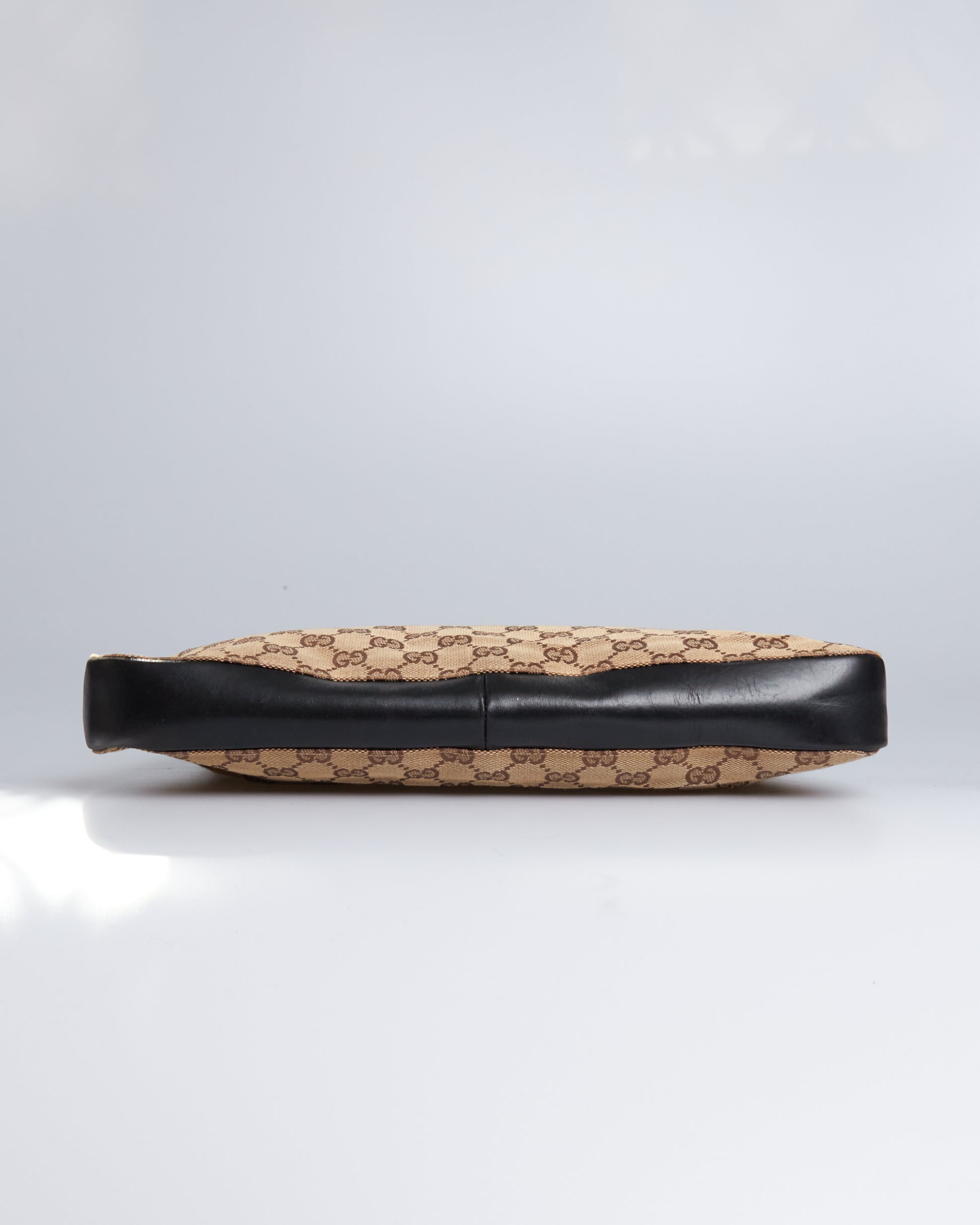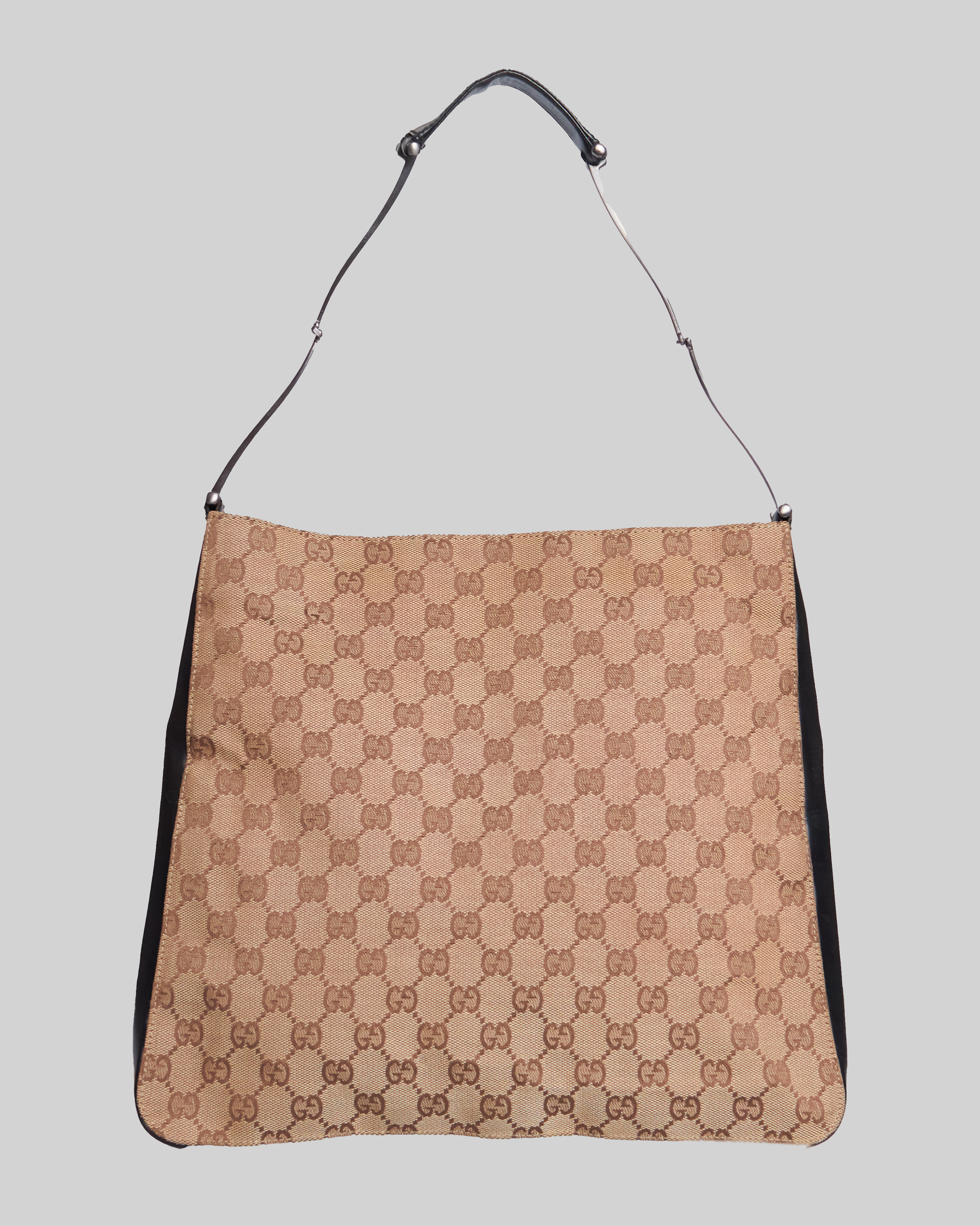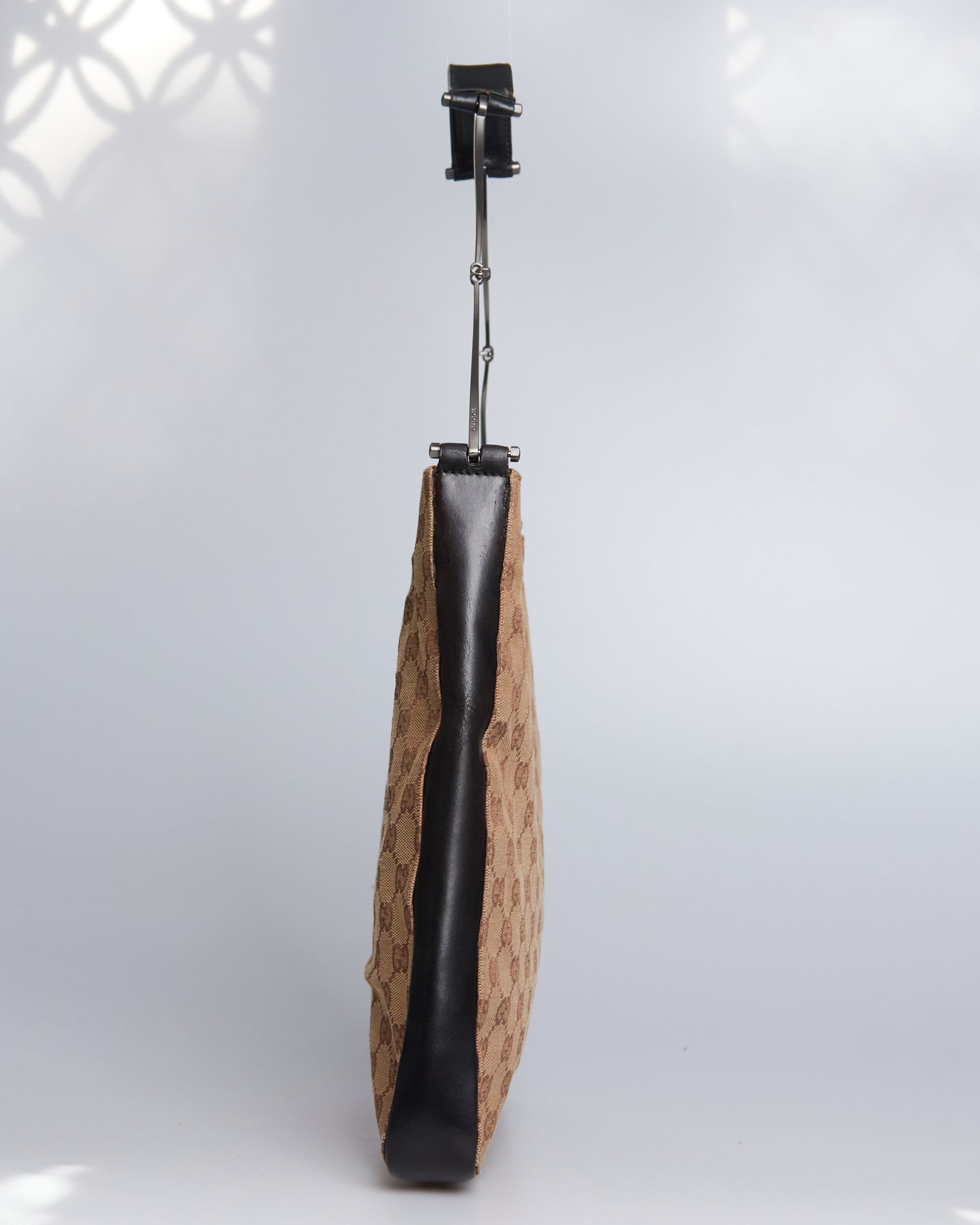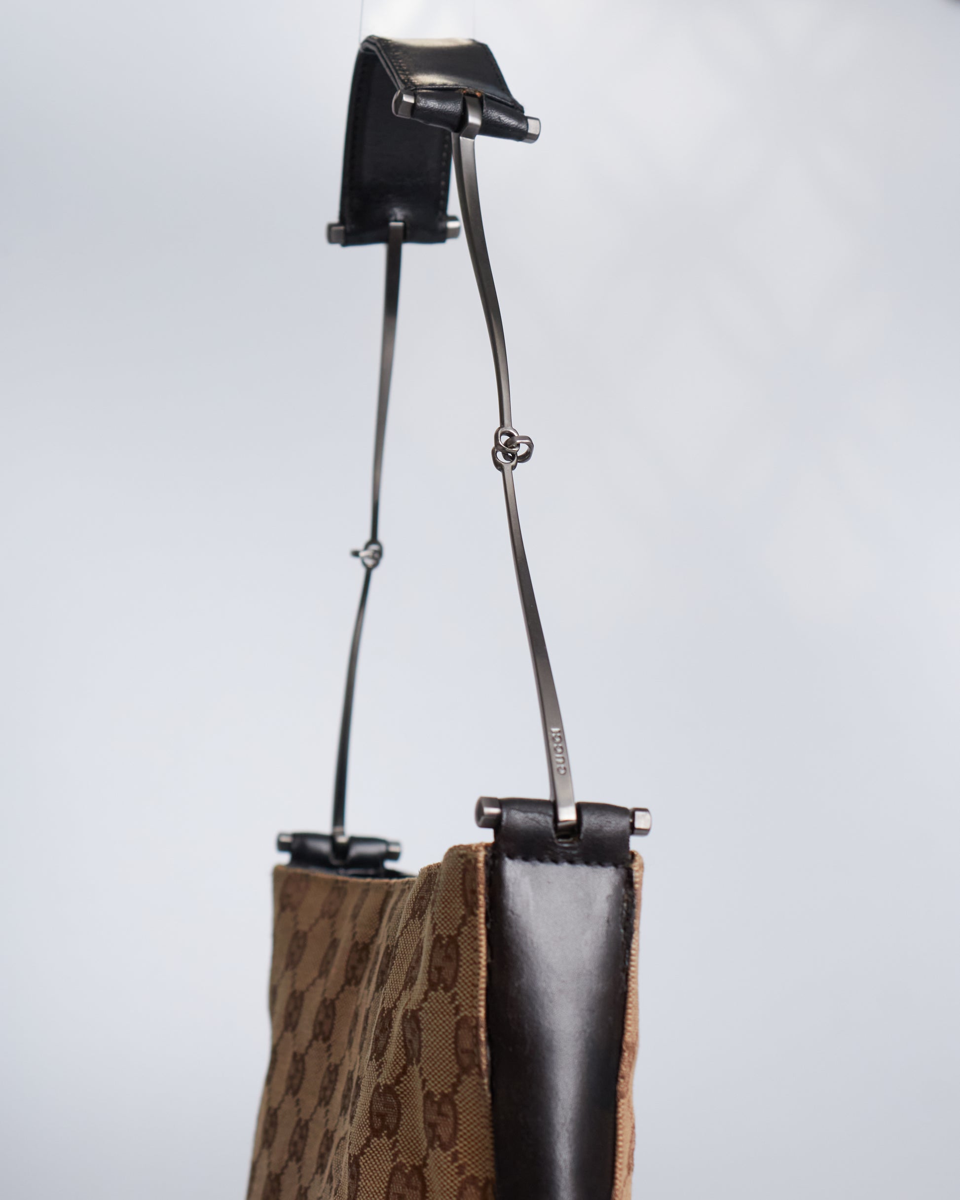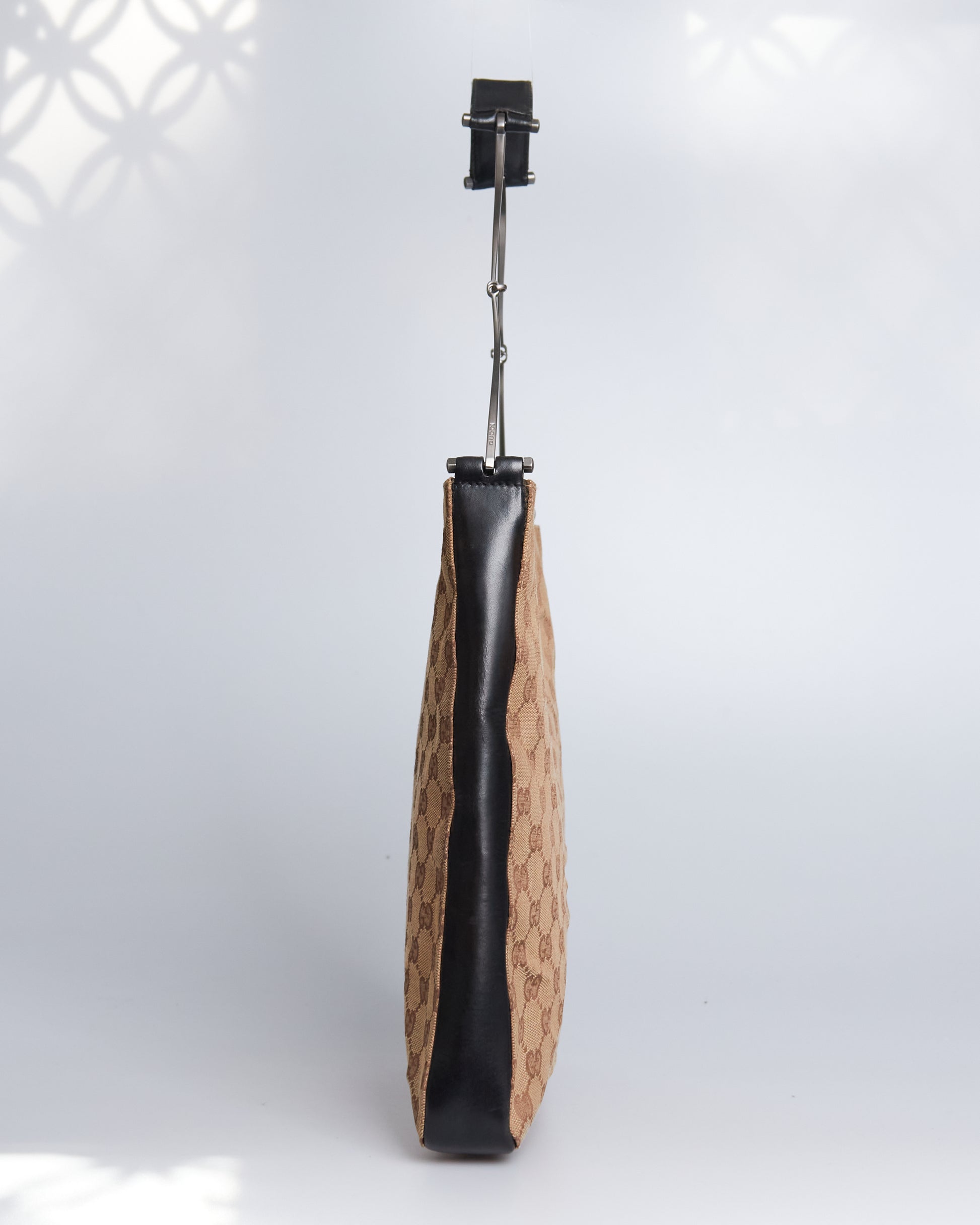 This Gucci shoulder bag has brown GG canvas exterior, black leather details and a metal handle.