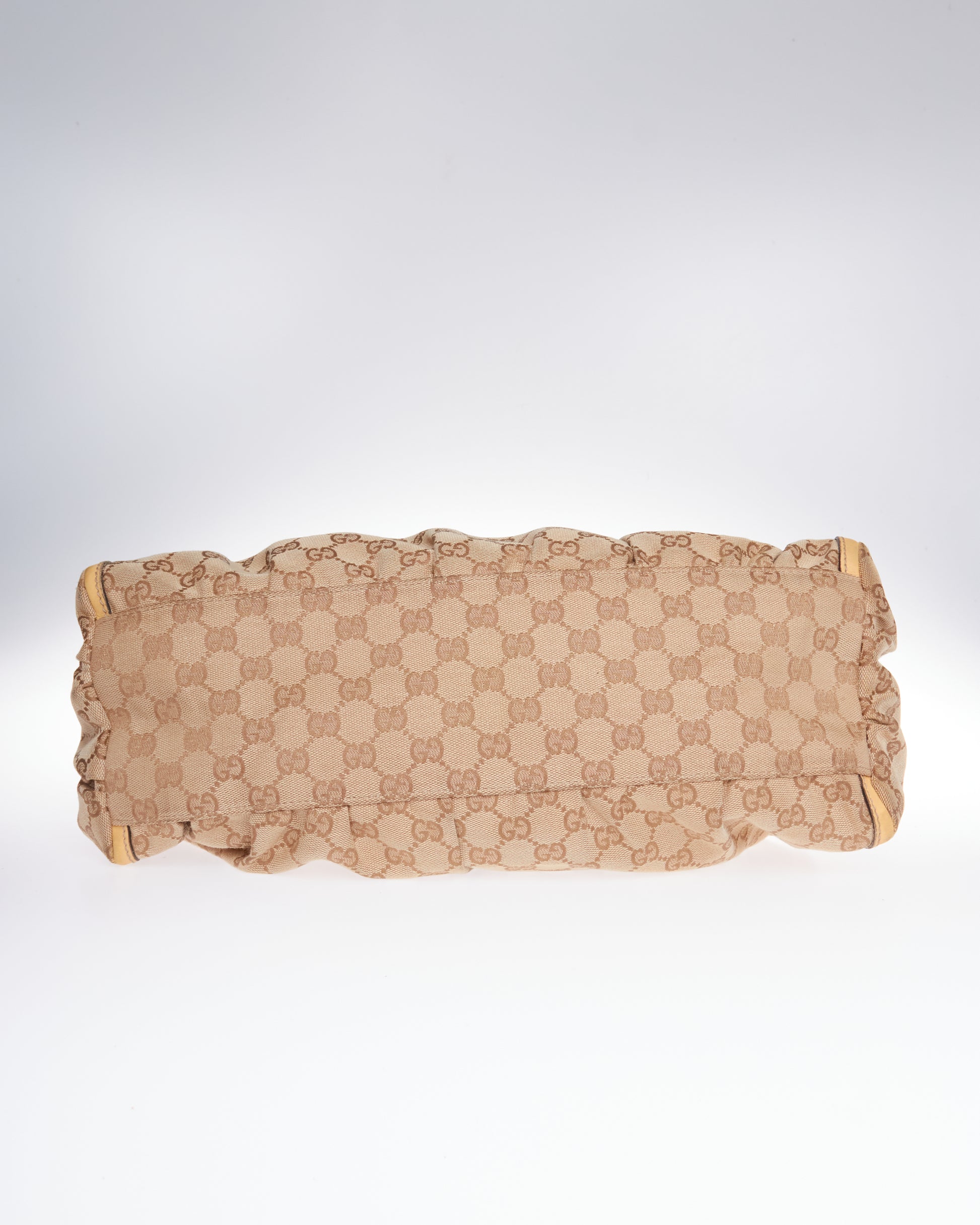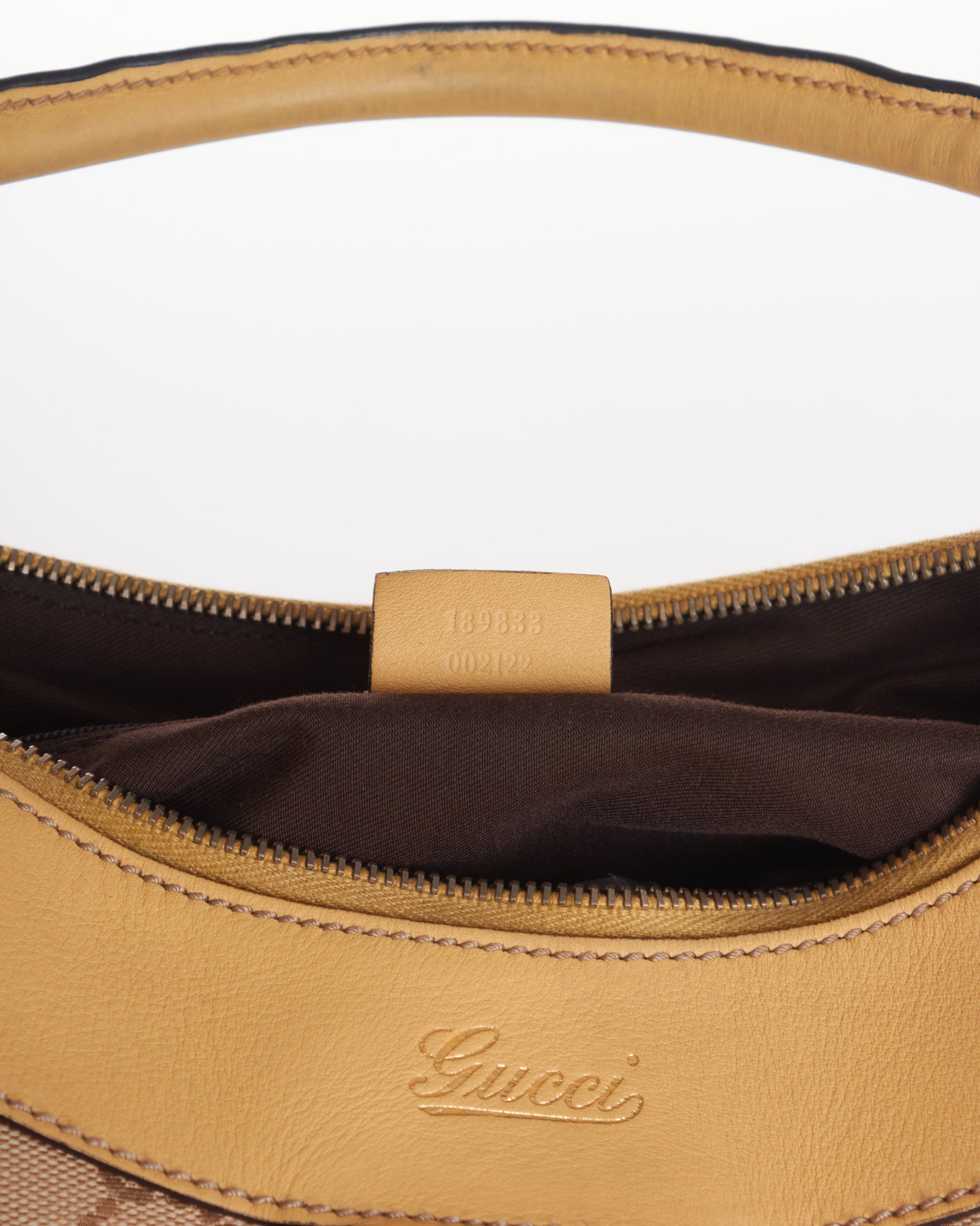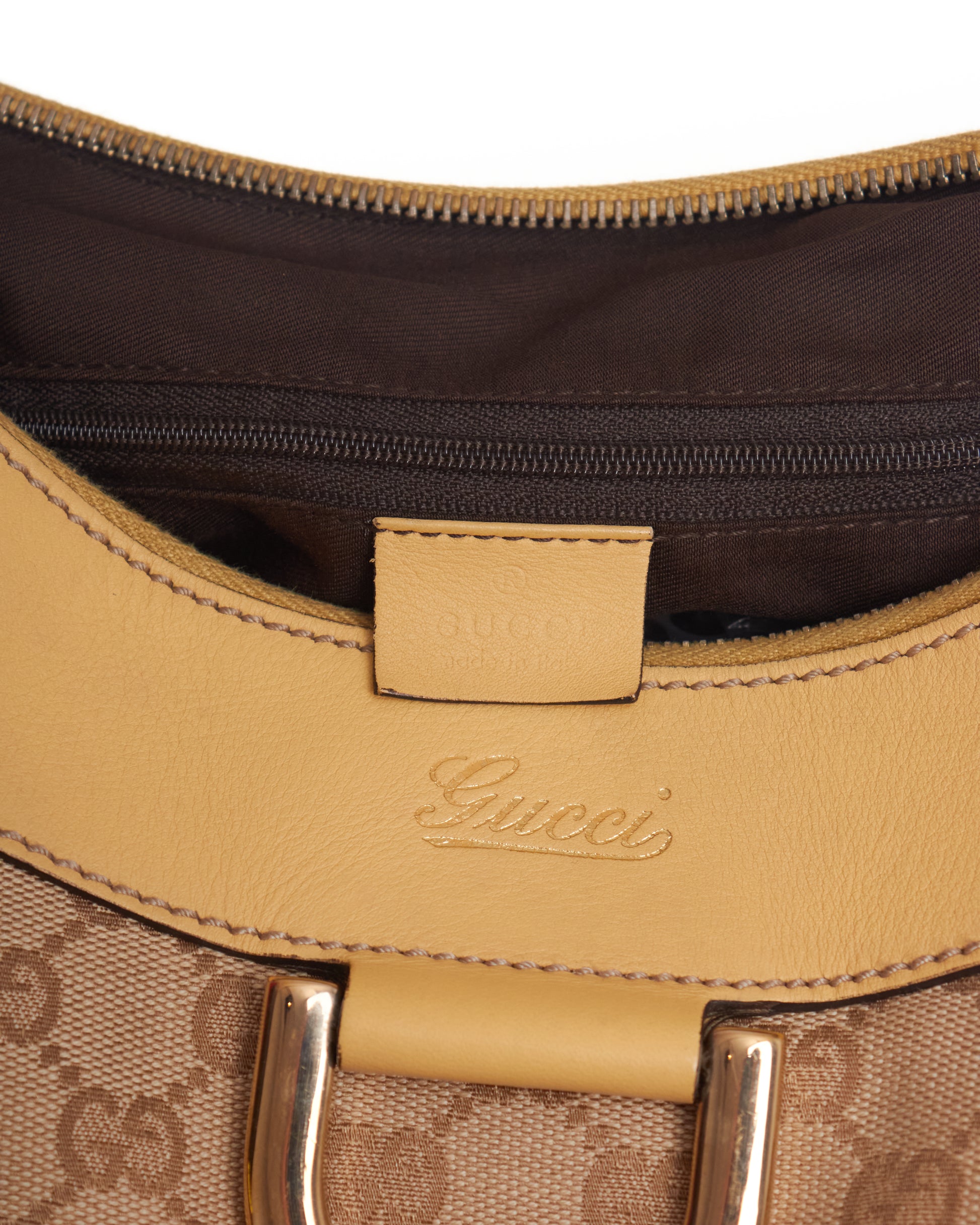 This Gucci Abbey D-ring shoulder bag has brown GG canvas, yellow leather details and subtle gold-tone hardware.