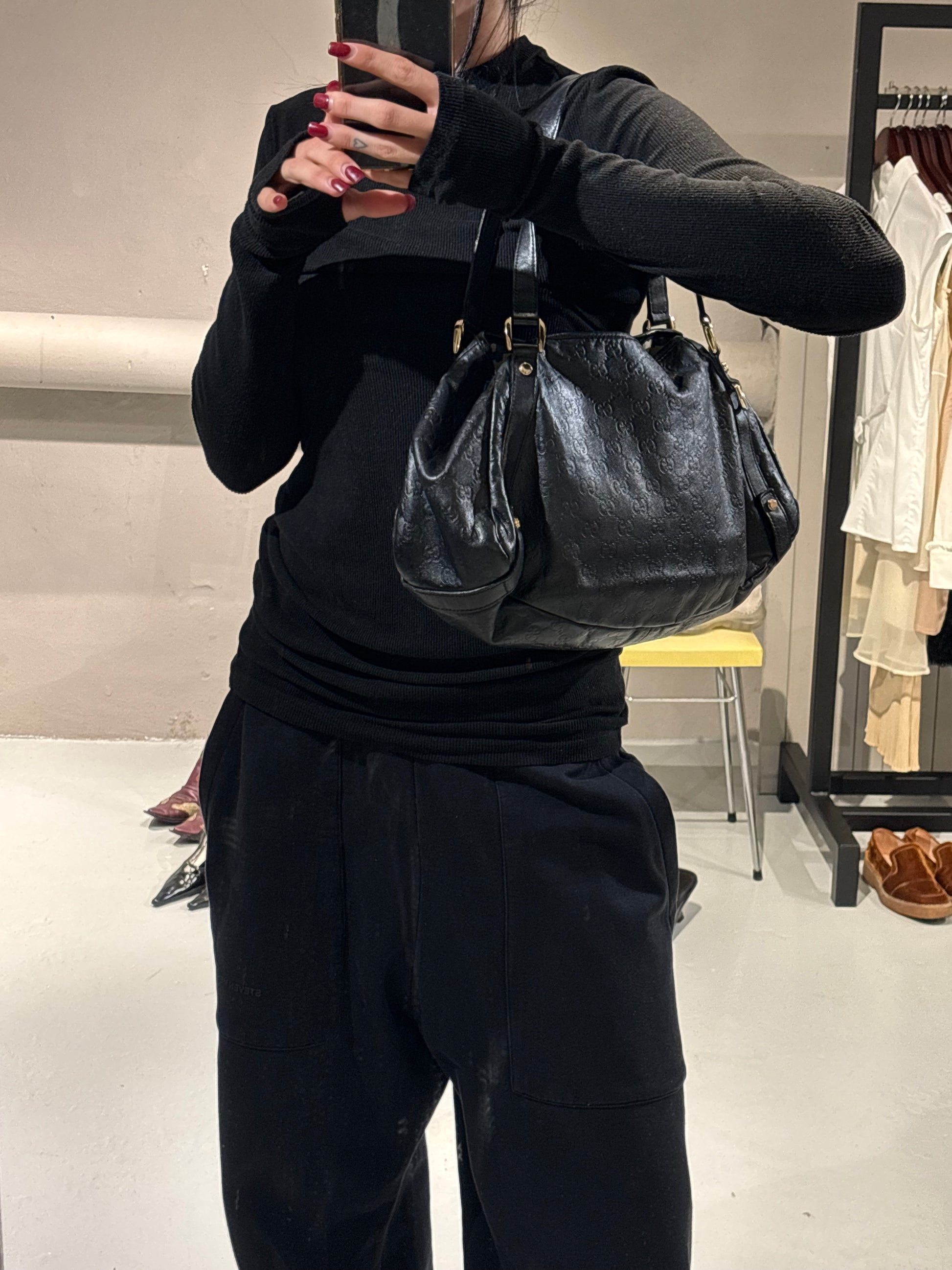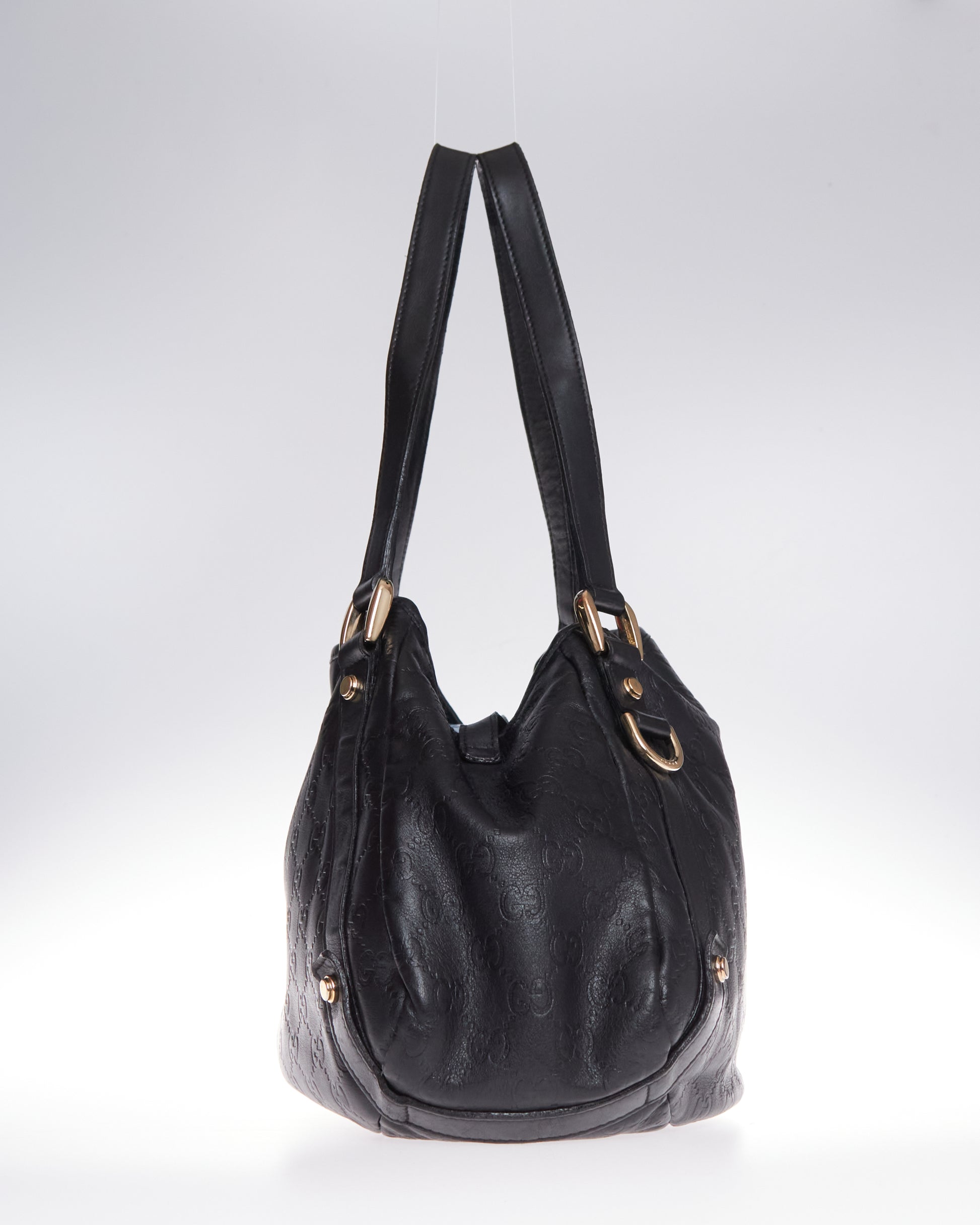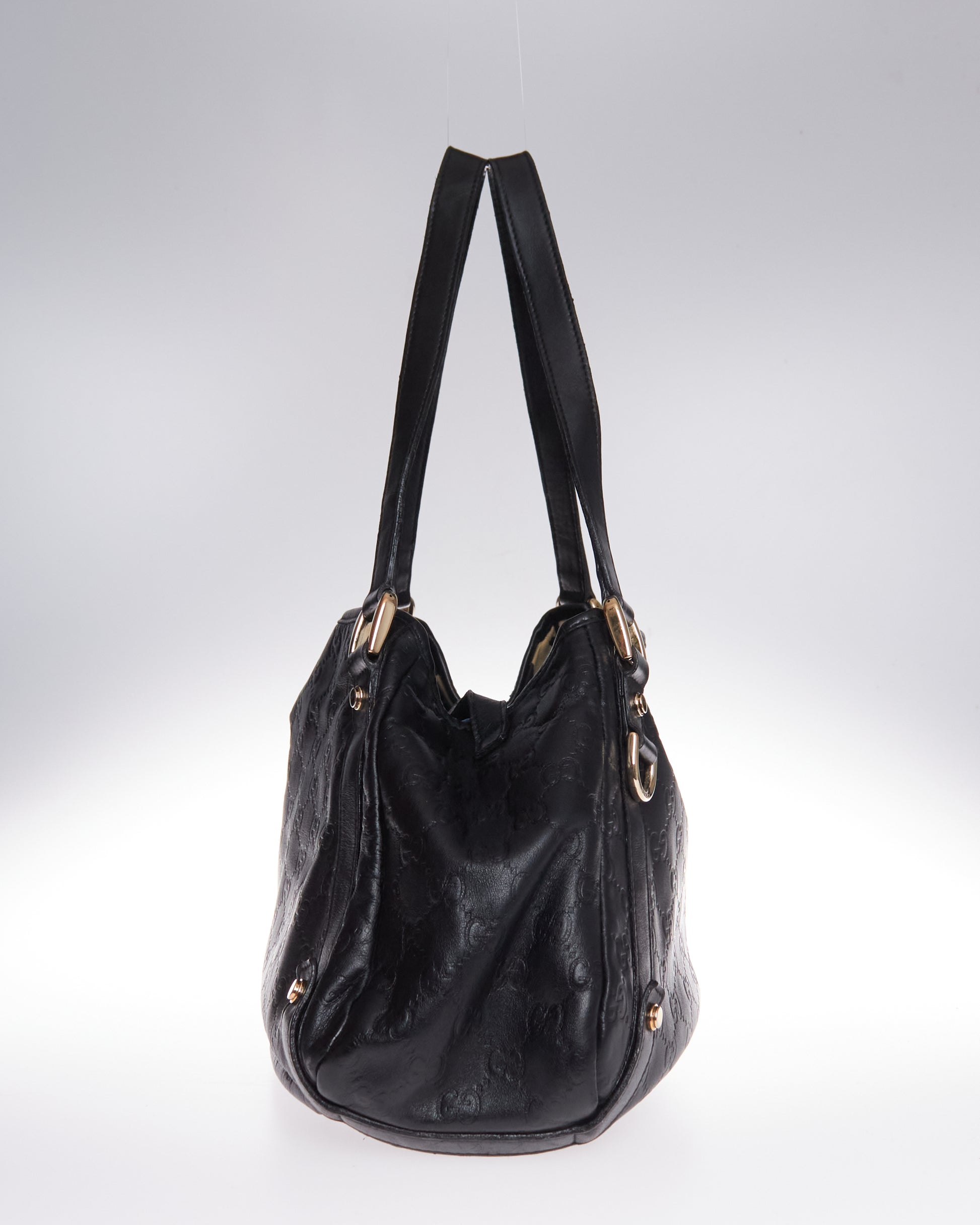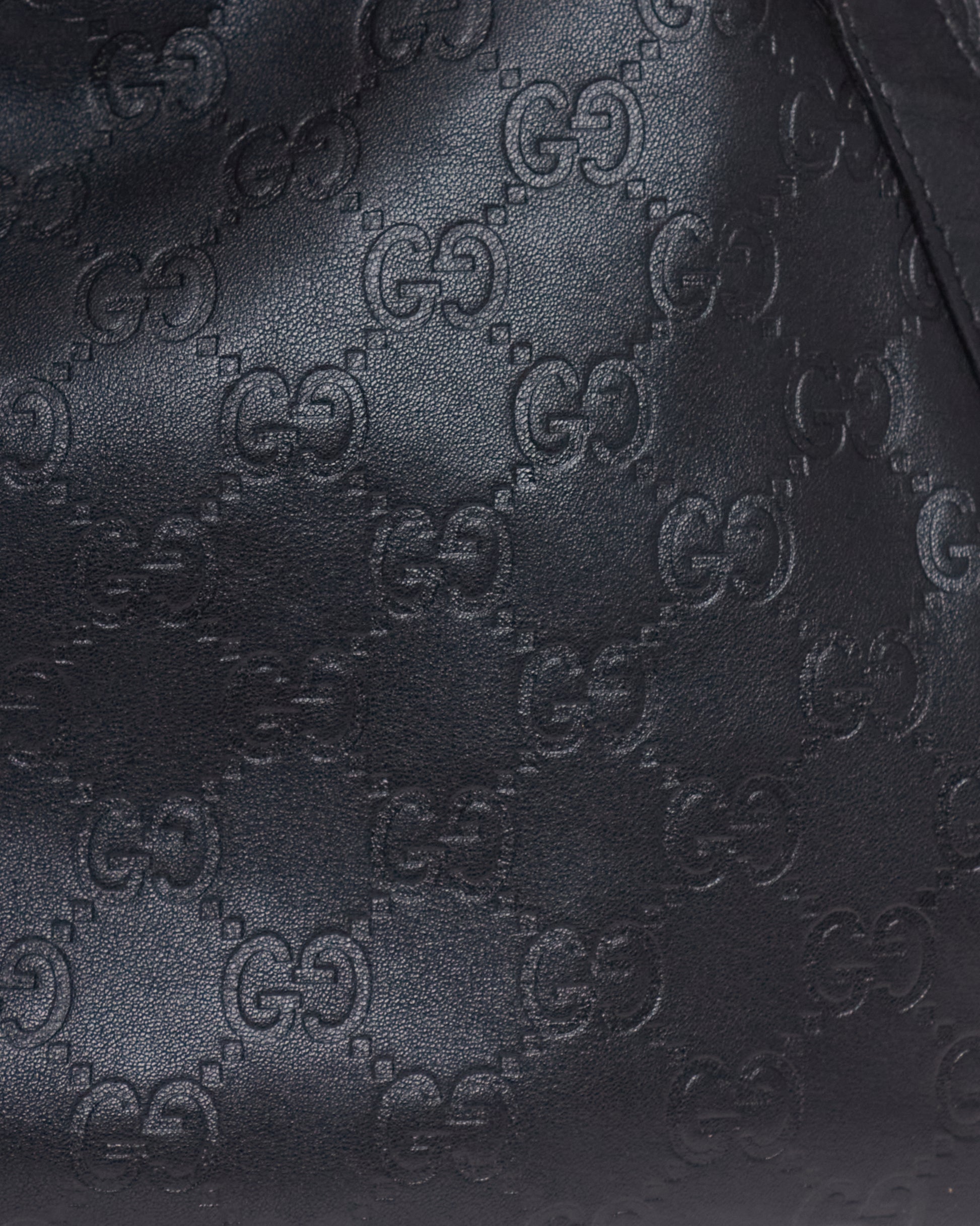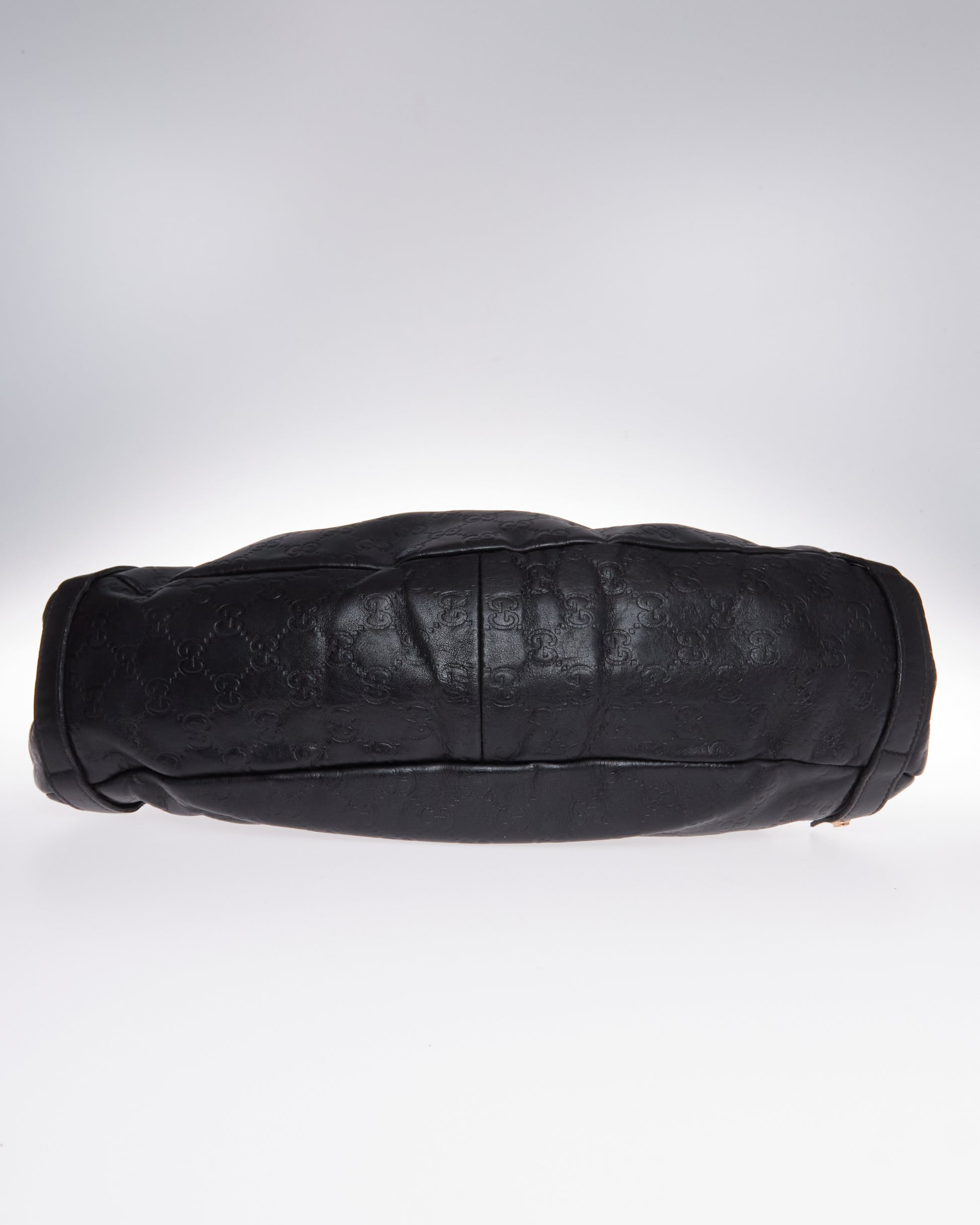 This spacious Gucci Hobo Bag has black leather GG monogram canvas, gold leather details and has gold-tone hardware on both sides. The bag fits most laptops (check measurements).