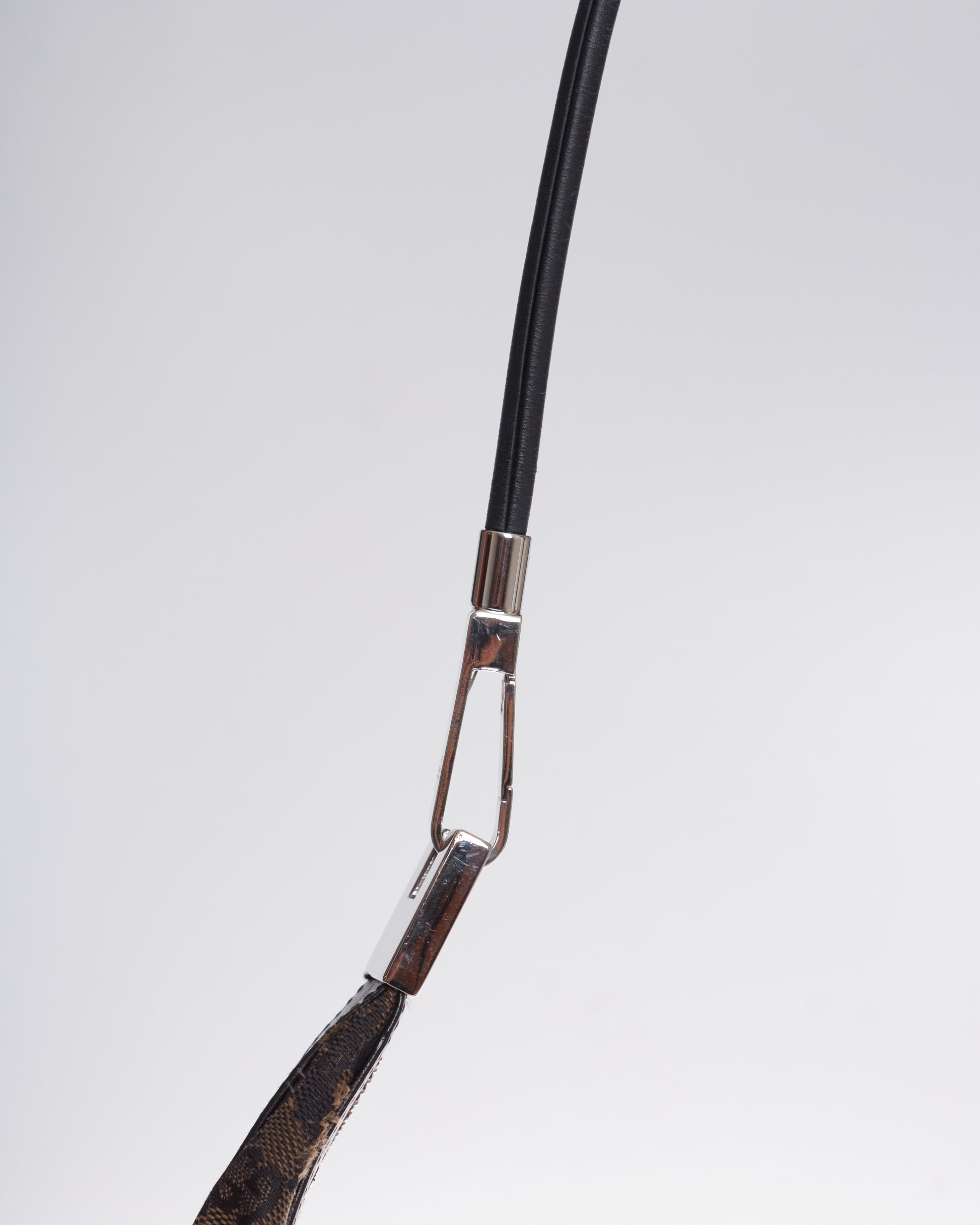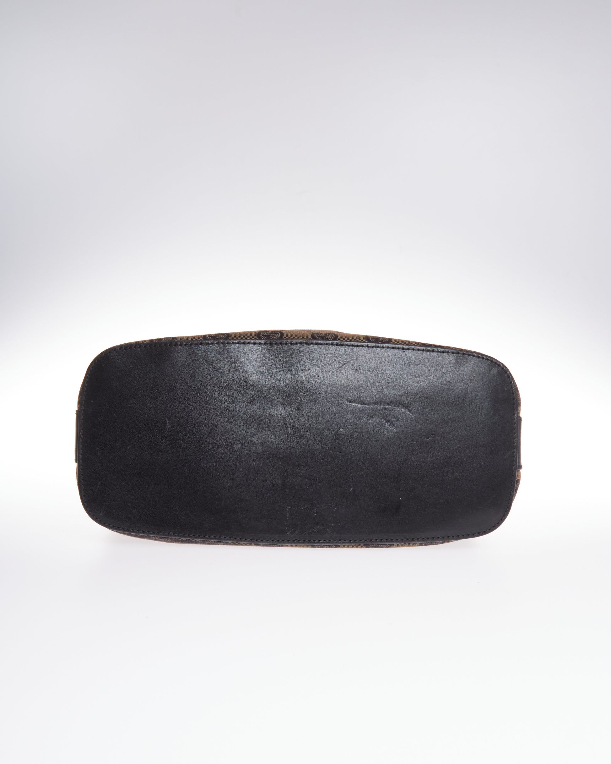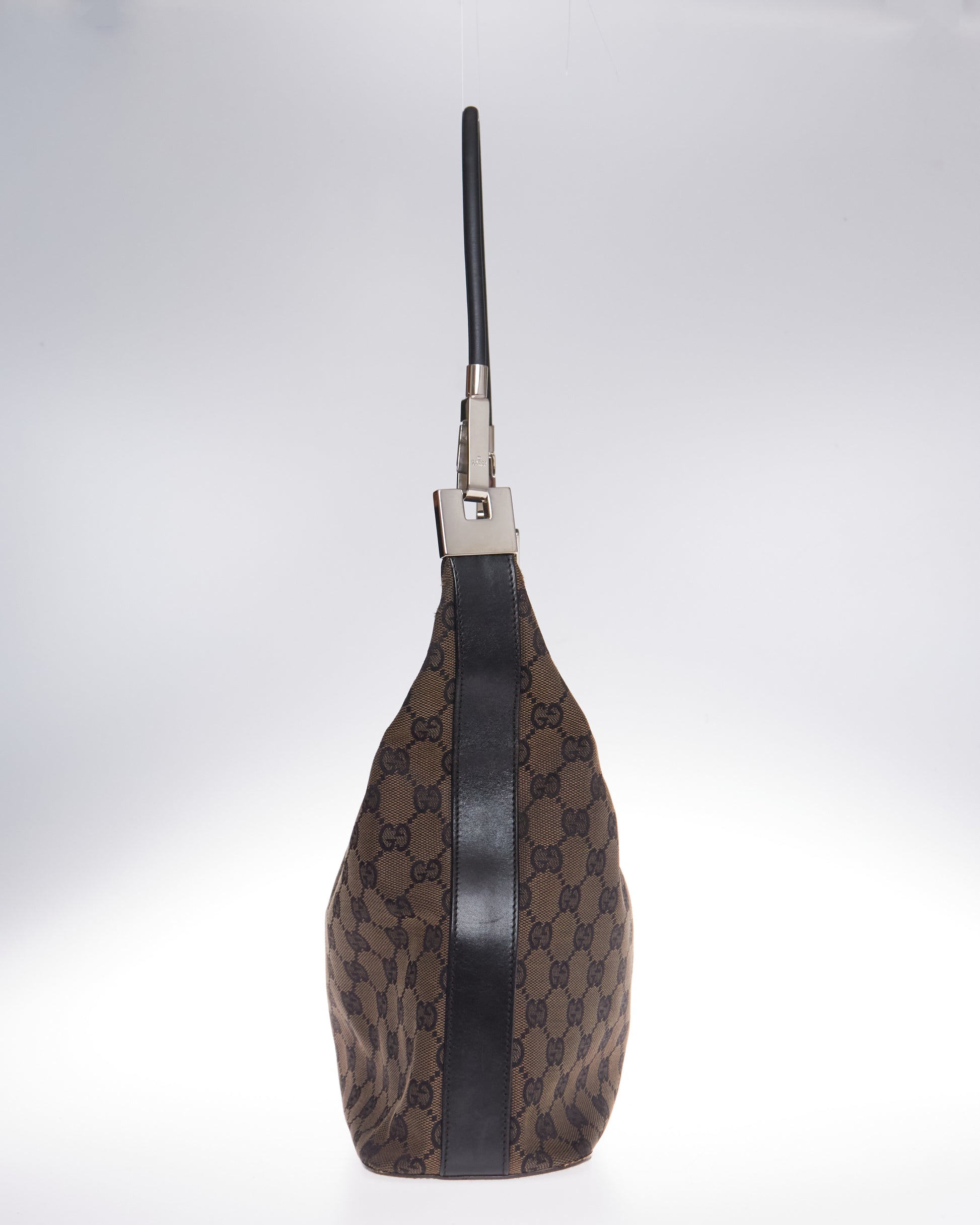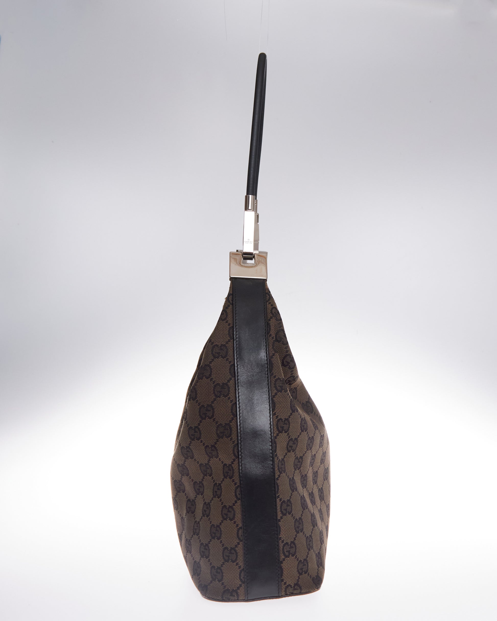 This bag by Tom Ford for Gucci has brown/black GG monogram canvas and has subtle silver-tone hardware on both sides.