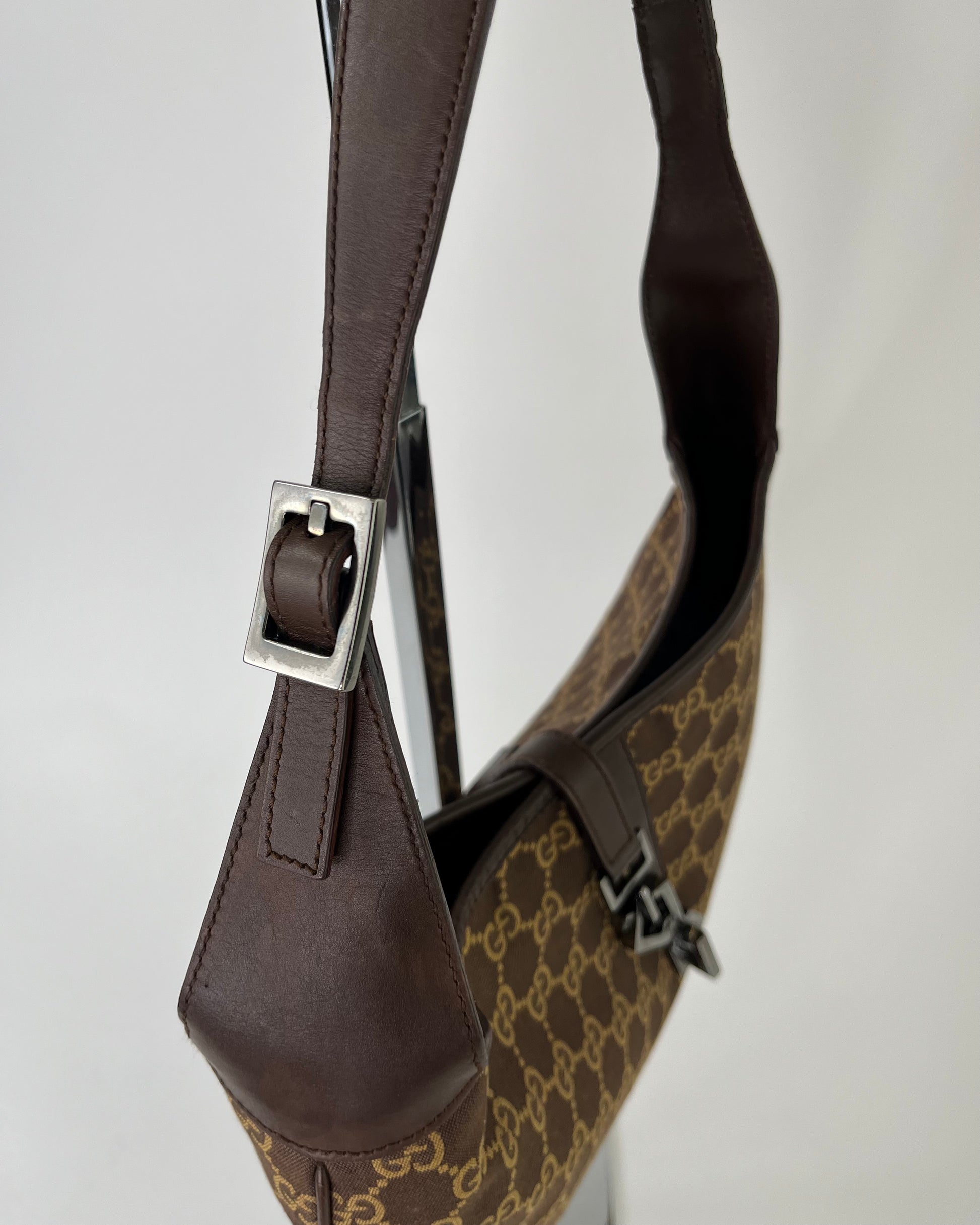 This Gucci Jackie has a brown GG canvas exterior, brown leather details and a silver-tone metal closure.