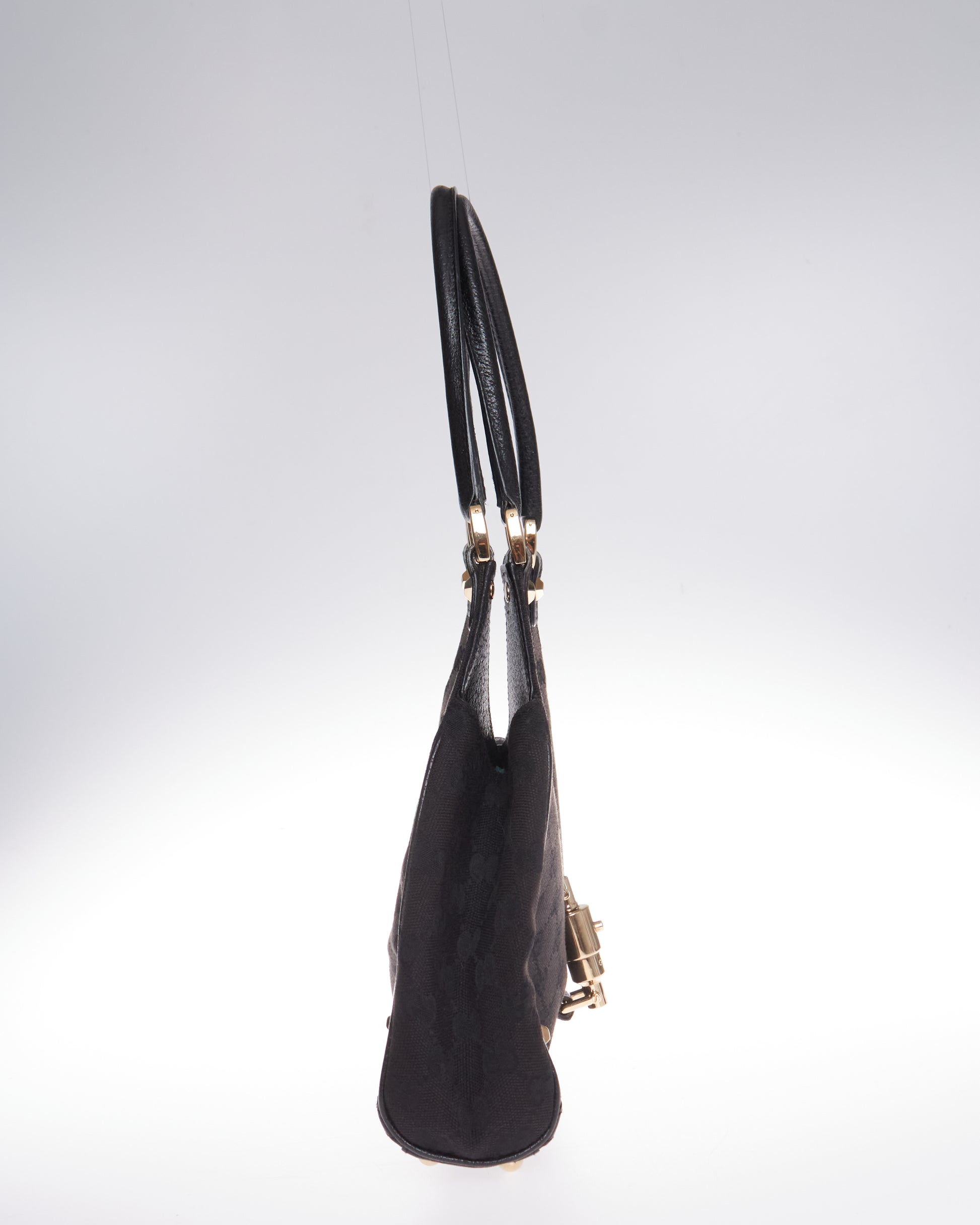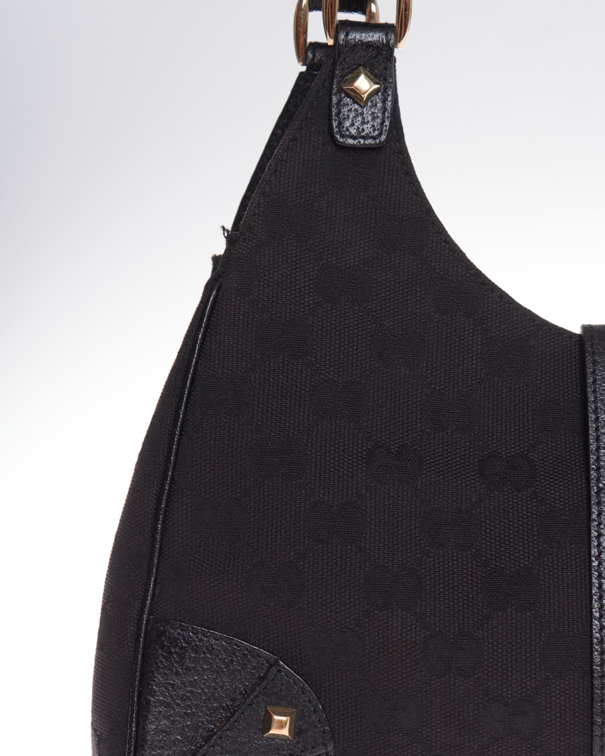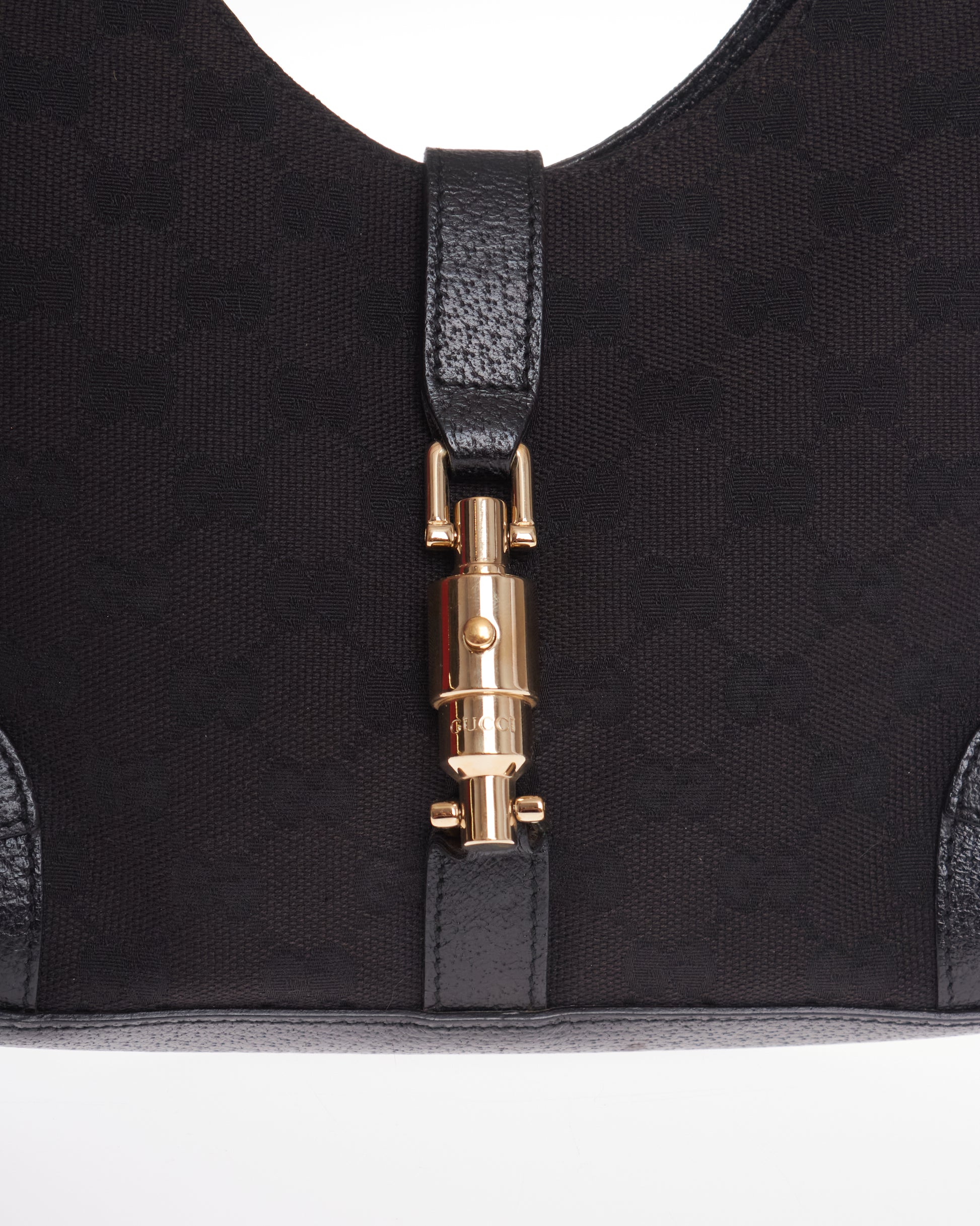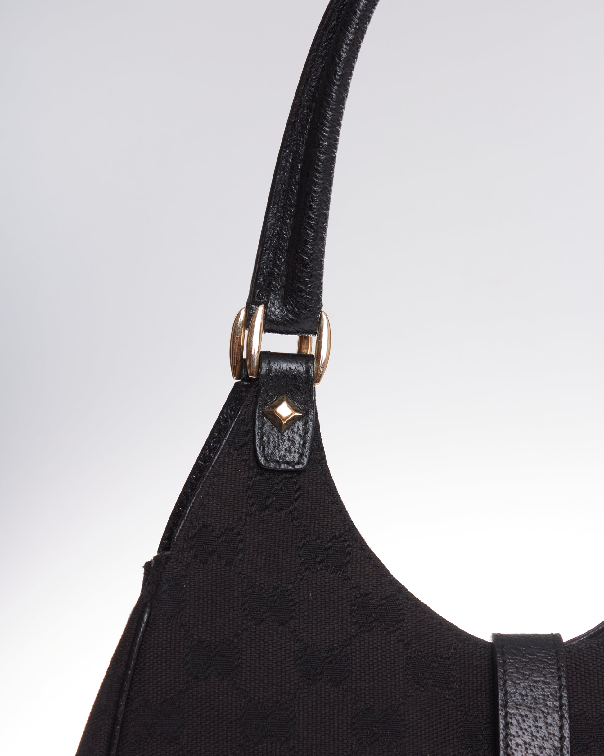 This Gucci Jackie cloth handbag has black GG canvas, black leather details and a rose-gold metal closure.