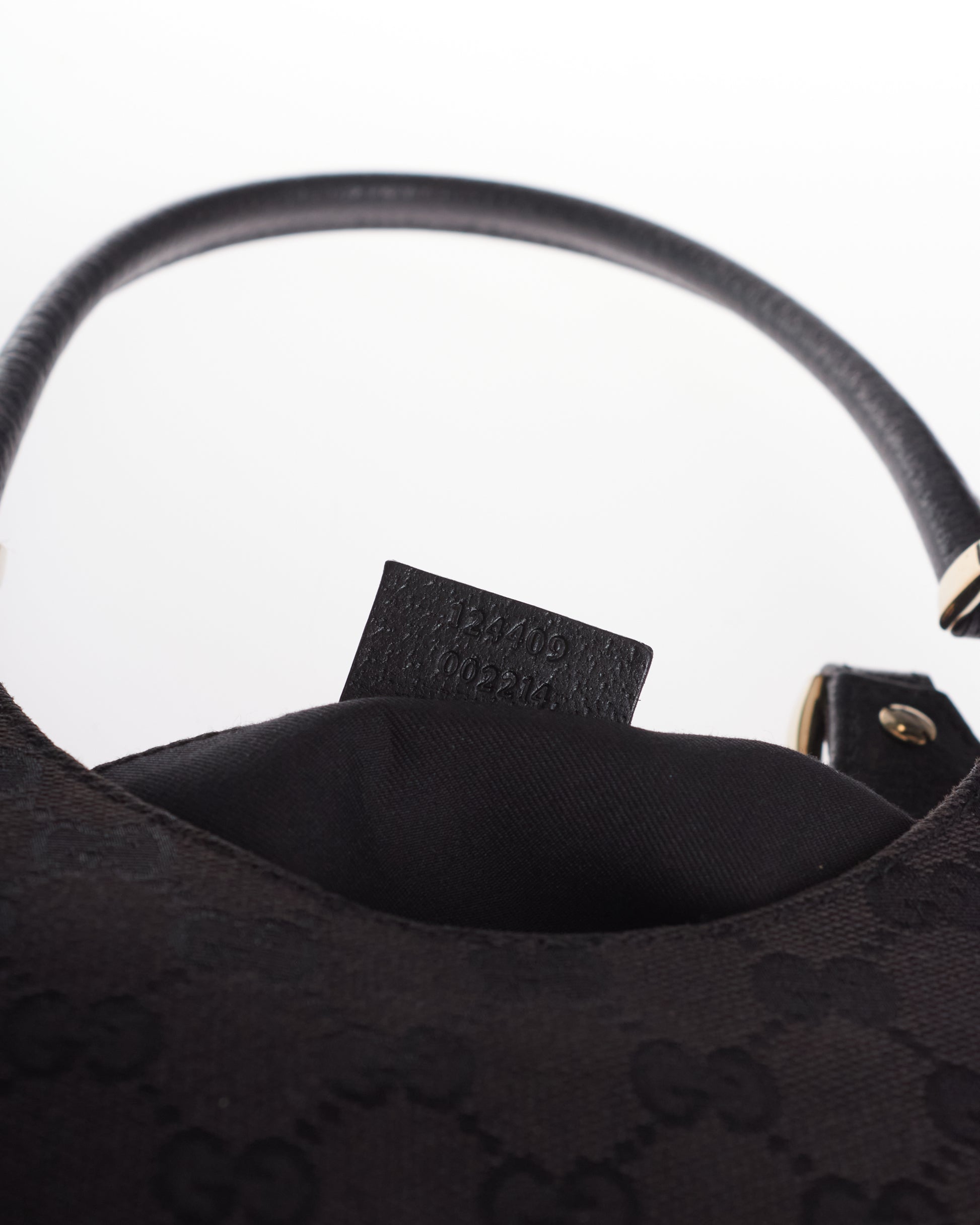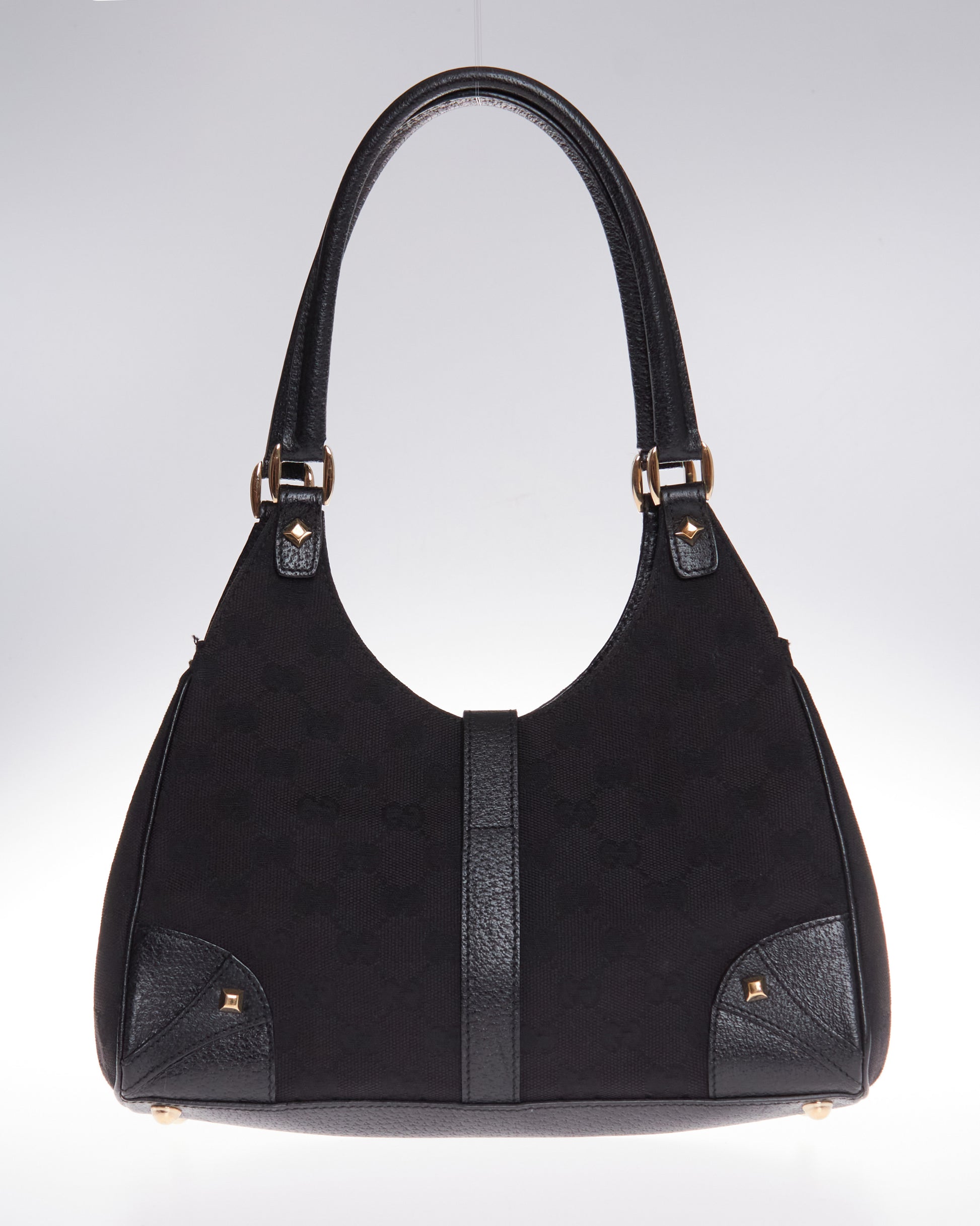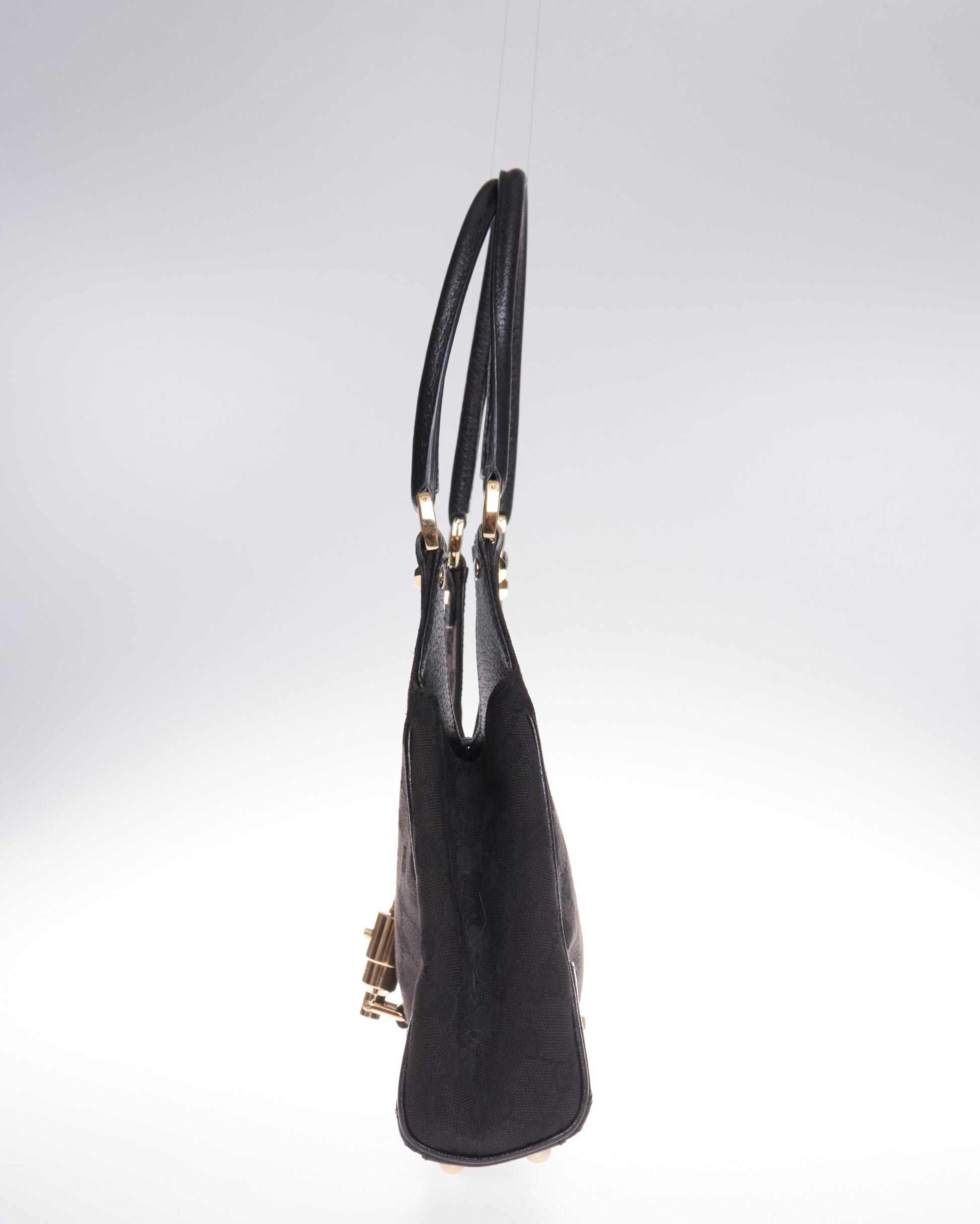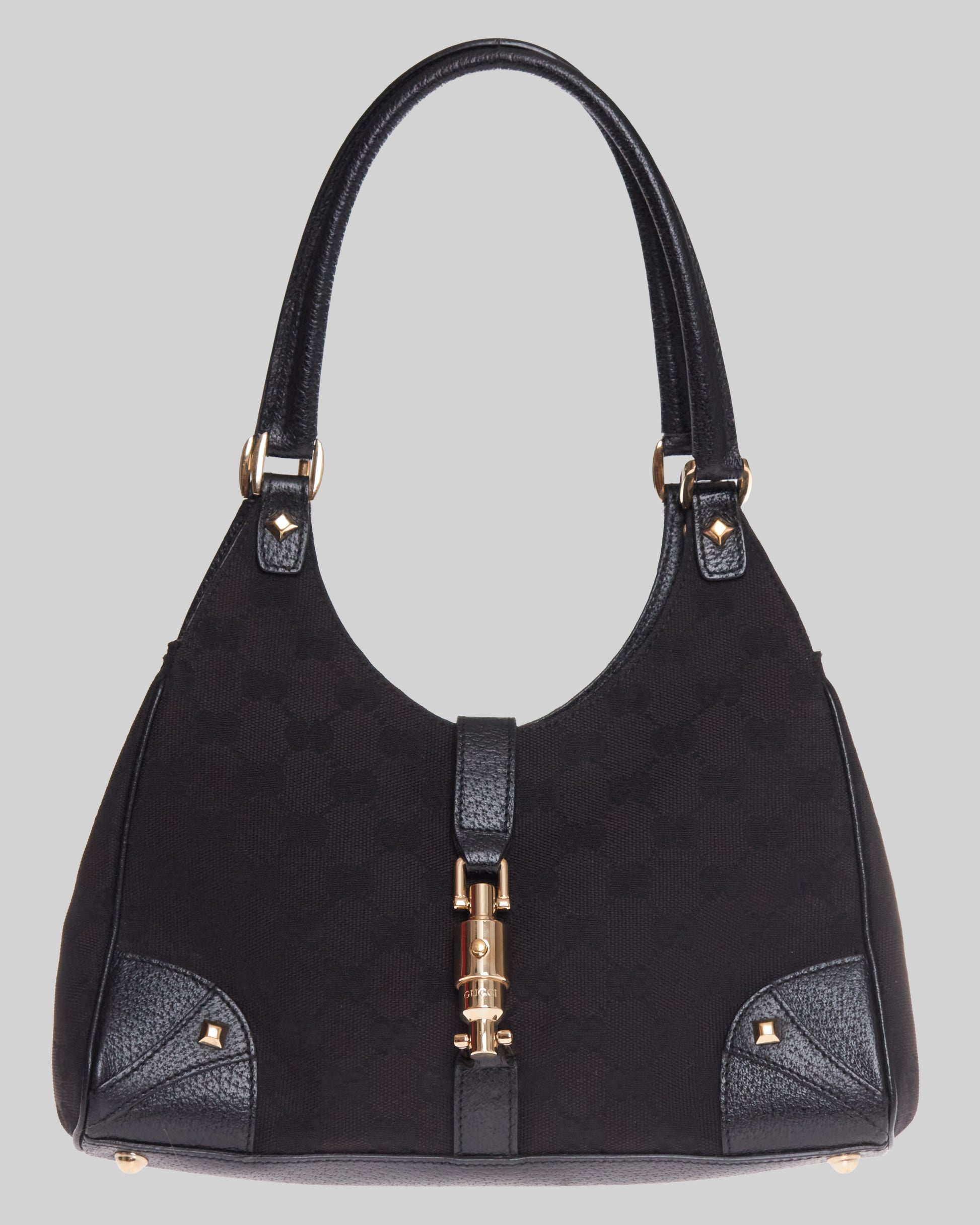 This Gucci Jackie cloth handbag has black GG canvas, black leather details and a rose-gold metal closure.