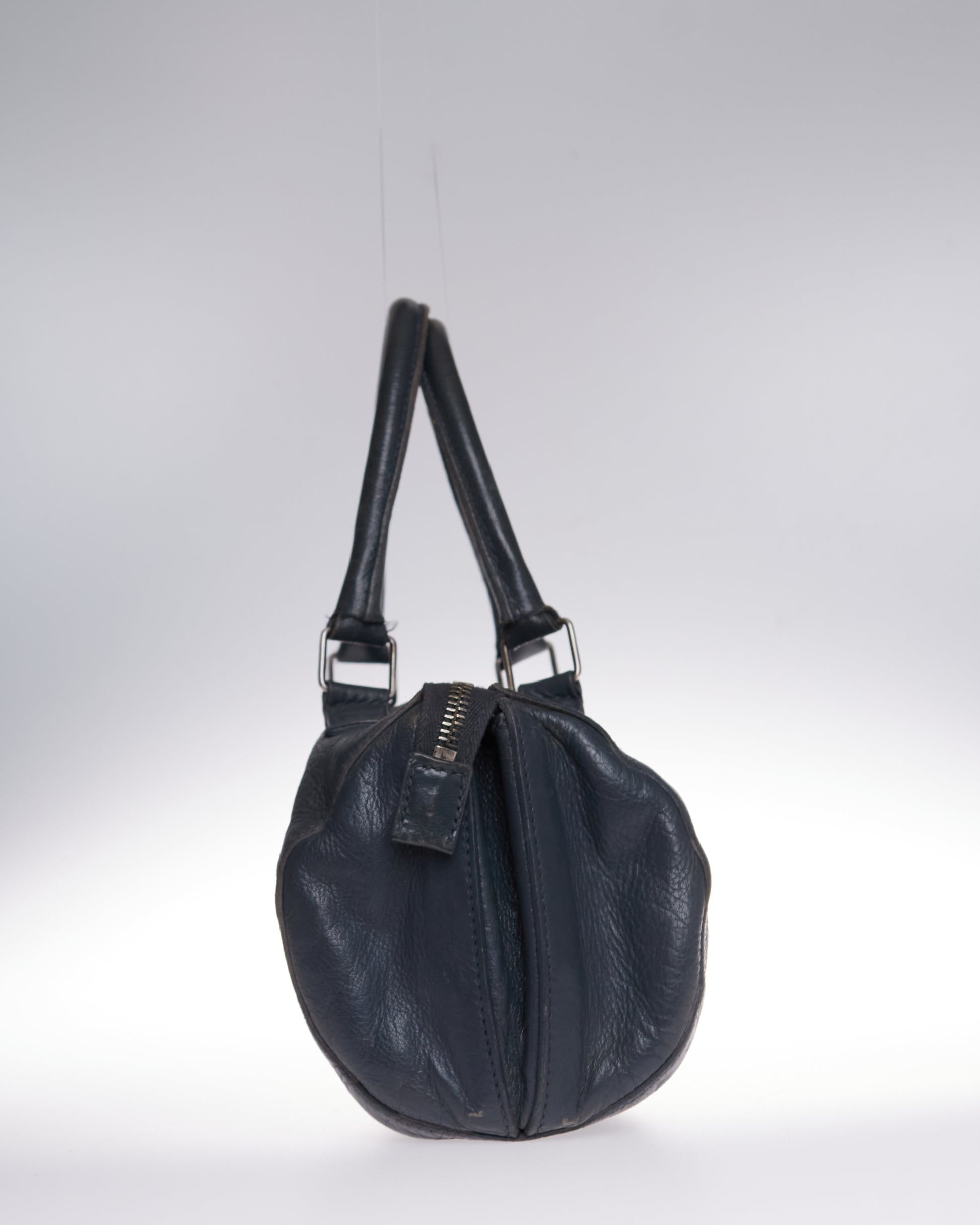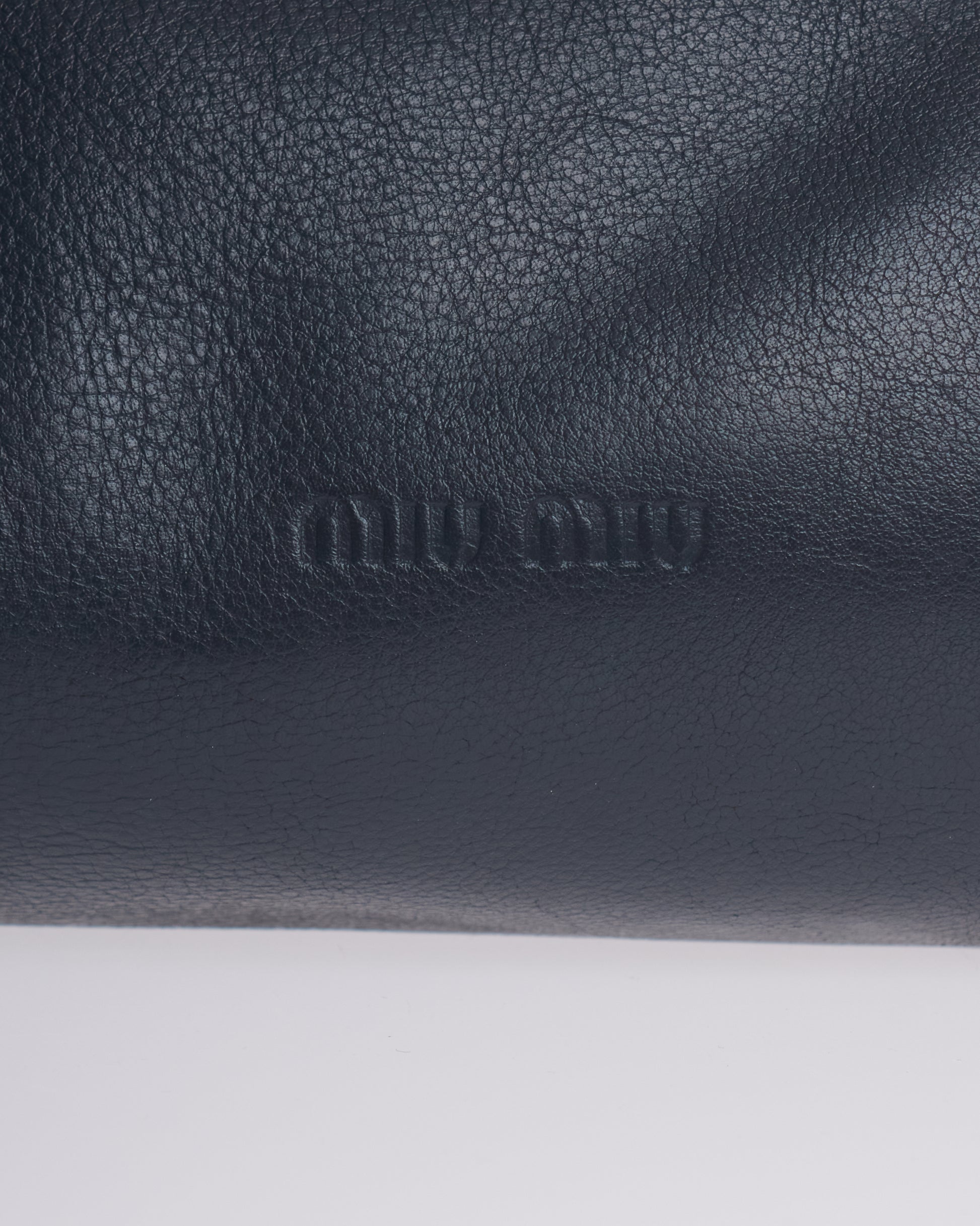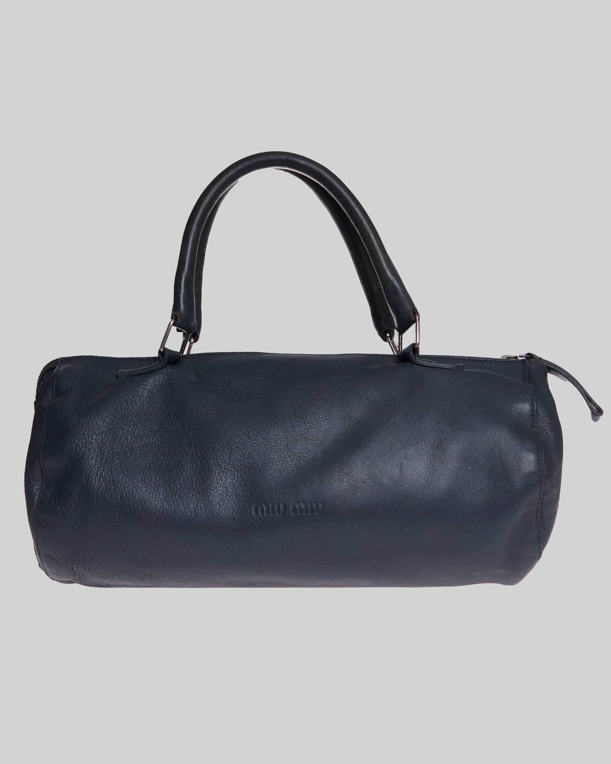 This Miu Miu Bowling Bag is a effortlessly chic piece crafted from soft blue leather. With its relaxed, slouchy silhouette.