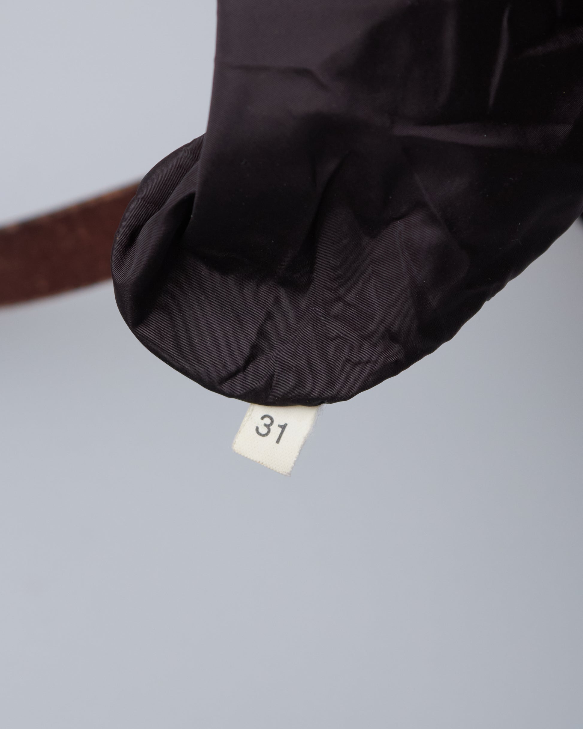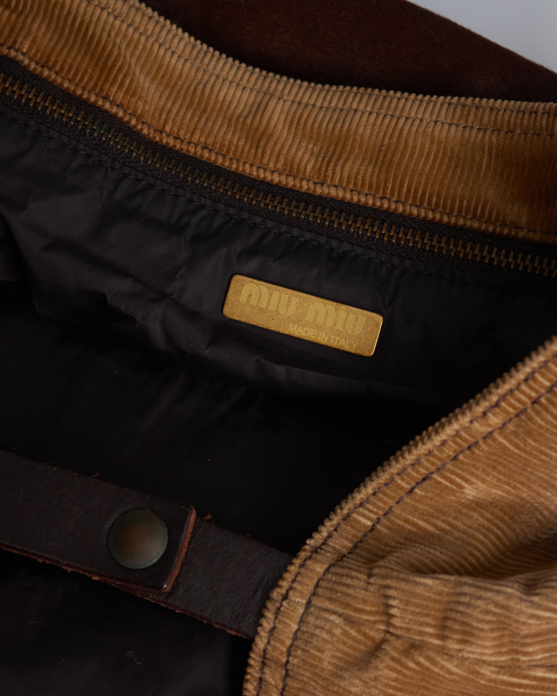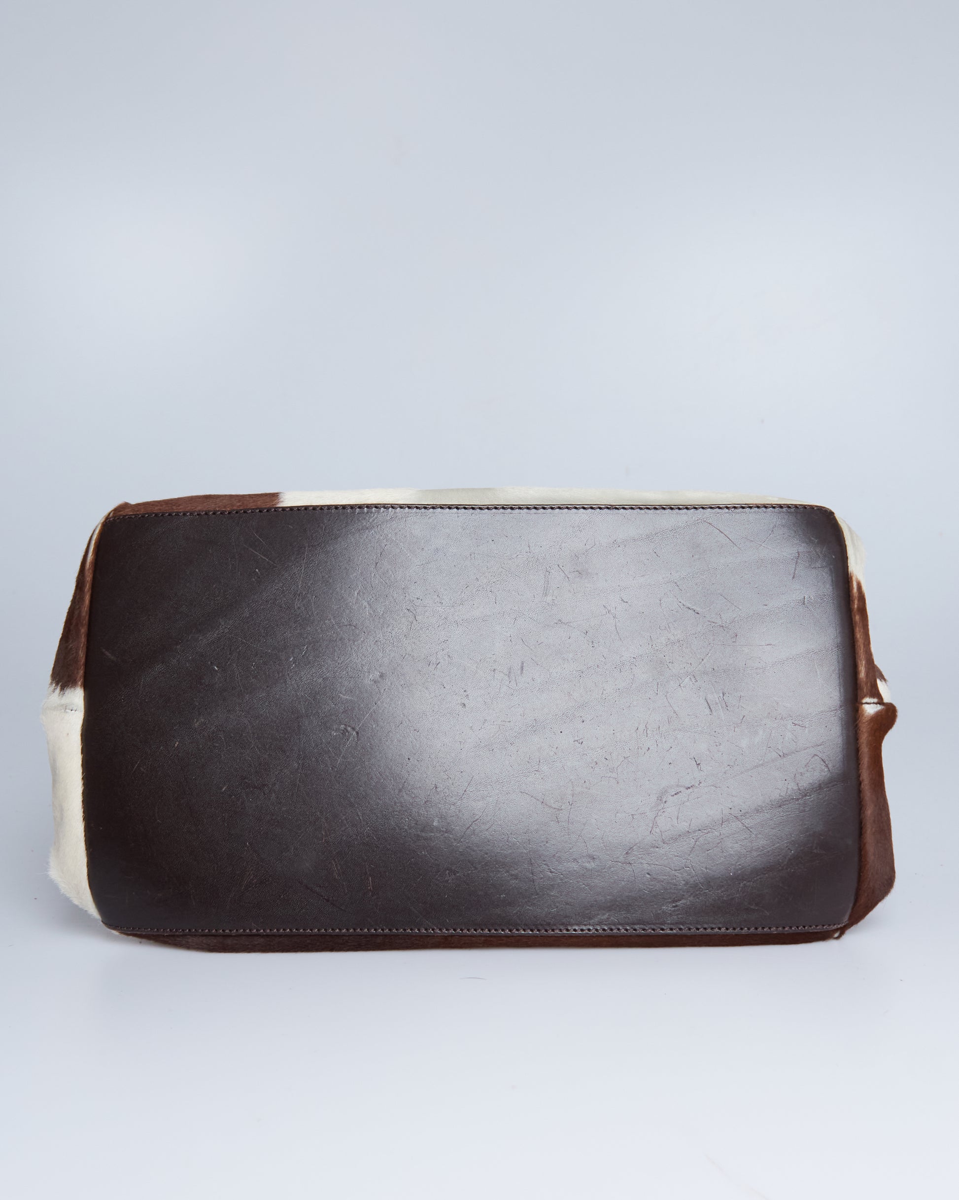 This Miu Miu tote bag has a unique exterior made from brown corduroy and pony hair cow pattern. It has brown leather shoulder straps.