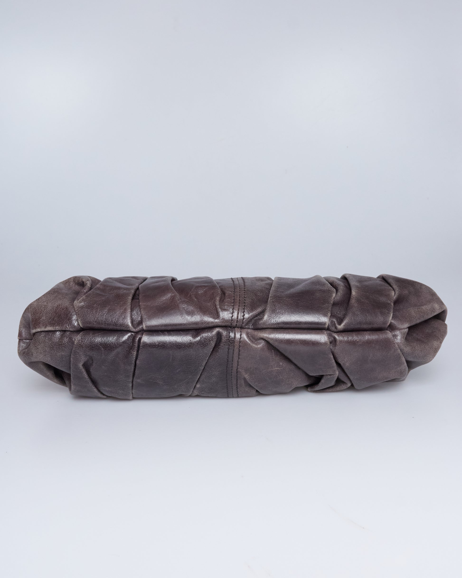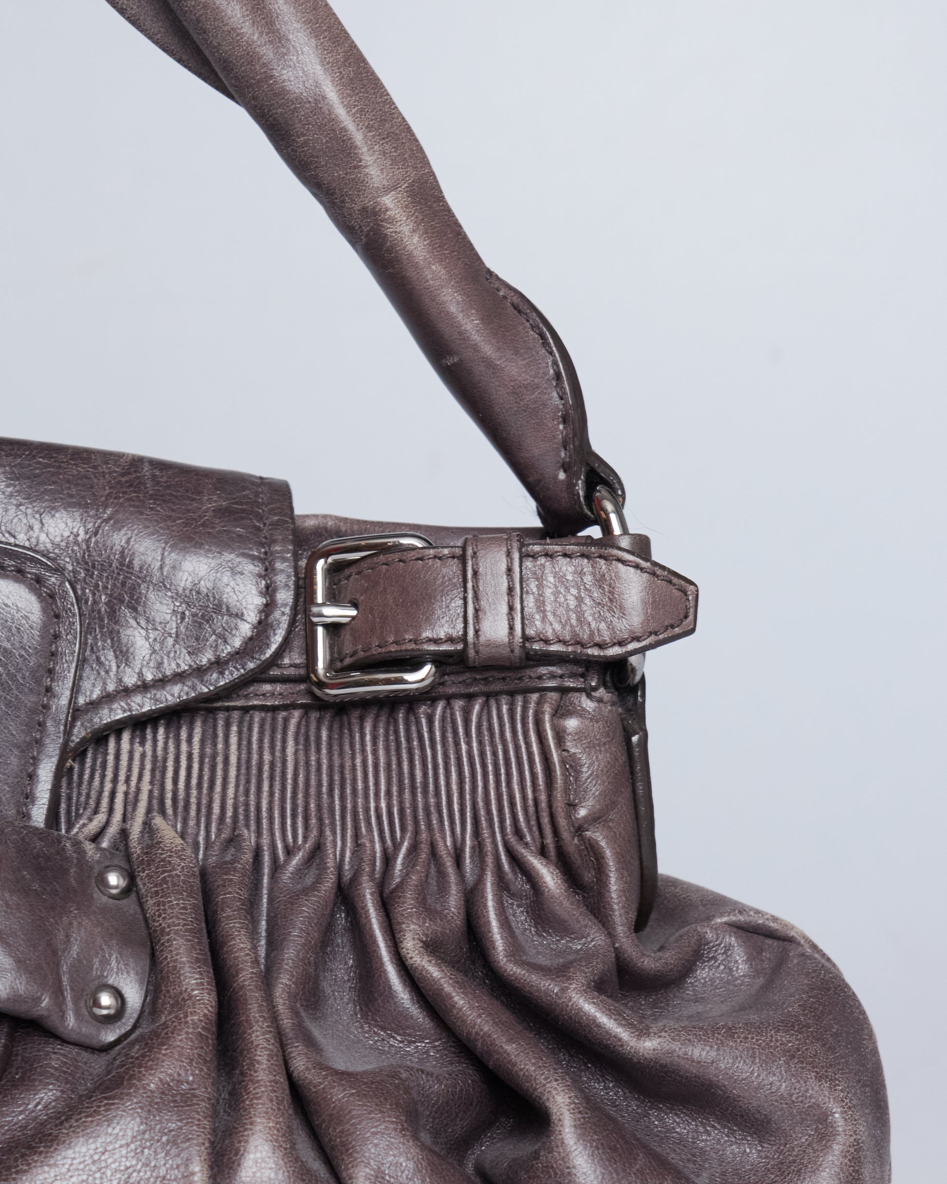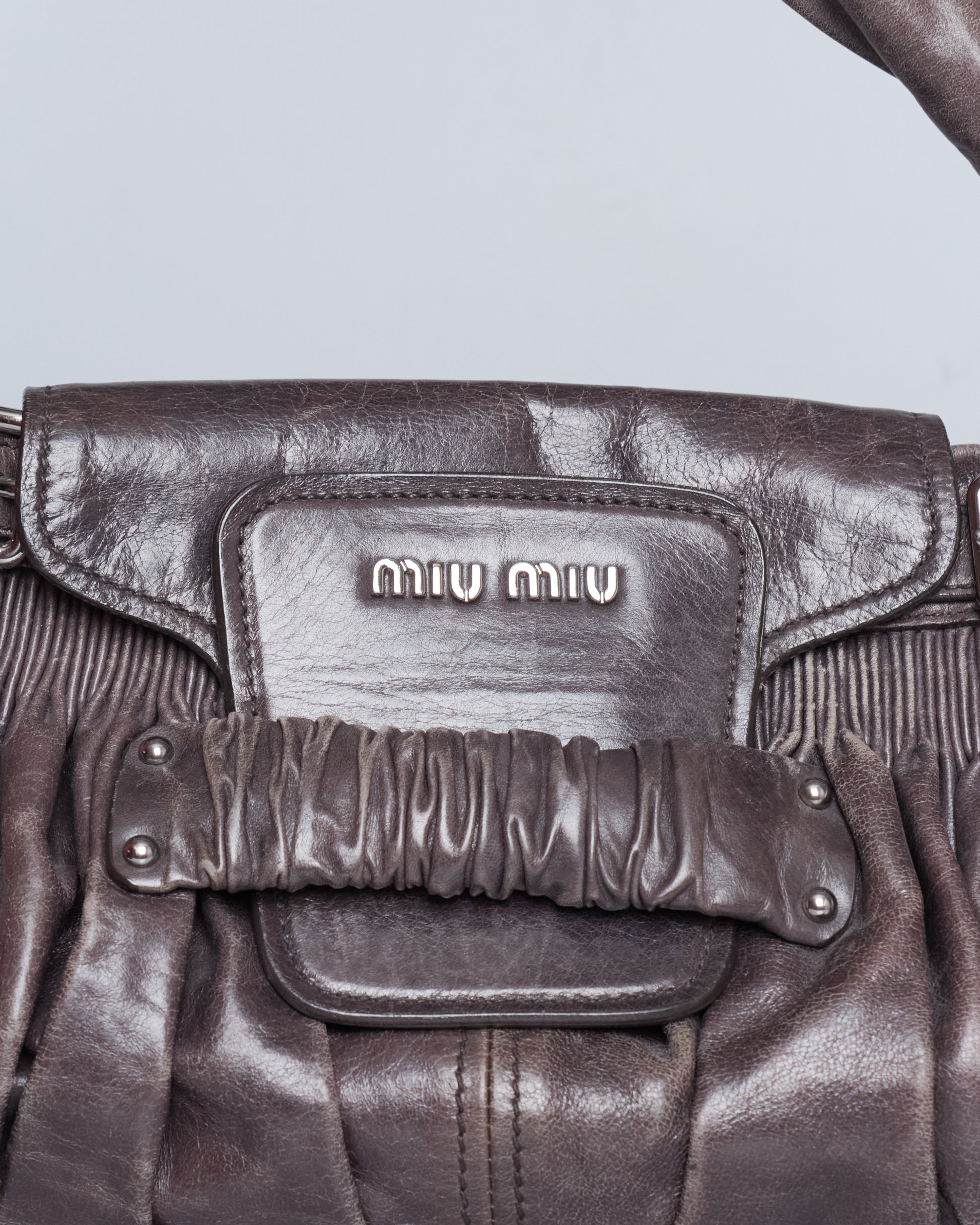 This Miu Miu Vitello Handbag is crafted from soft grey gathered leather and finished with silver-tone hardware. The ruched detailing and structured flap with logo plaque create a refined yet effortless look.