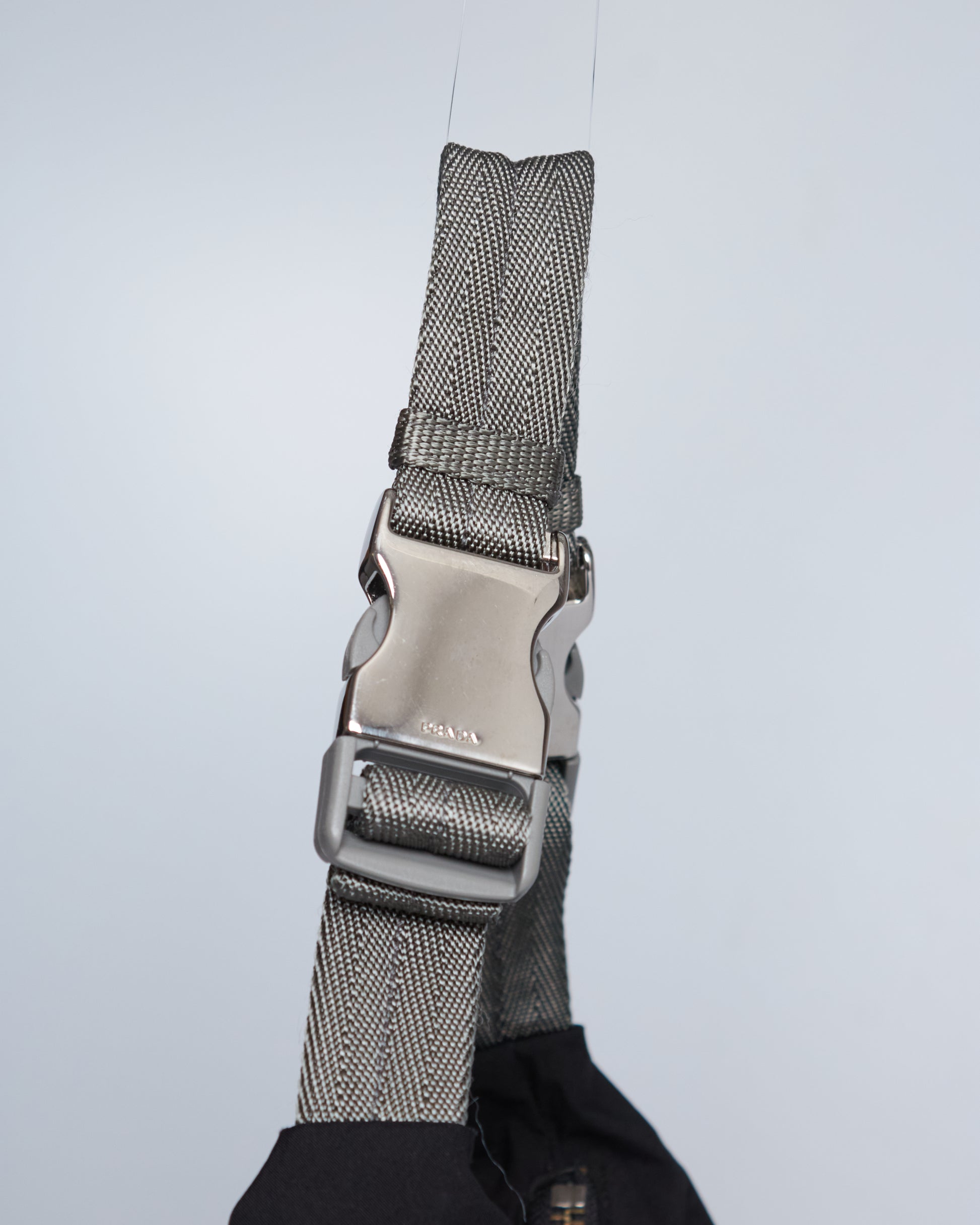 This rare Prada Sport shoulder bag from 1999 features a mix of grey nylon mesh, soft goat fur panels, and metal hardware details. The sporty silhouette is elevated by red Prada Sport branding and industrial strap accents.