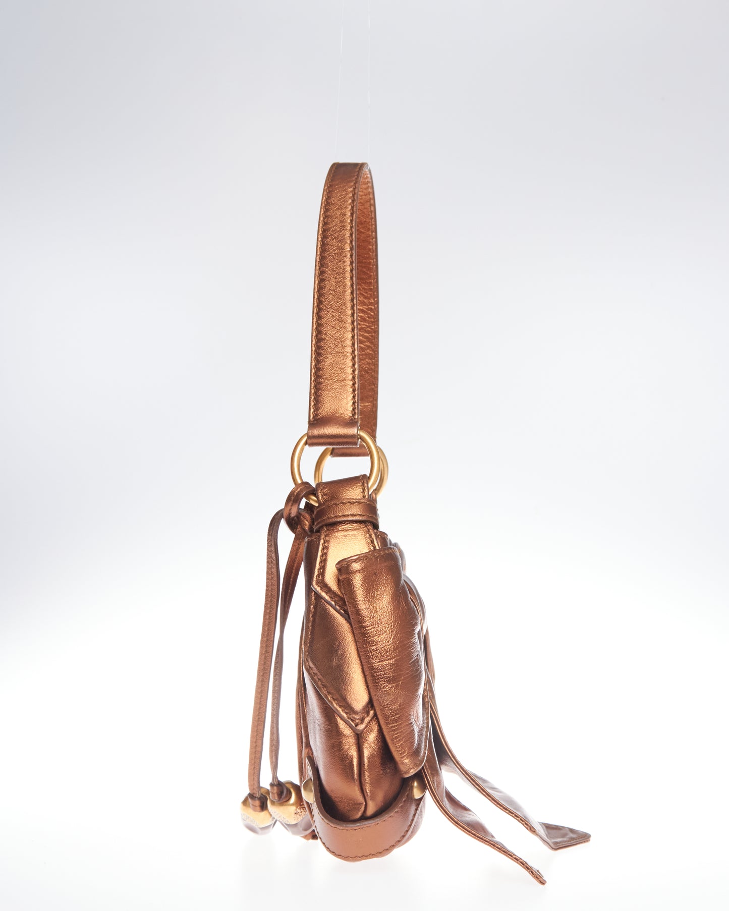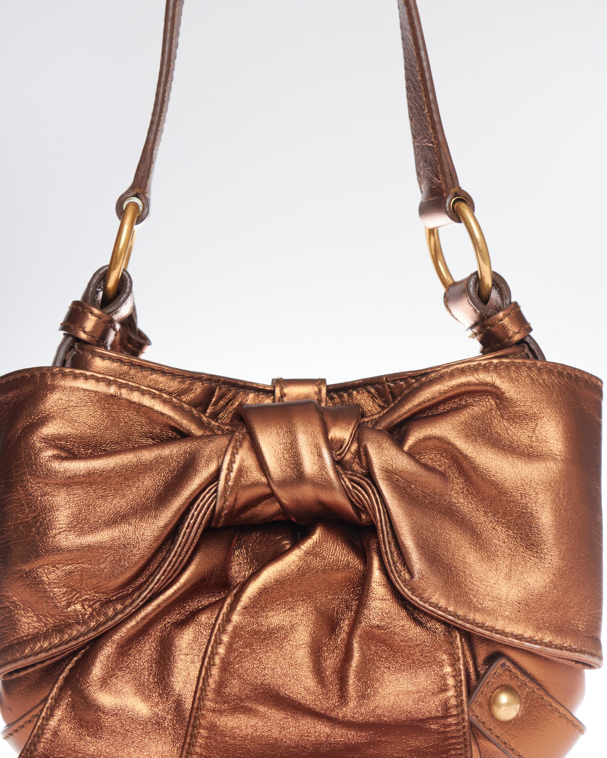 This Yves Saint Laurent Bow Bag is a striking design in metallic copper satin leather. The oversized bow on the front adds a playful yet sophisticated touch, making it a standout piece from YSL’s early 2000s collections.
