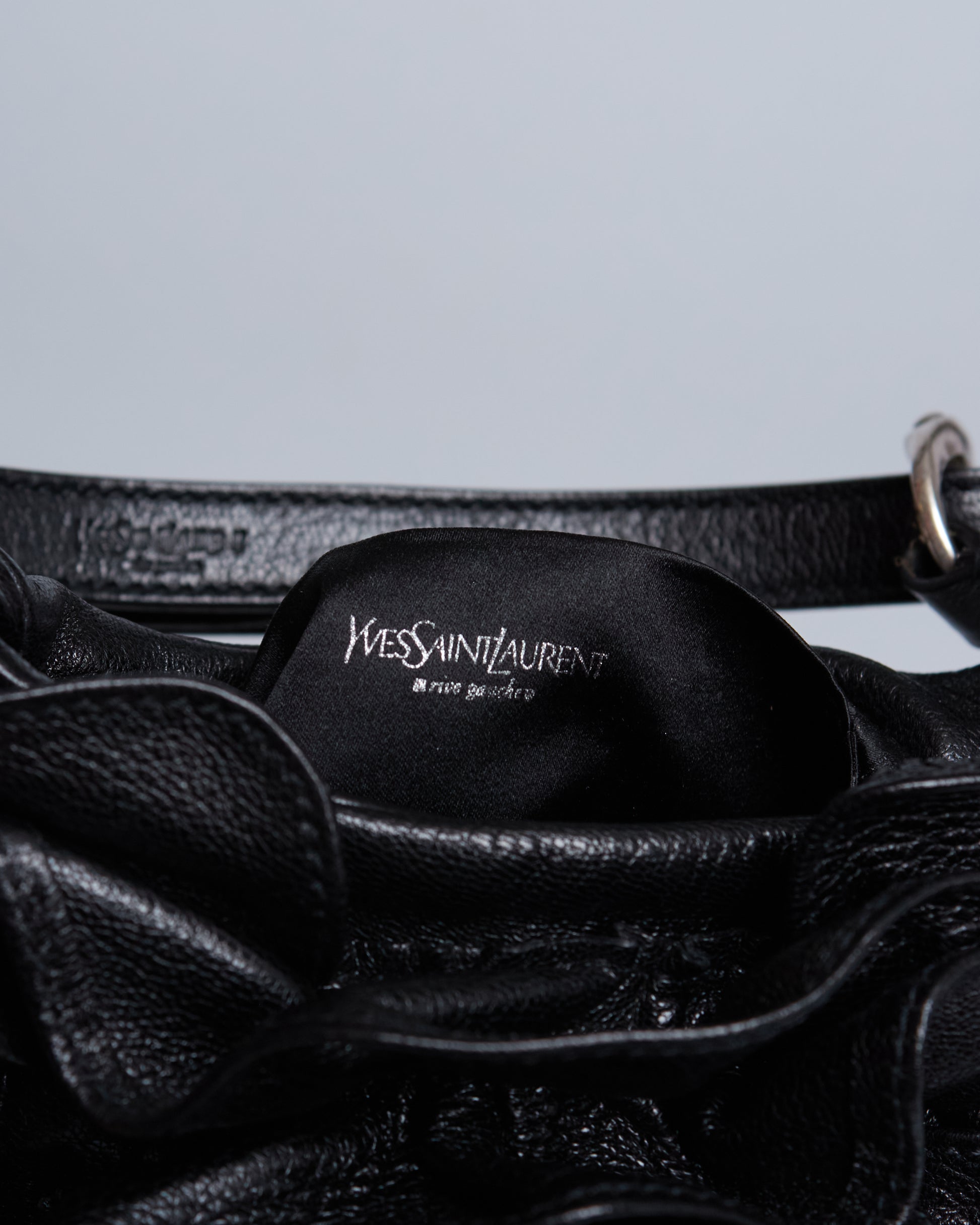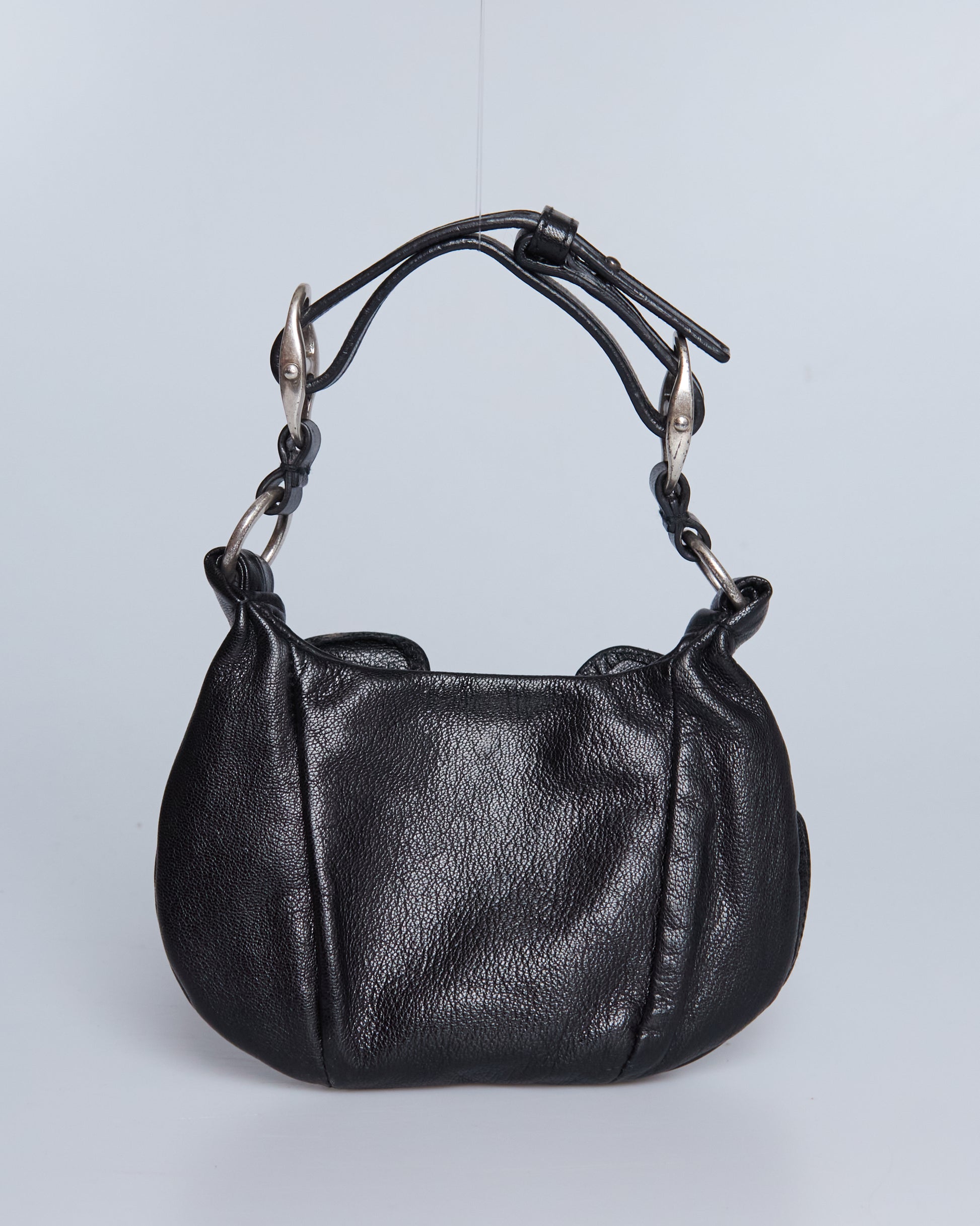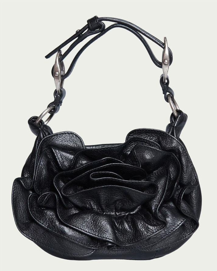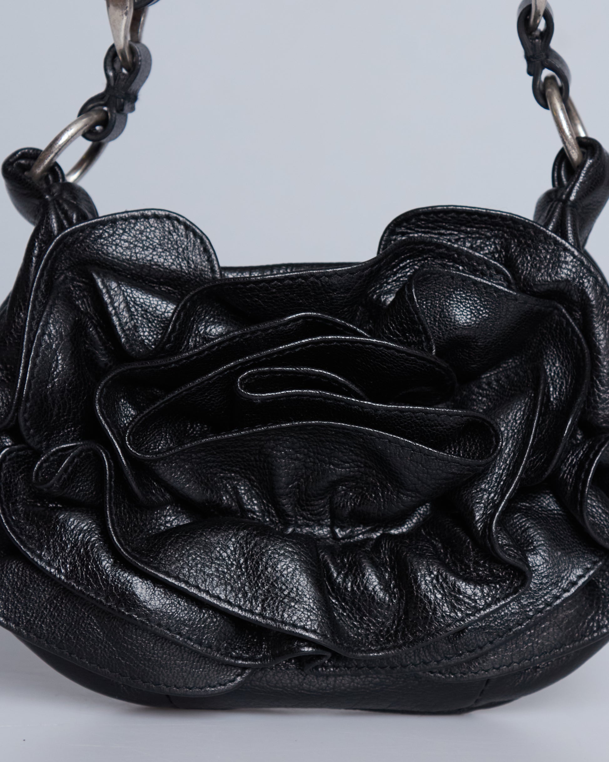 This Saint Laurent Nadja Rose Mini Bag has a black leather exterior, a single strap with silver metal hardware.