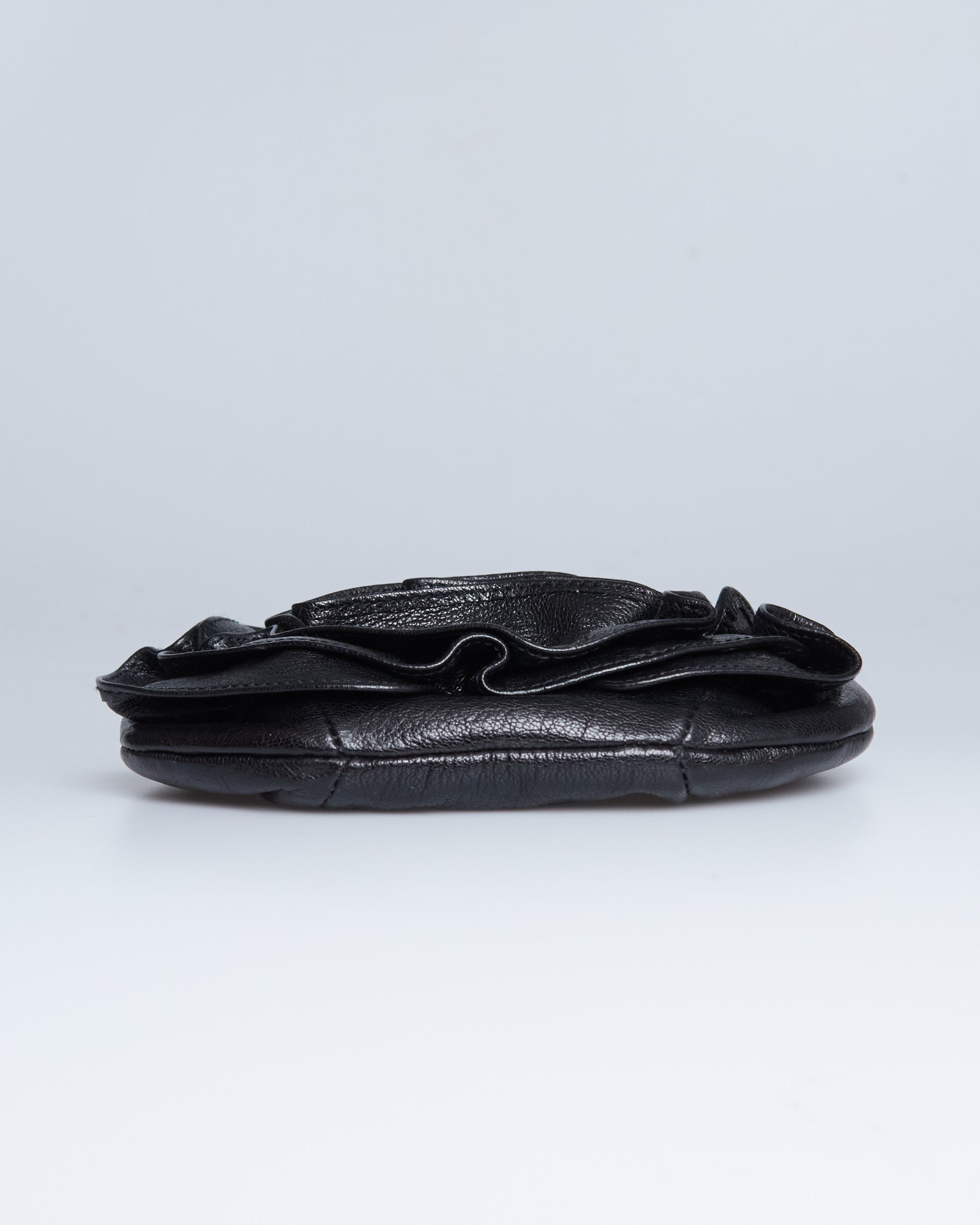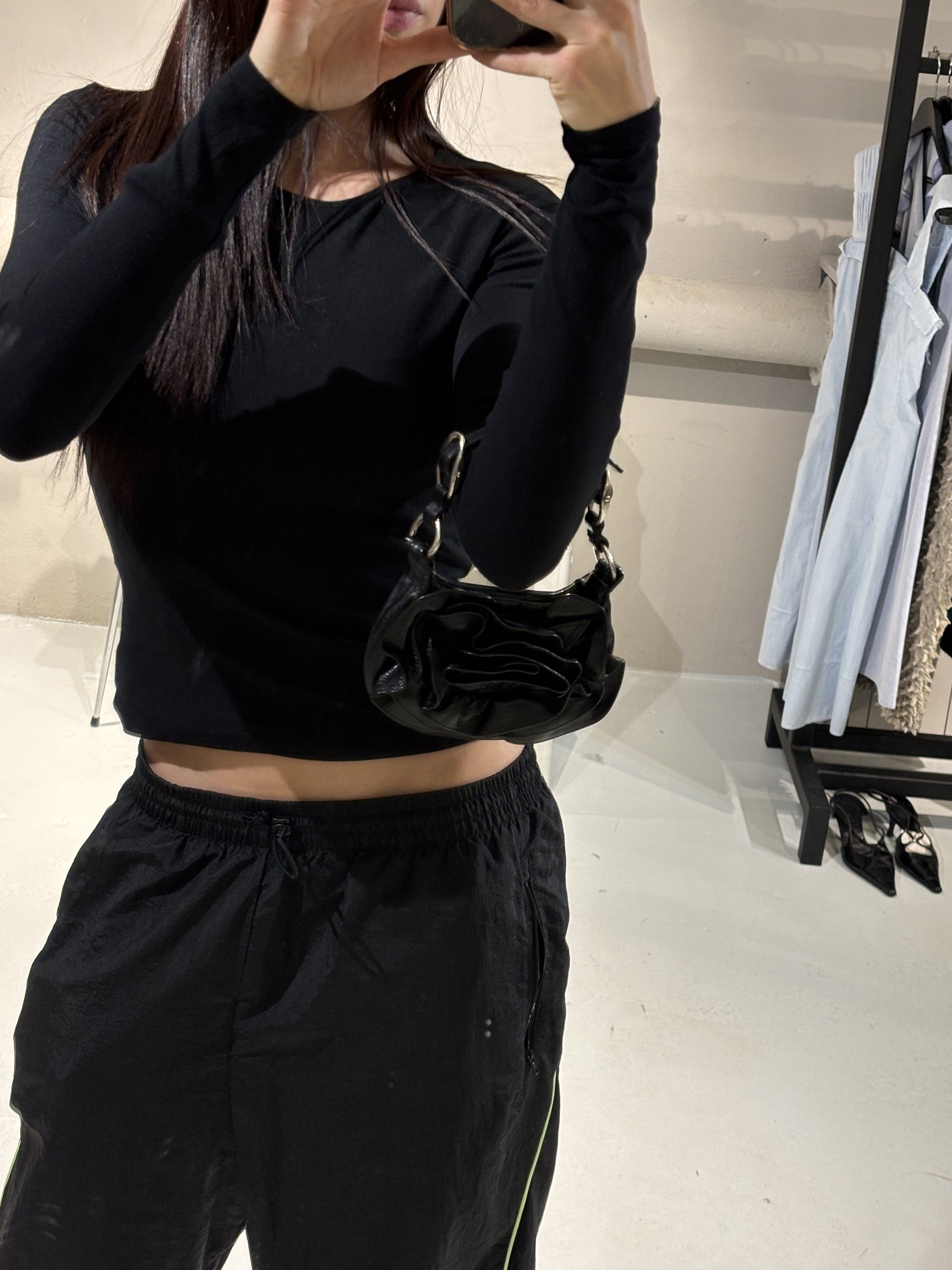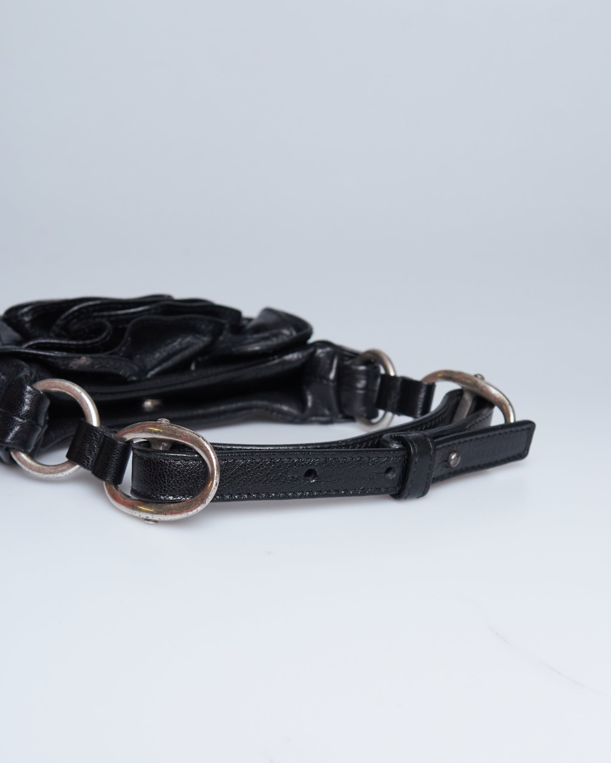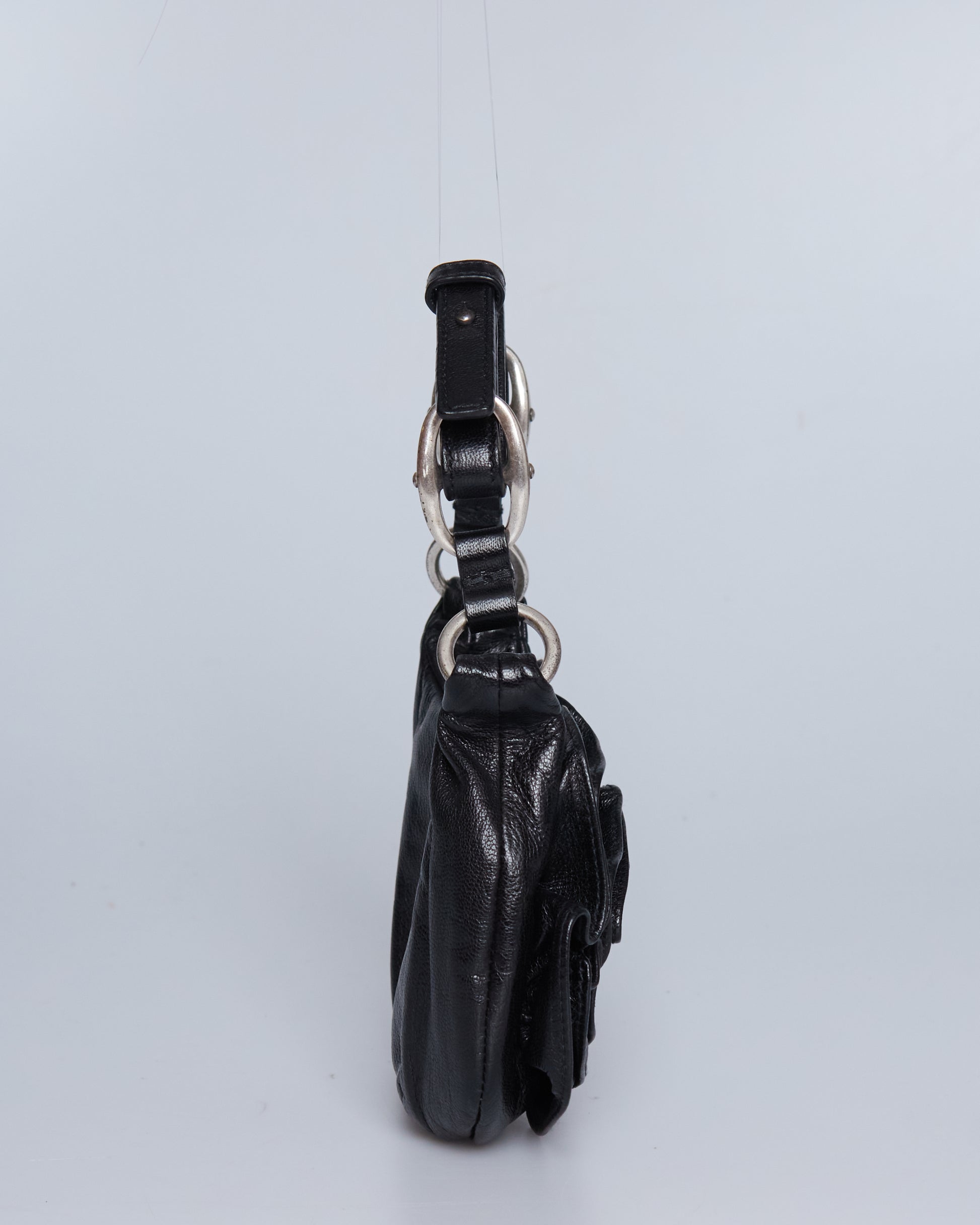 This Saint Laurent Nadja Rose Mini Bag has a black leather exterior, a single strap with silver metal hardware.