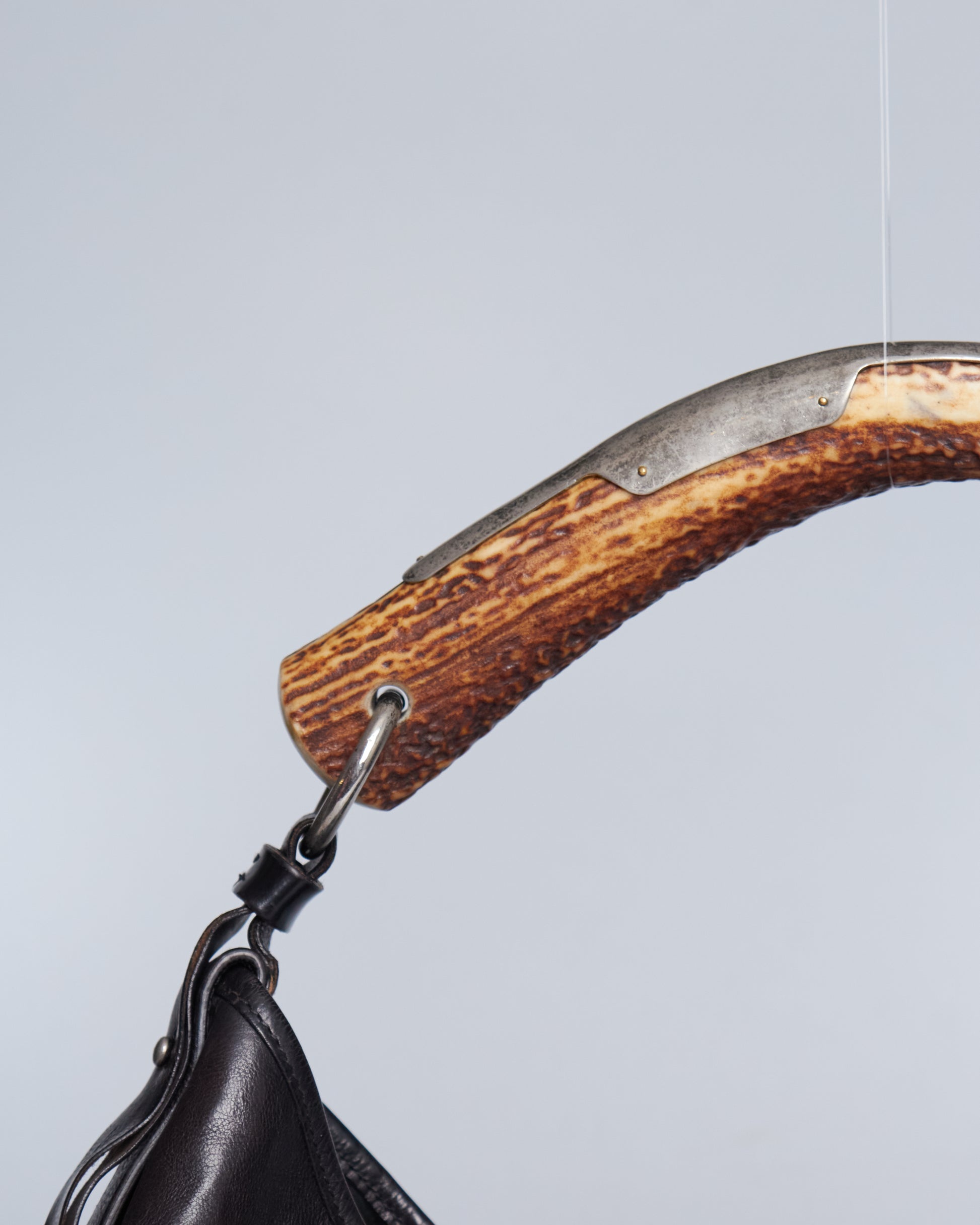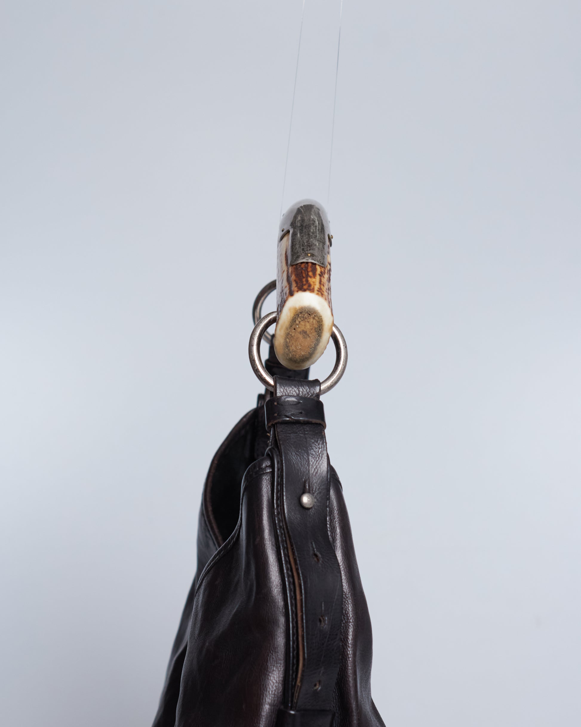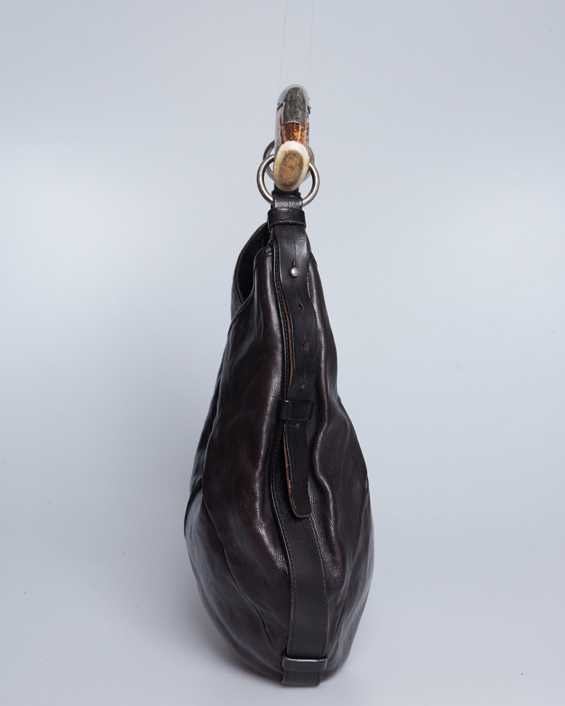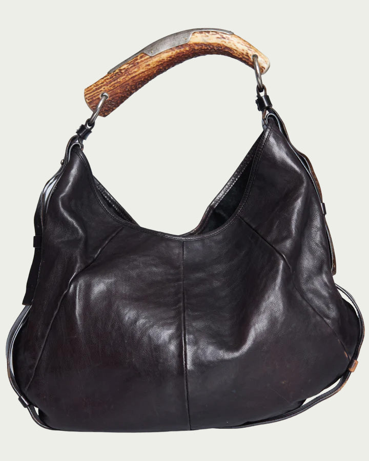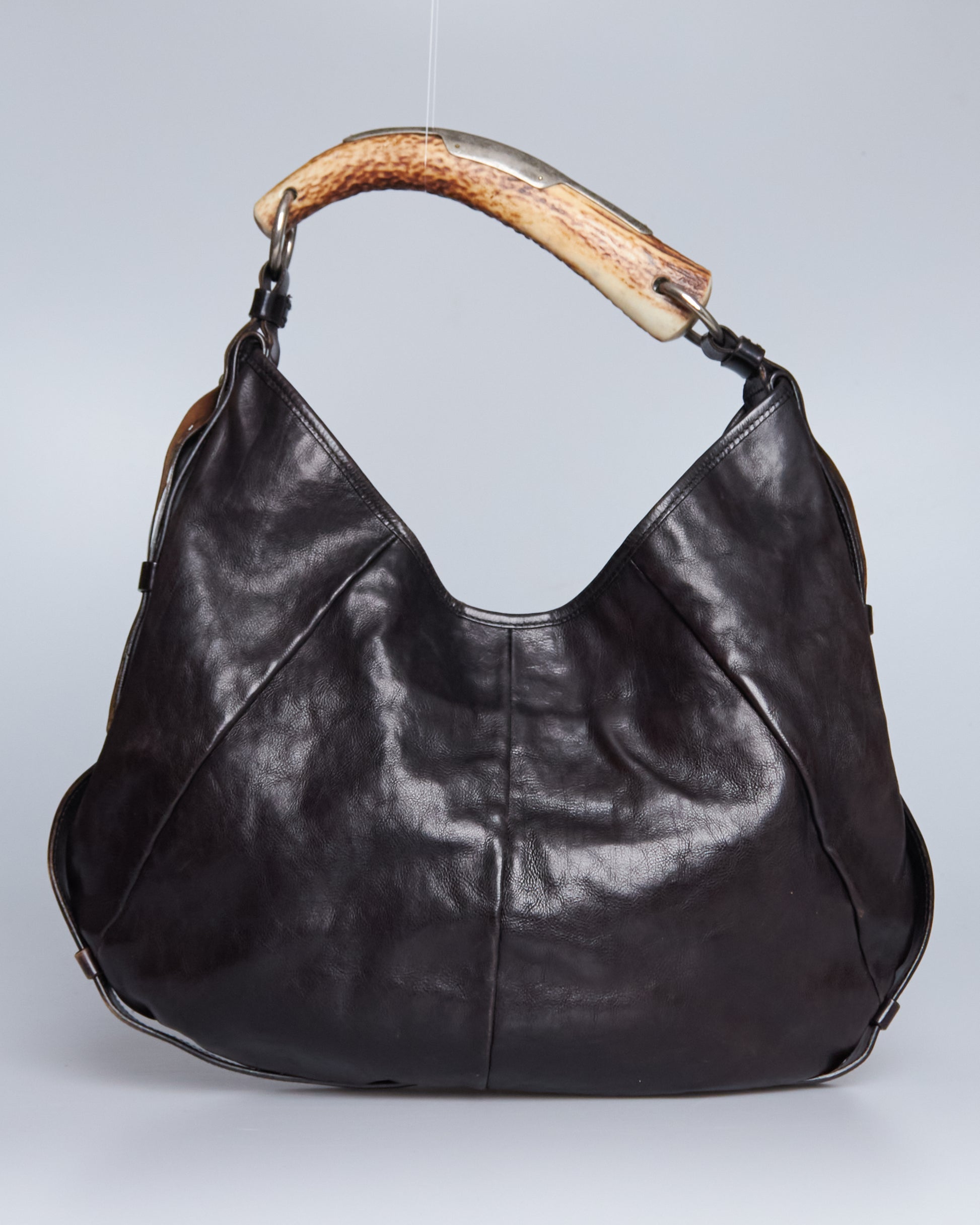 This Saint Laurent Mombasa by Tom Ford 2002 has a brown leather exterior, a horn handle with silver metal hardware and silver-tone details.