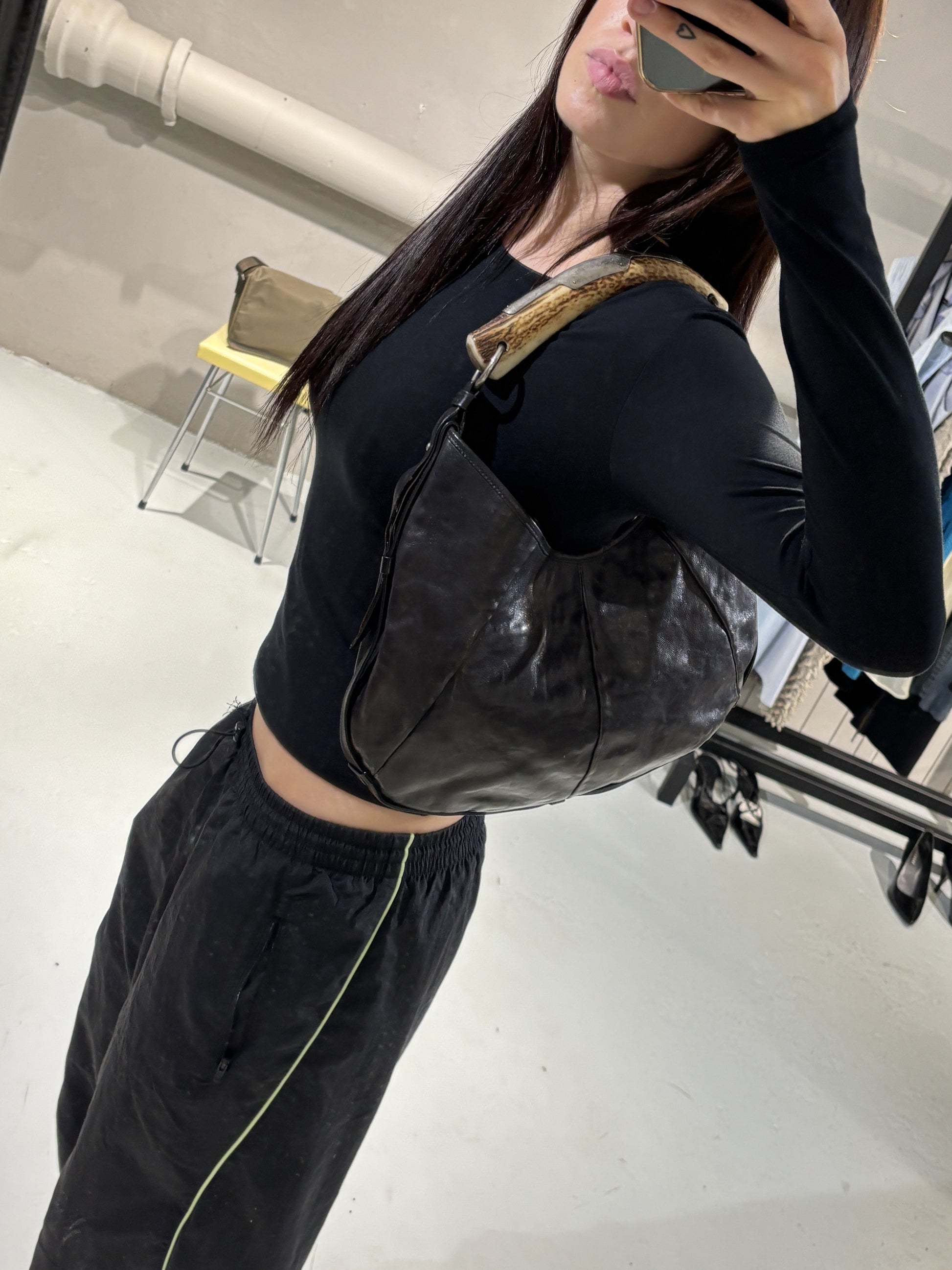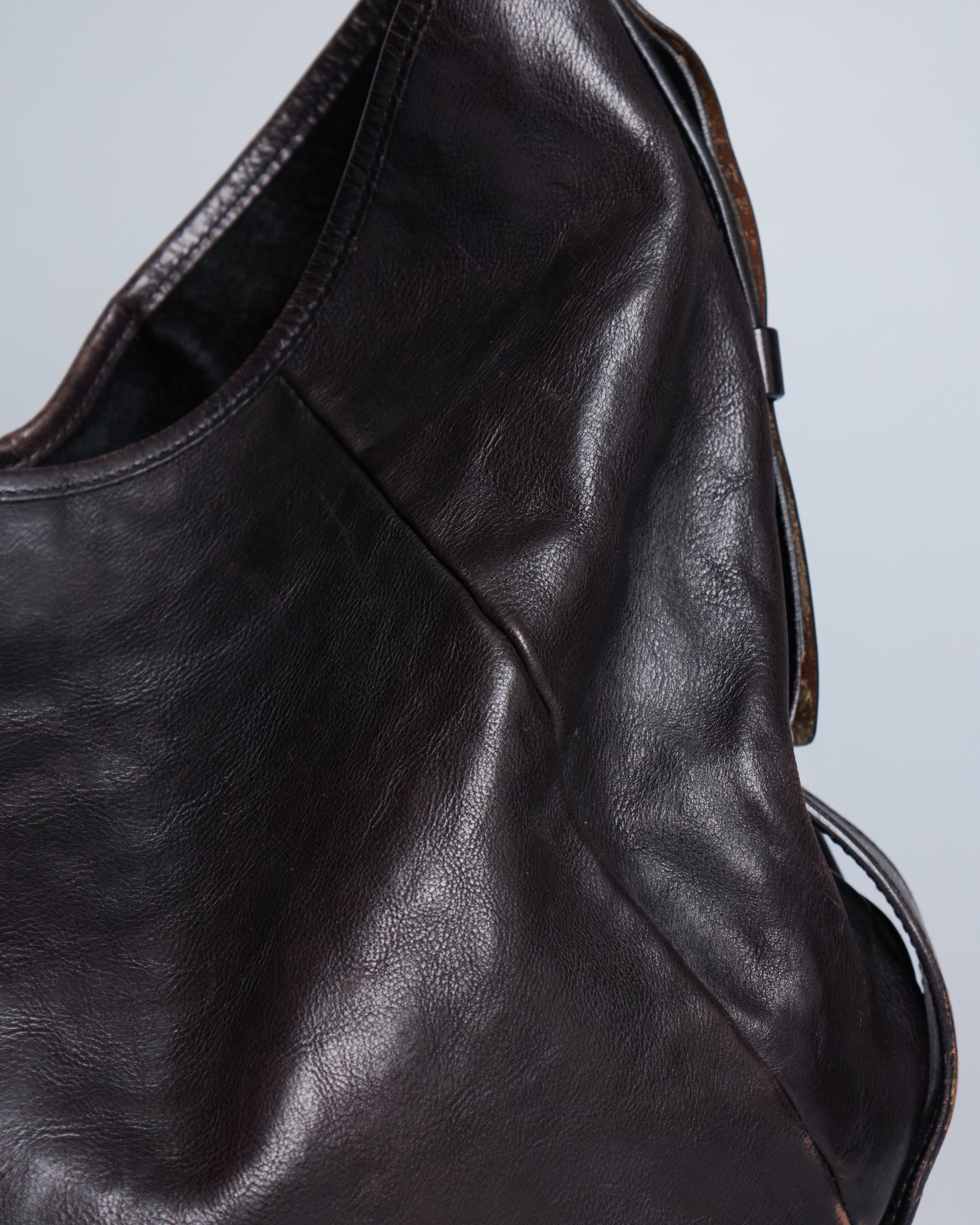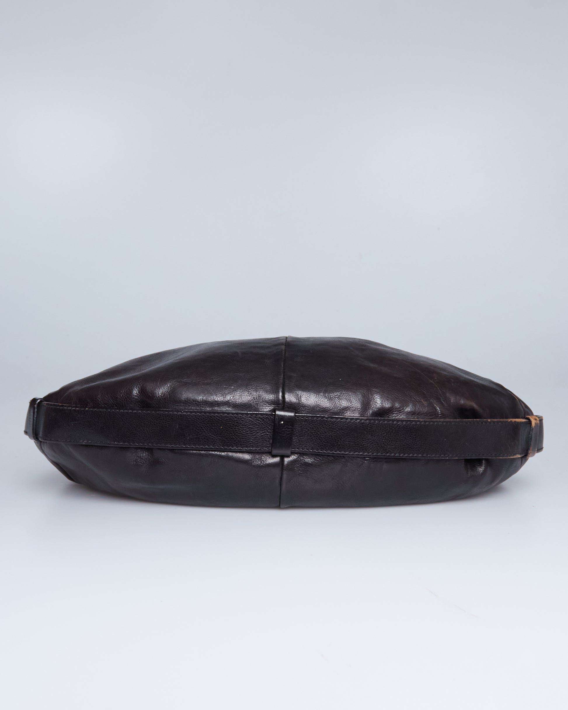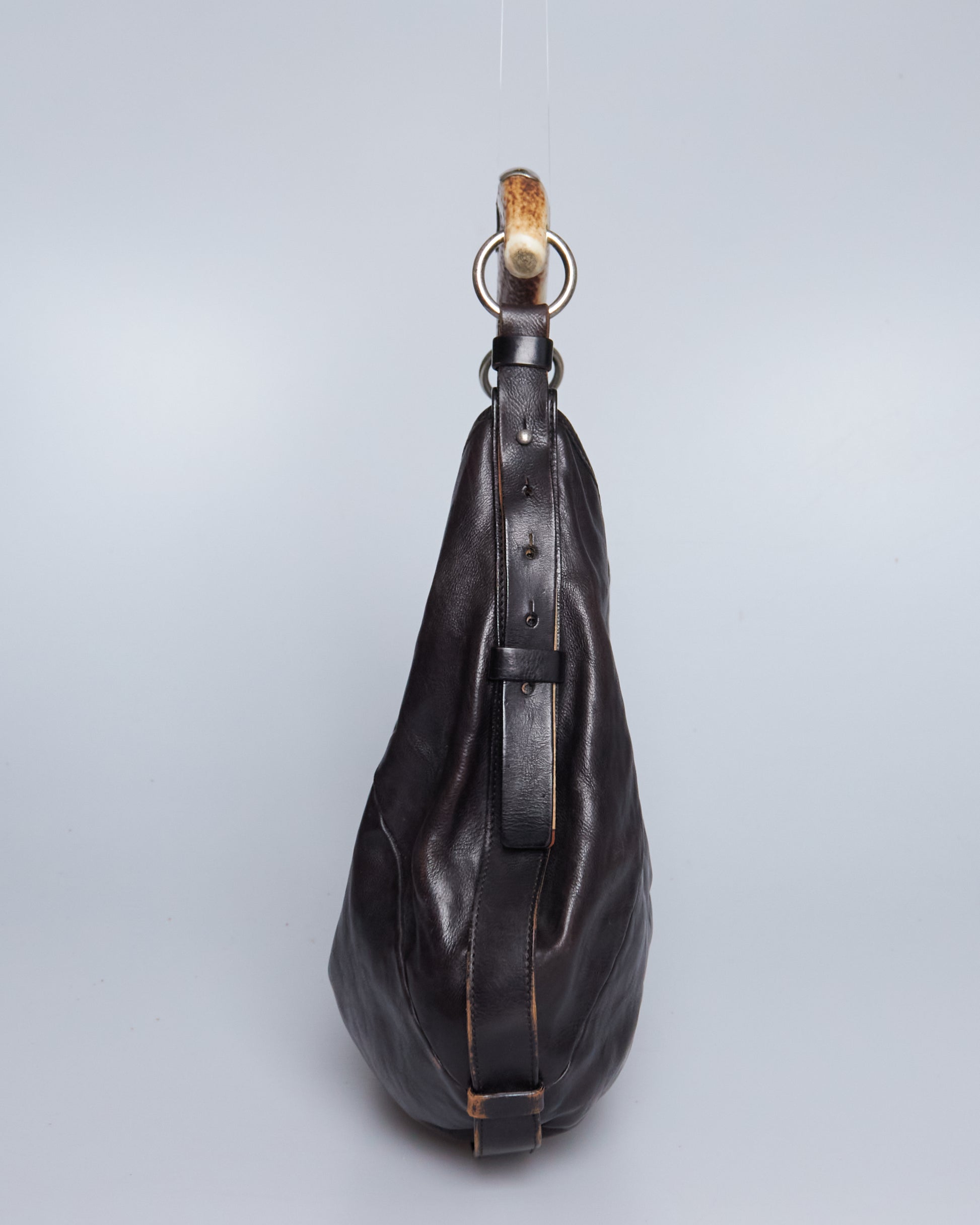 This Saint Laurent Mombasa by Tom Ford 2002 has a brown leather exterior, a horn handle with silver metal hardware and silver-tone details.