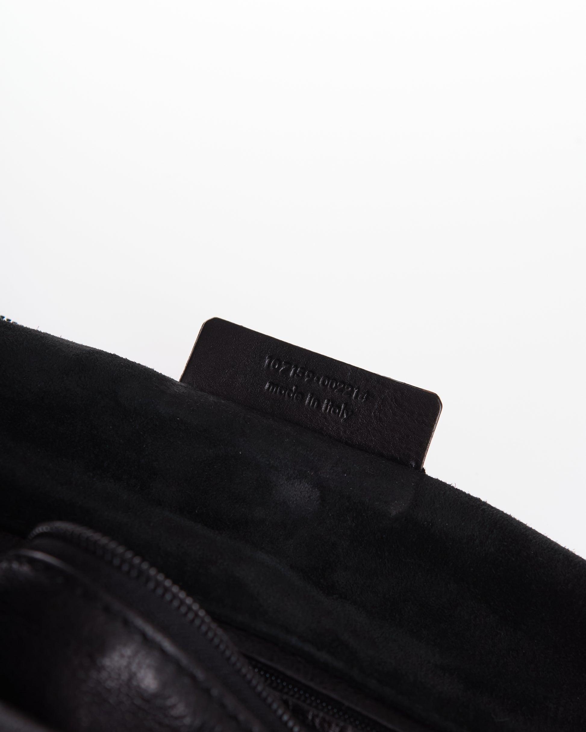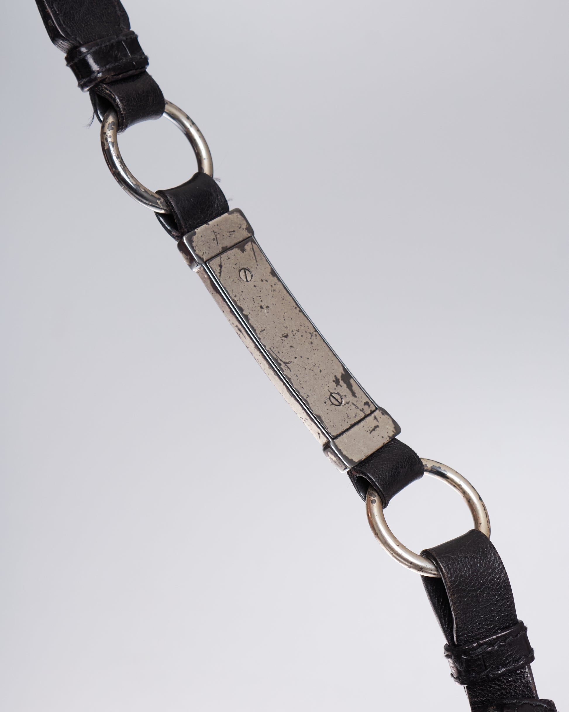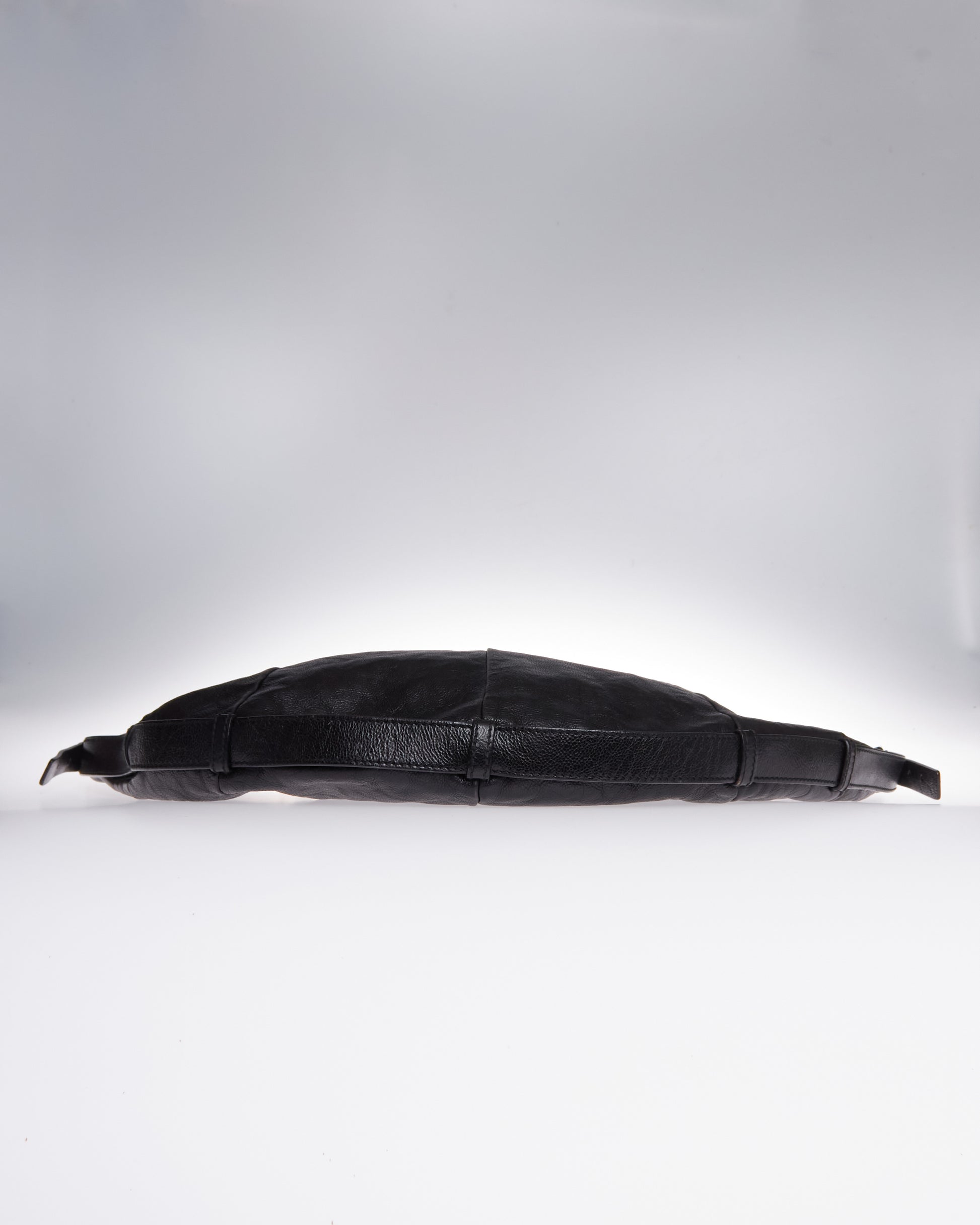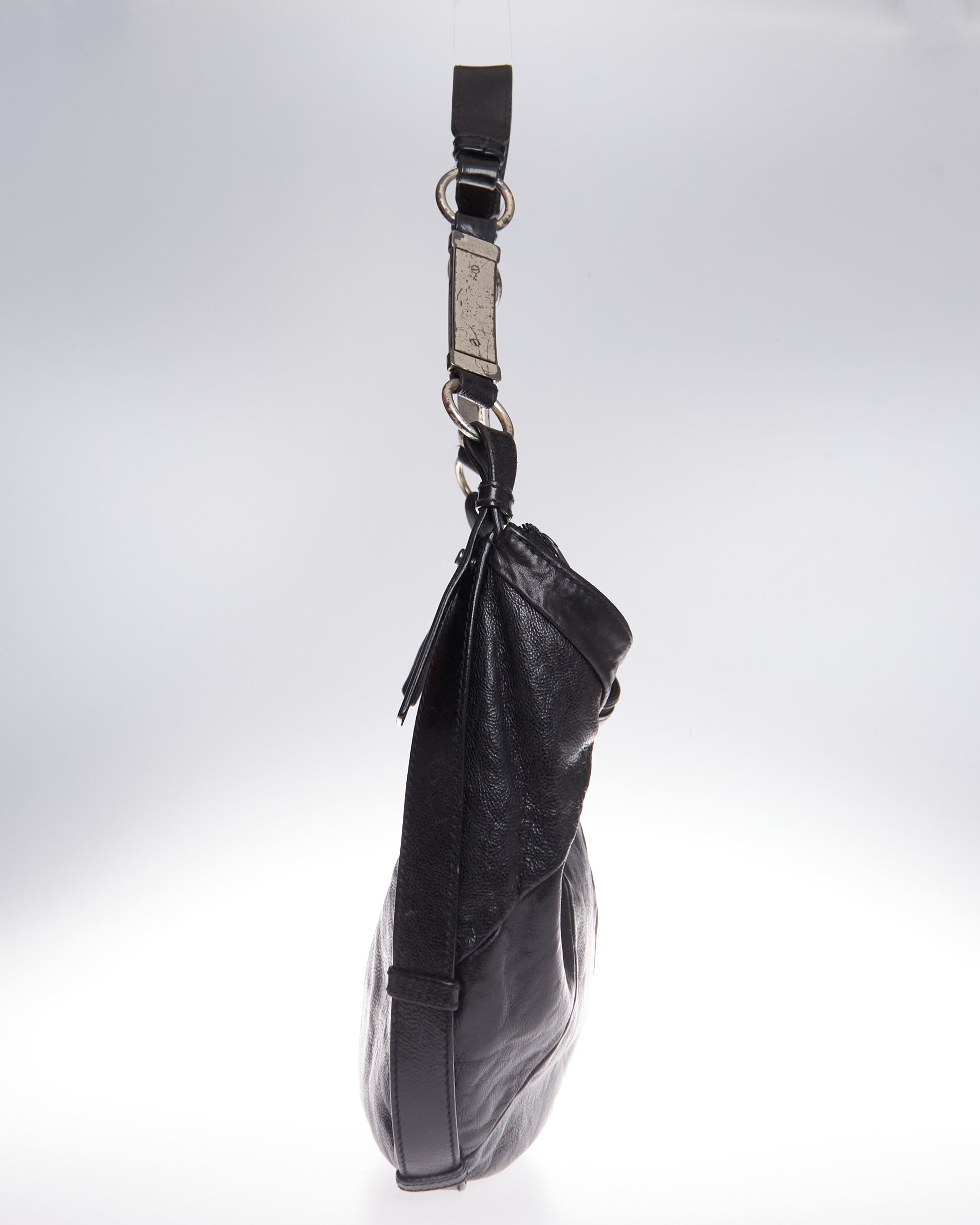 This Saint Laurent Big Mombasa by Tom Ford 2002 has a black leather exterior, a single adjustable strap with silver metal hardware and silver-tone details. You can wear it crossbody and as a shoulderbag.