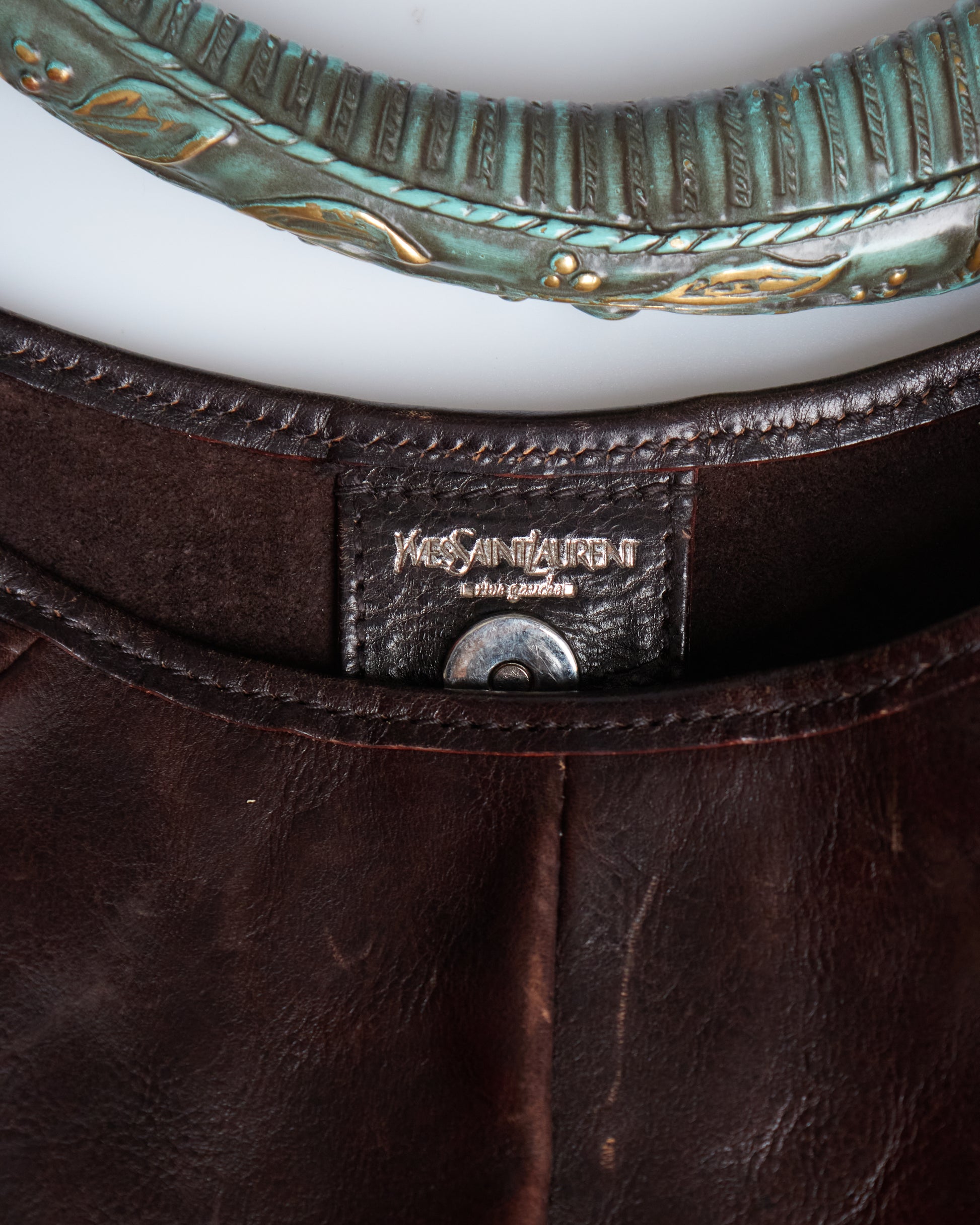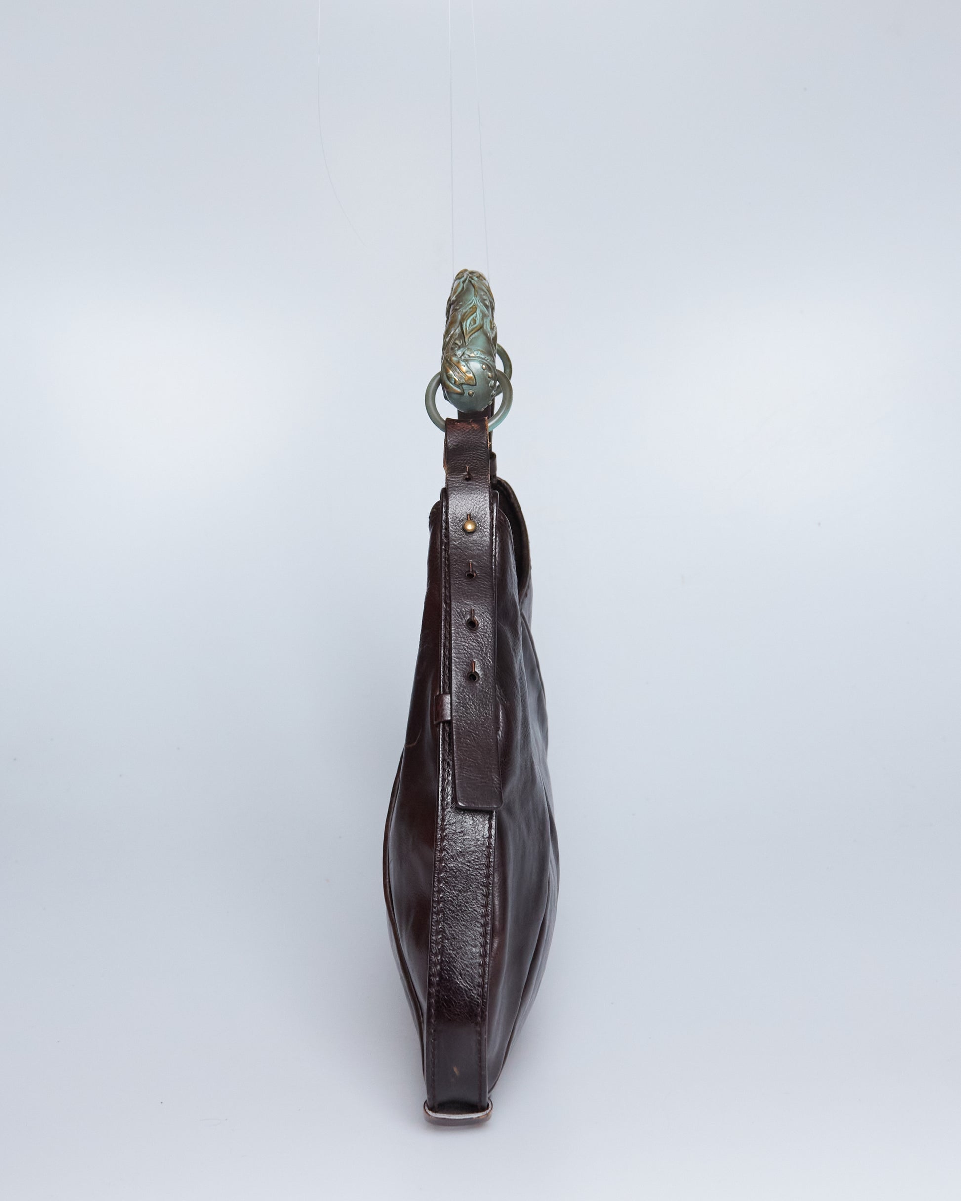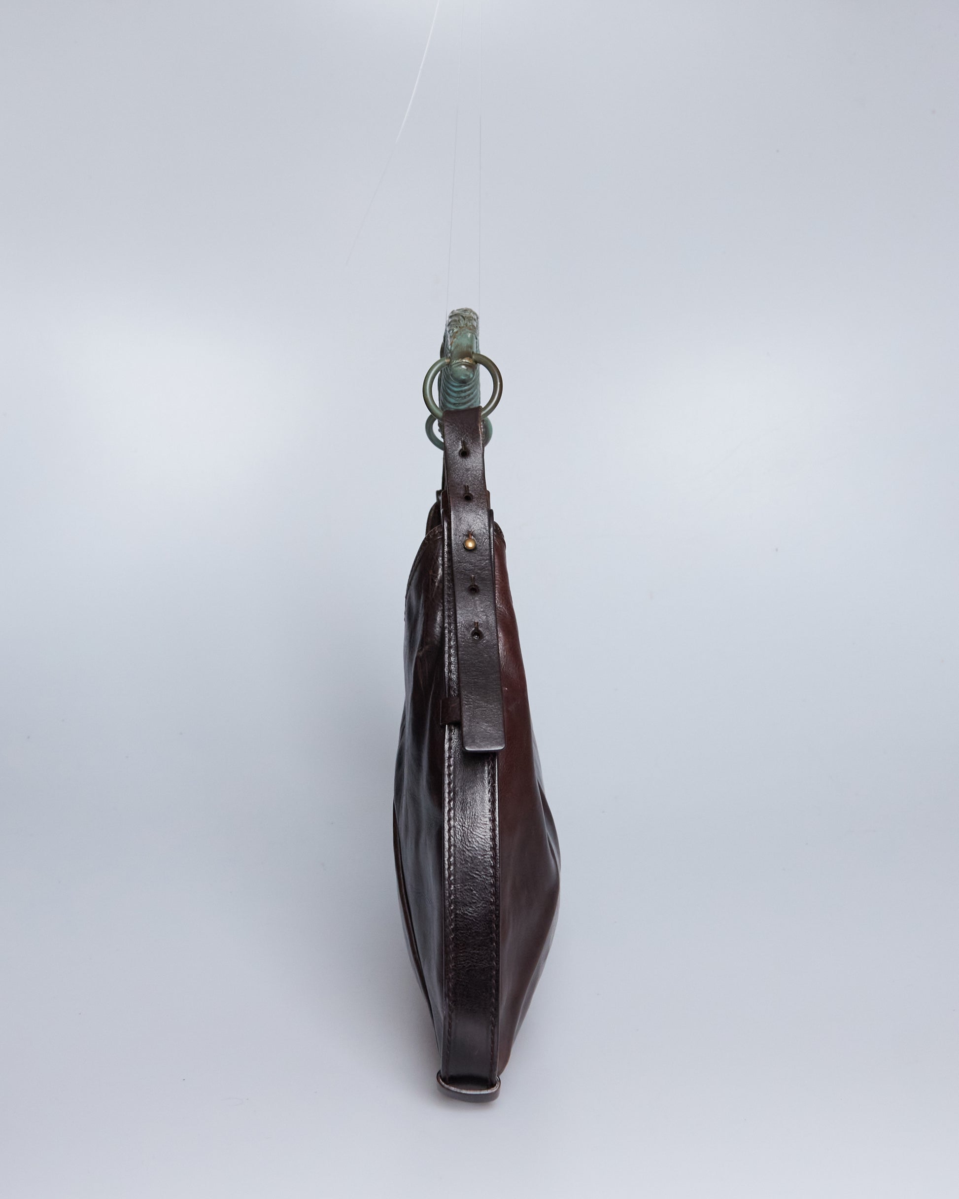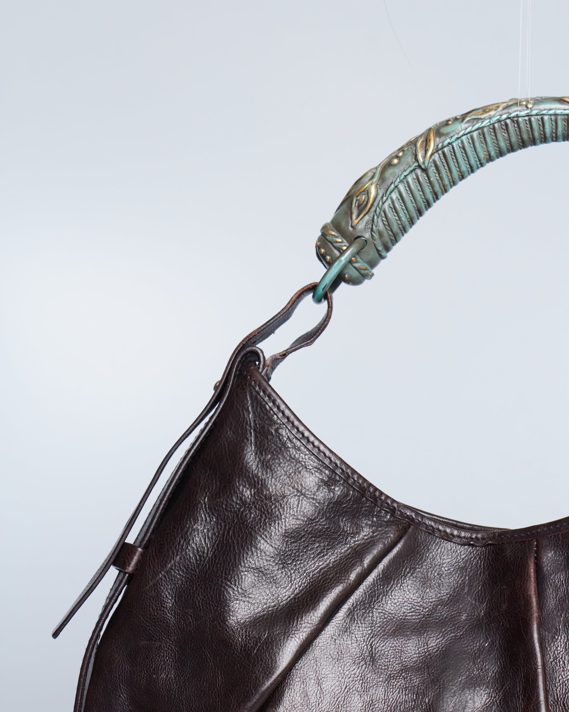 This Saint Laurent Mombasa by Tom Ford 2002 has a brown leather exterior, a horn handle with silver/blue metal hardware and silver-tone details.