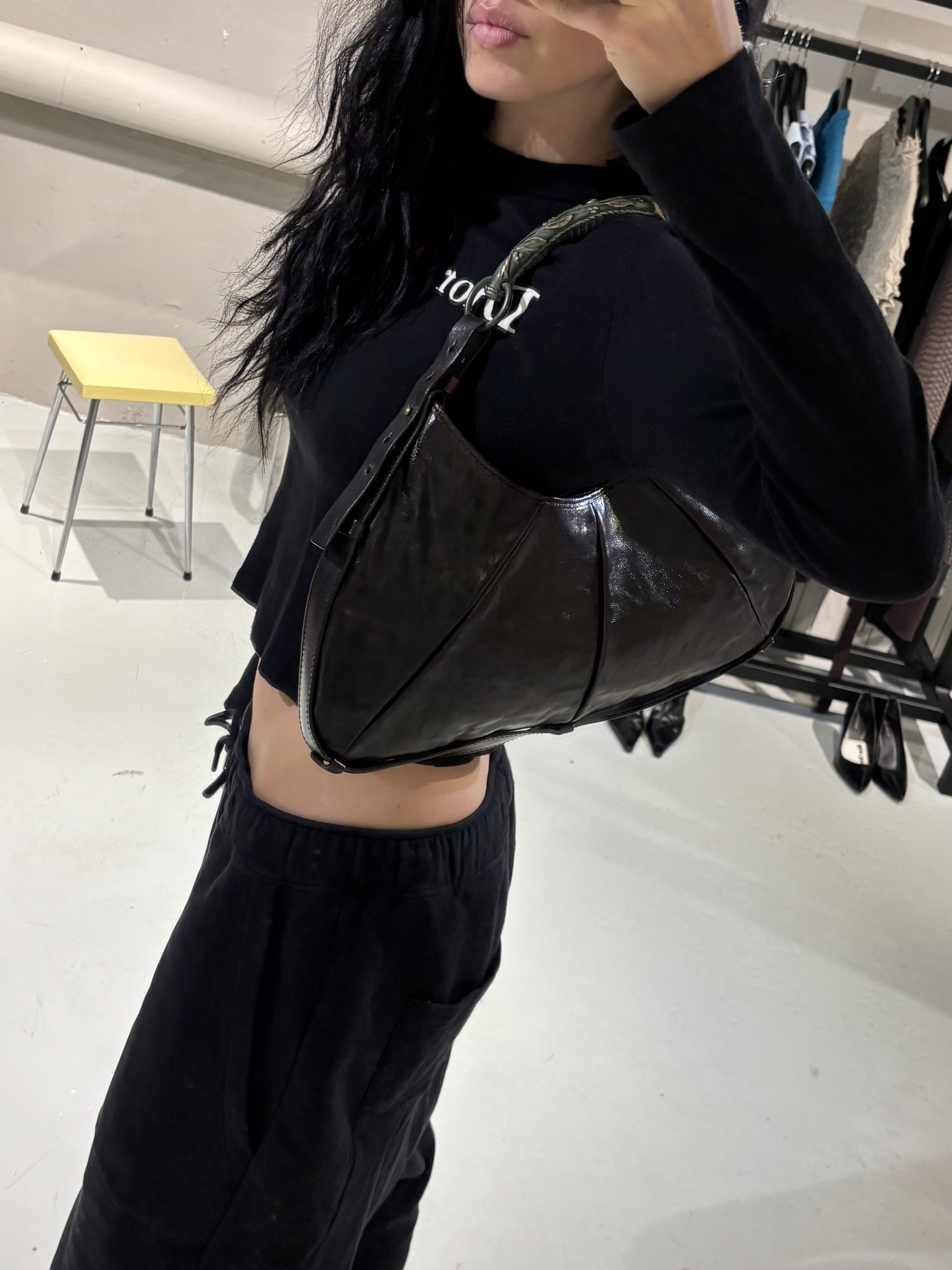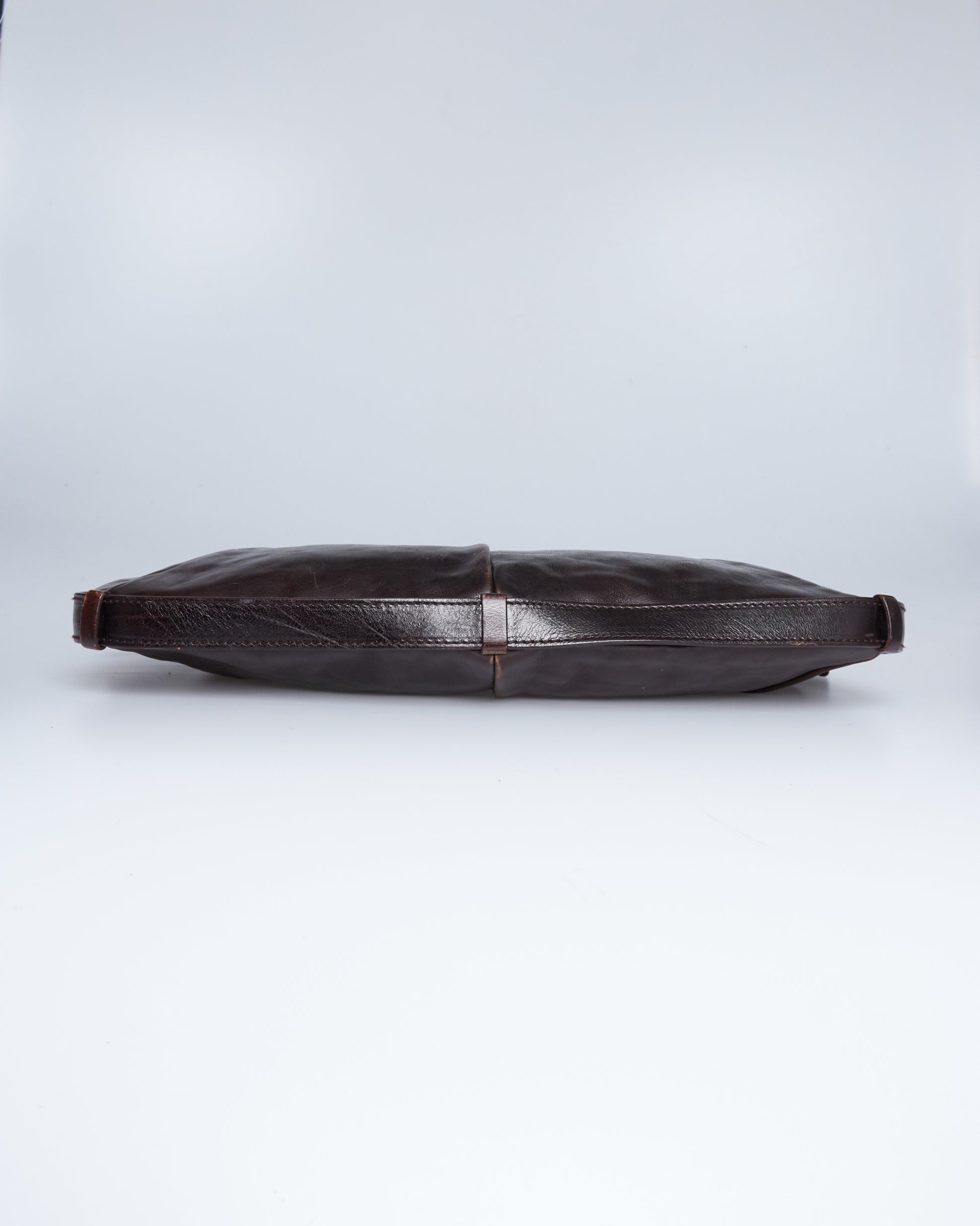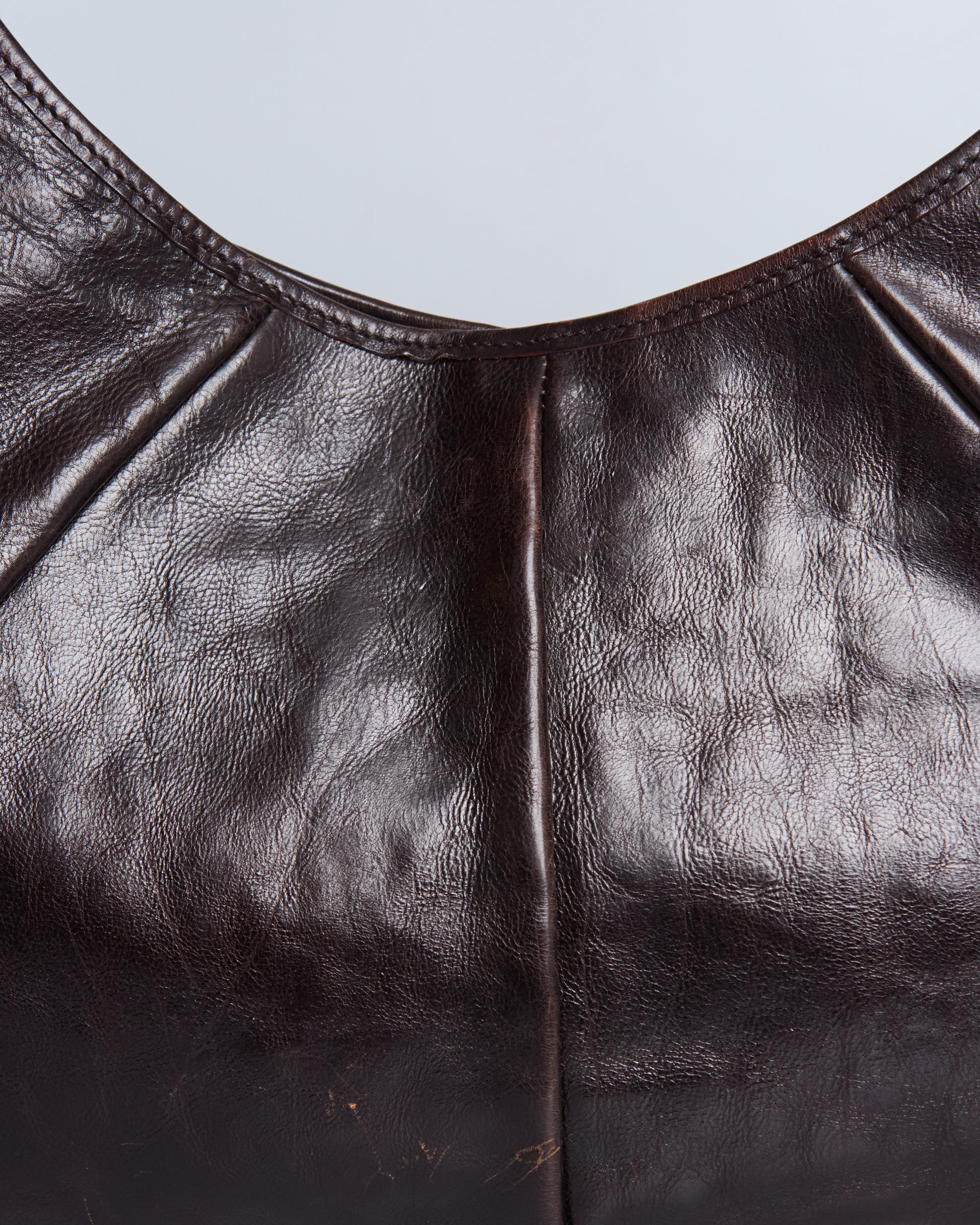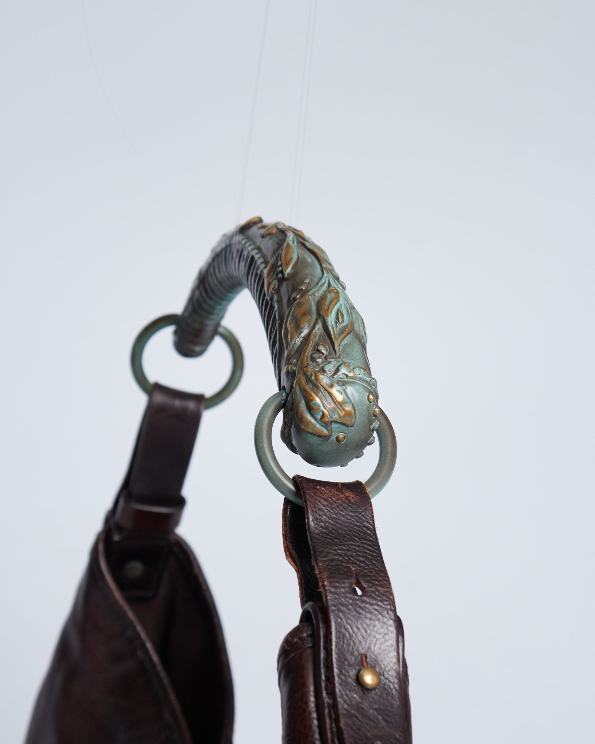 This Saint Laurent Mombasa by Tom Ford 2002 has a brown leather exterior, a horn handle with silver/blue metal hardware and silver-tone details.