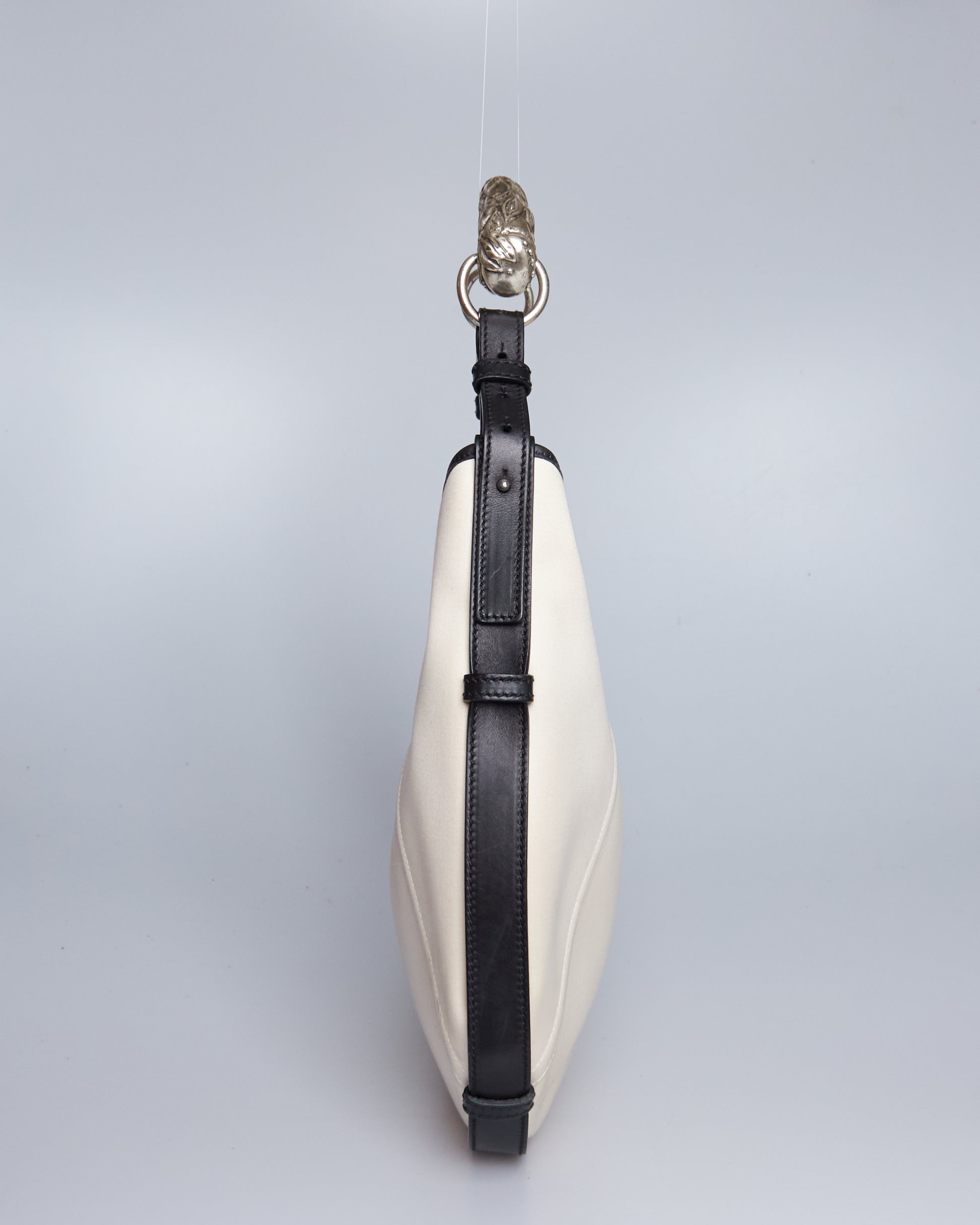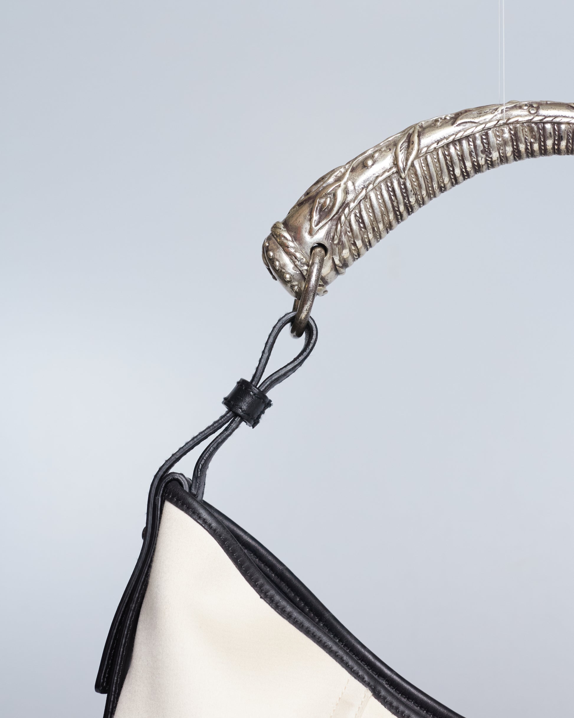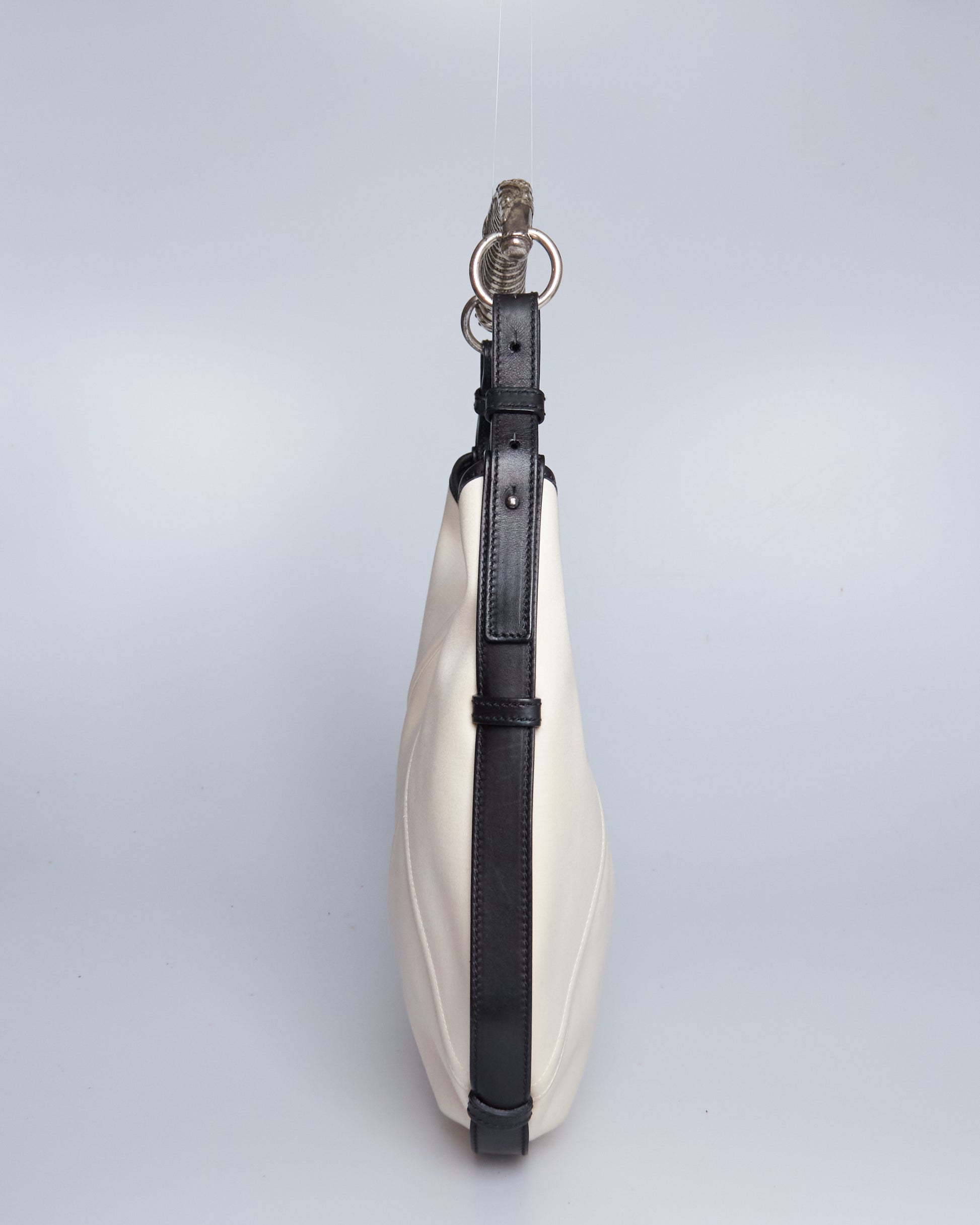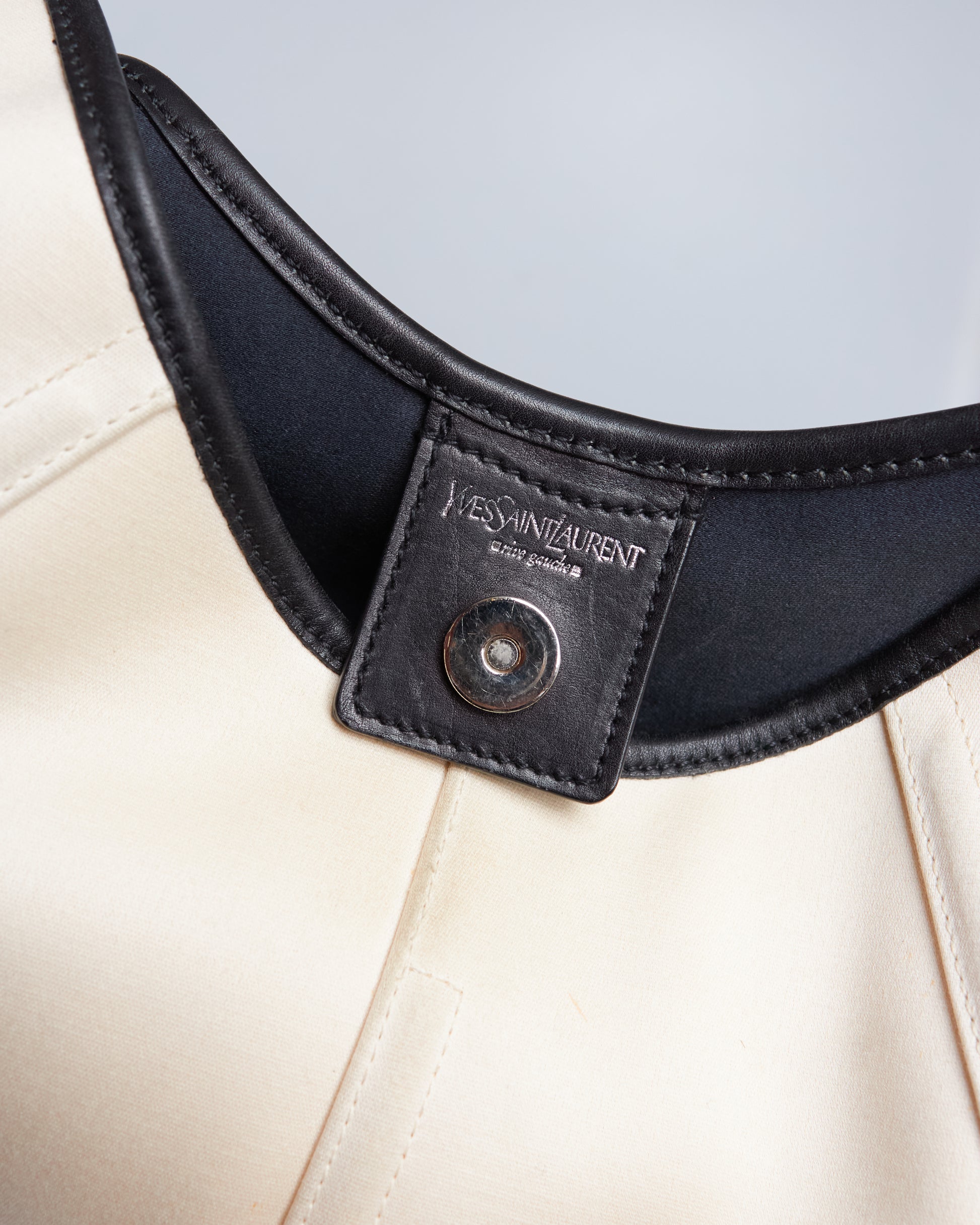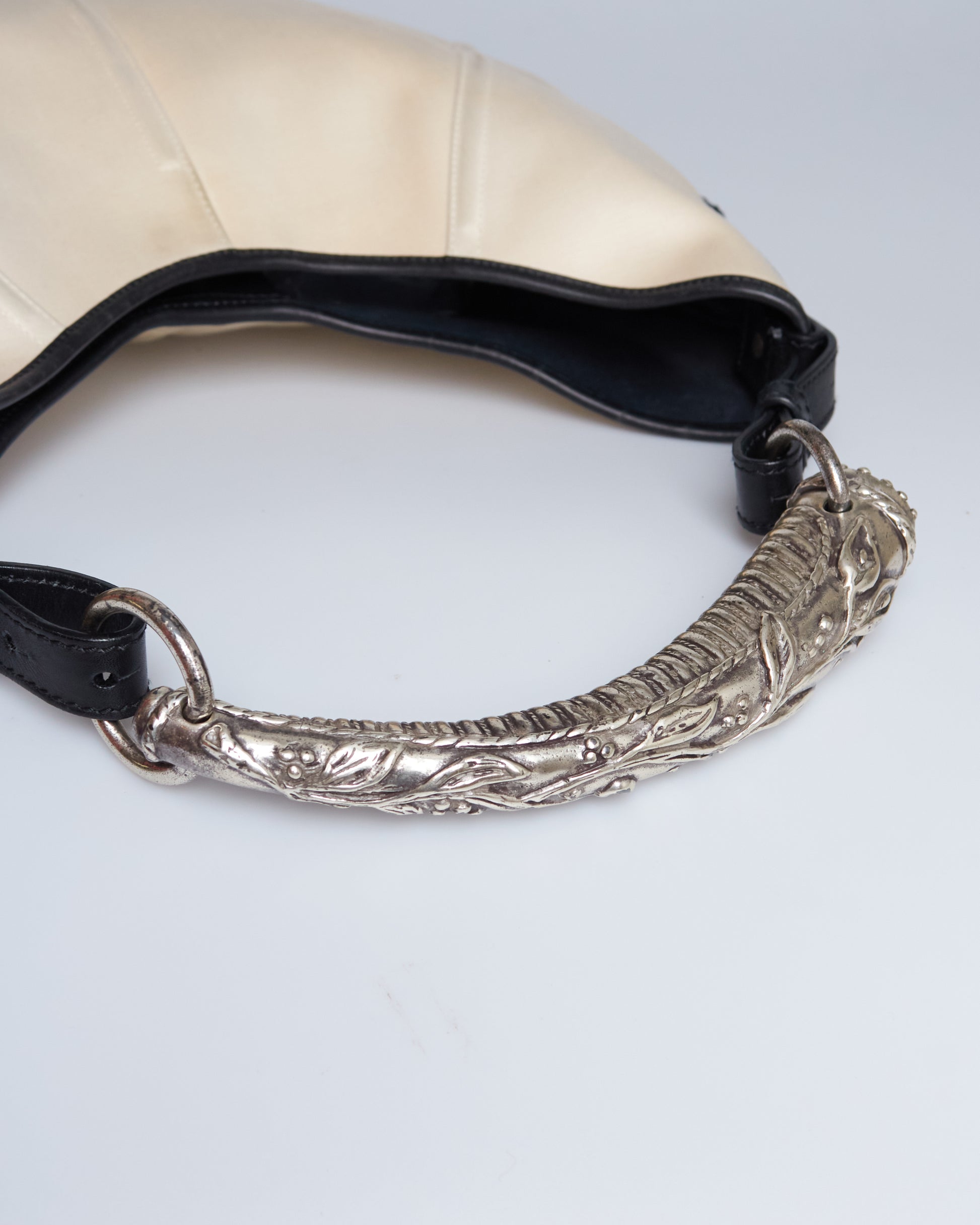 This Saint Laurent Mombasa by Tom Ford 2002 has a white cloth exterior, black leather details, a horn handle with silver metal hardware and silver-tone details.