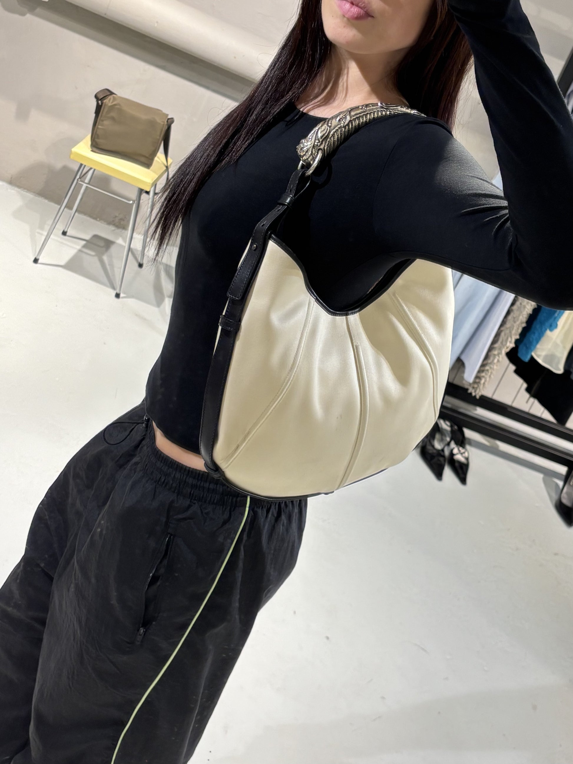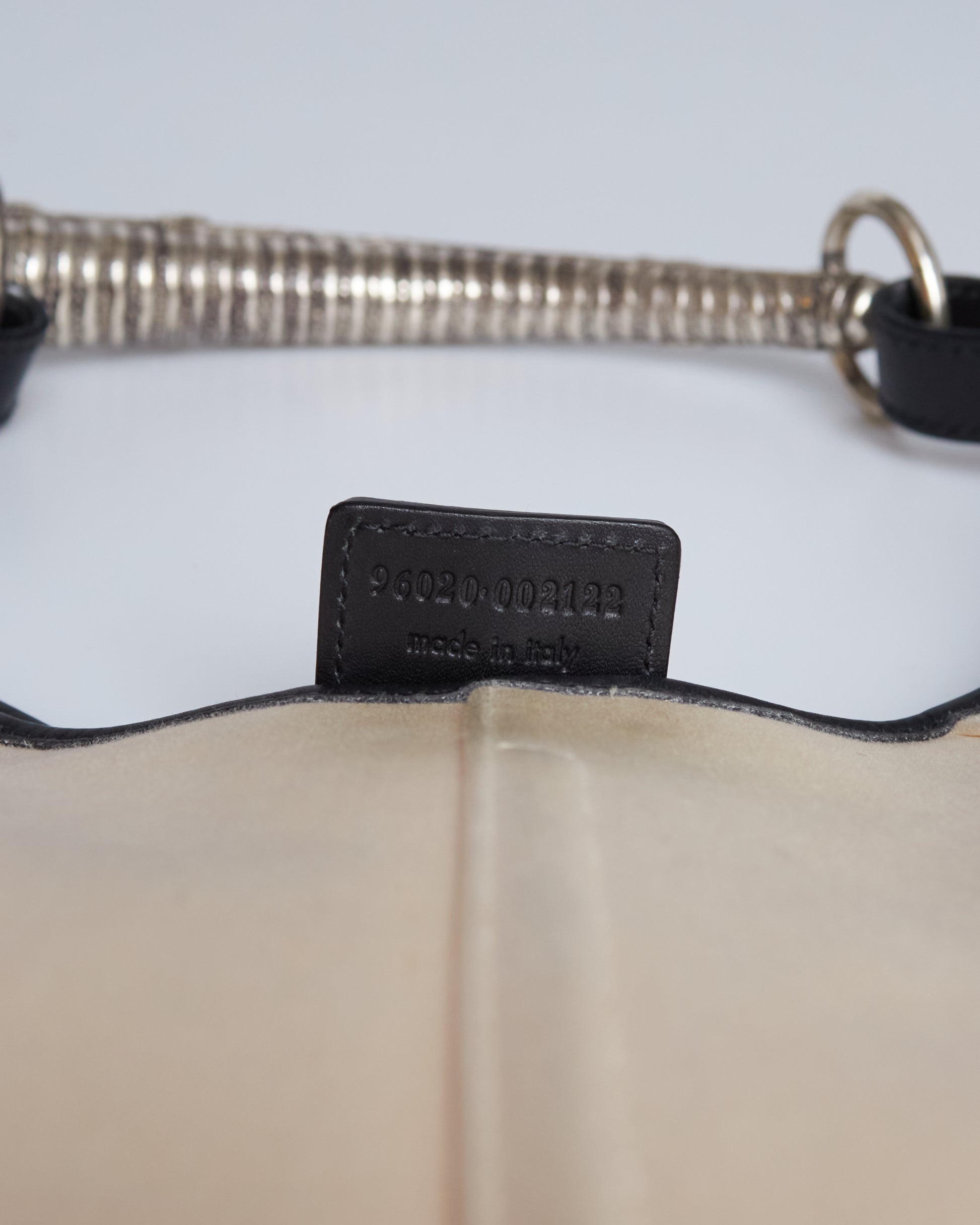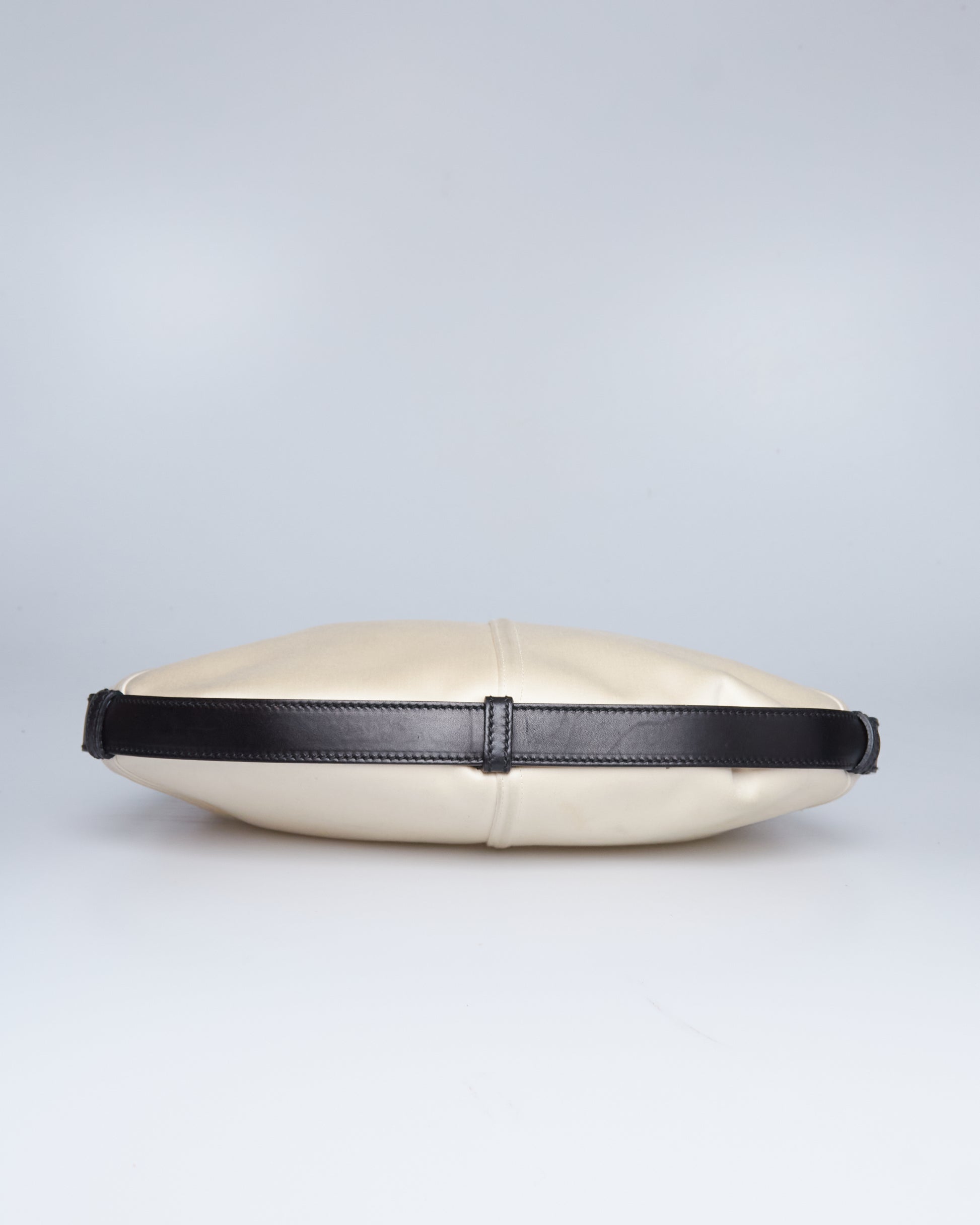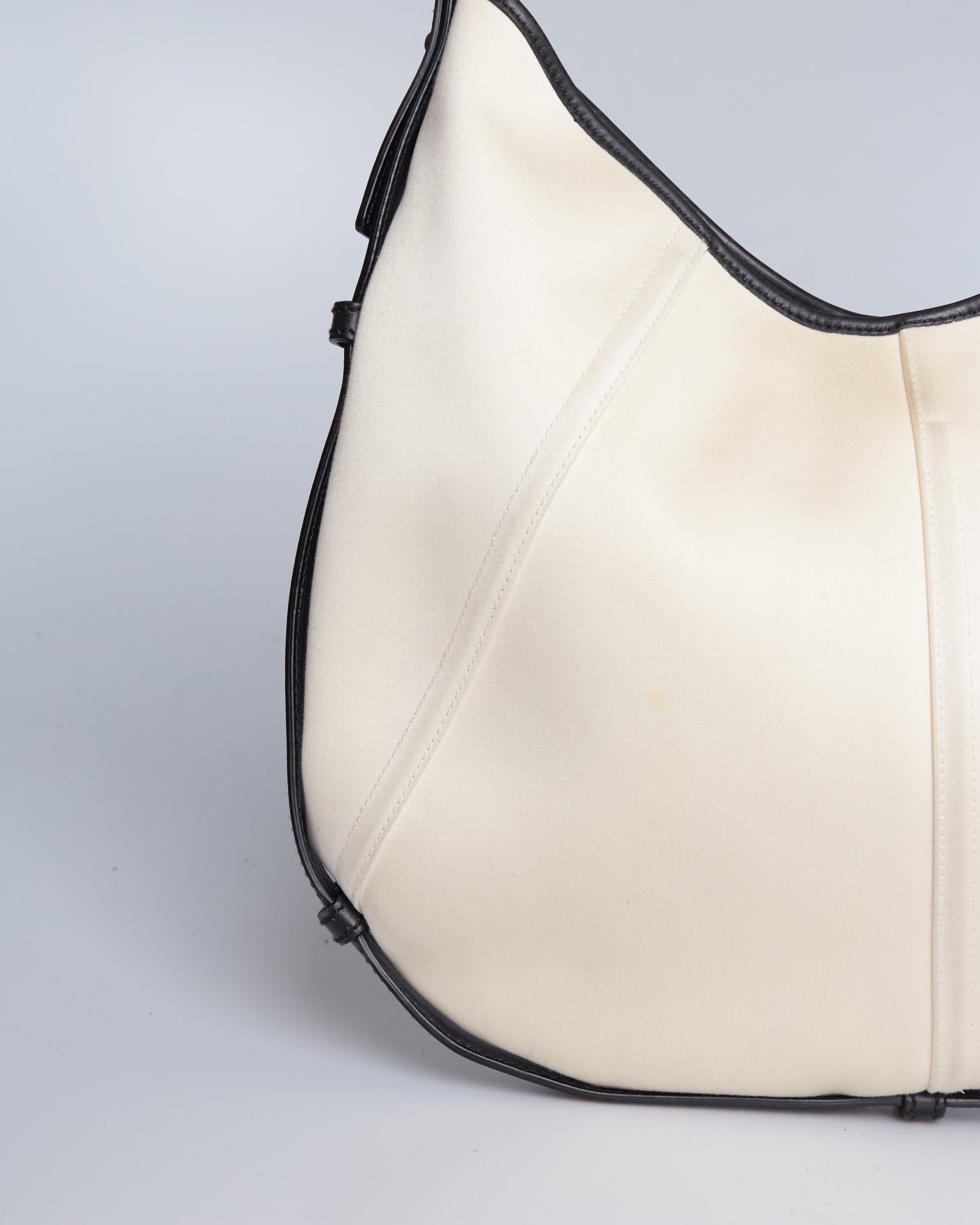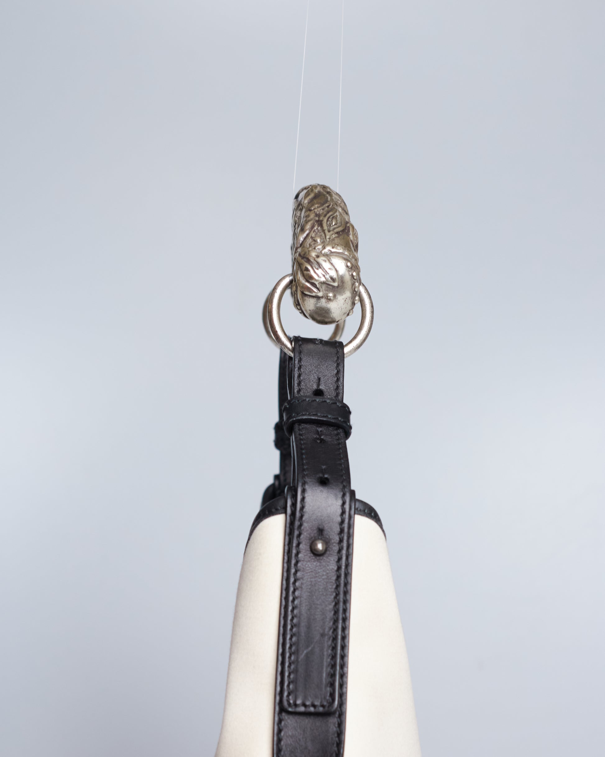 This Saint Laurent Mombasa by Tom Ford 2002 has a white cloth exterior, black leather details, a horn handle with silver metal hardware and silver-tone details.